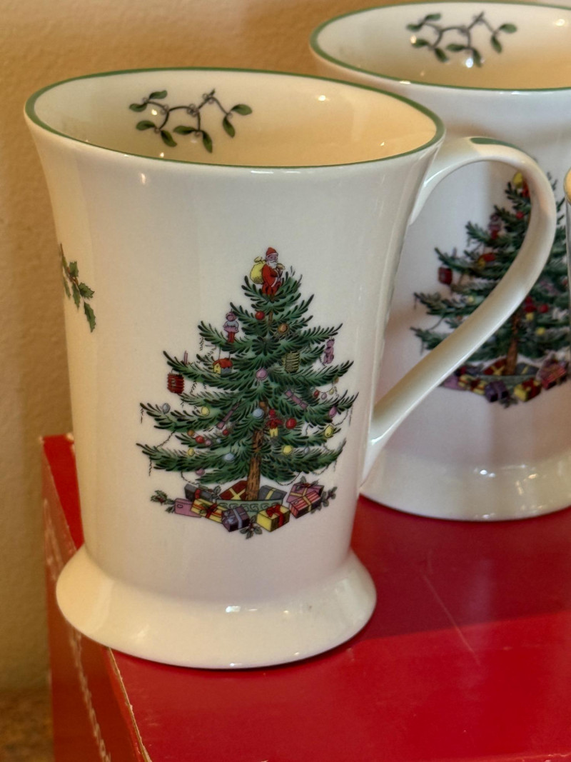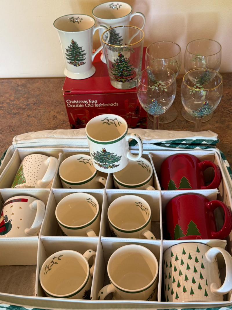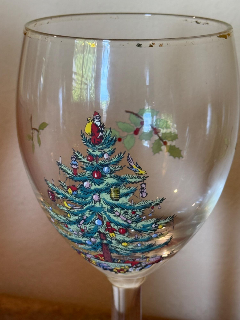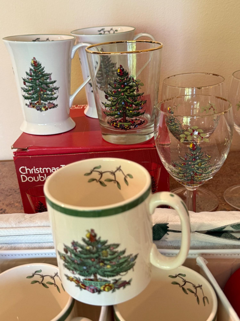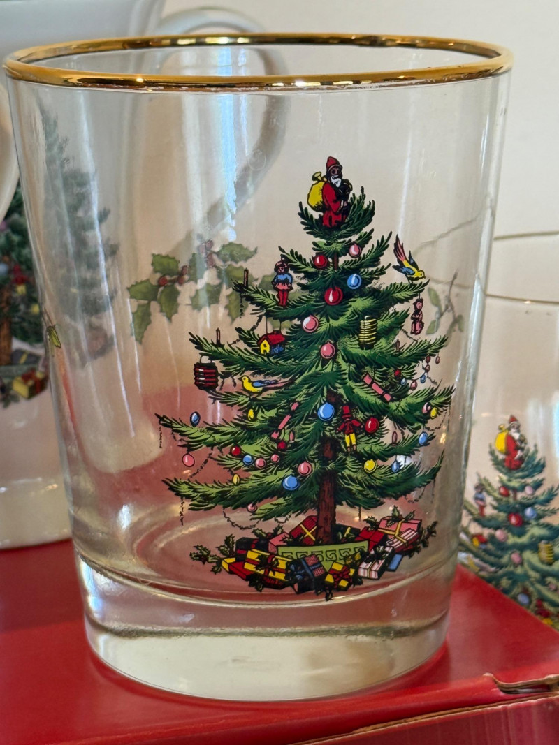 English Spode Cups & Glassware 4 Long Stem Goblets 4 Double Tree Old Fashion Glasses 5 Holiday Cups