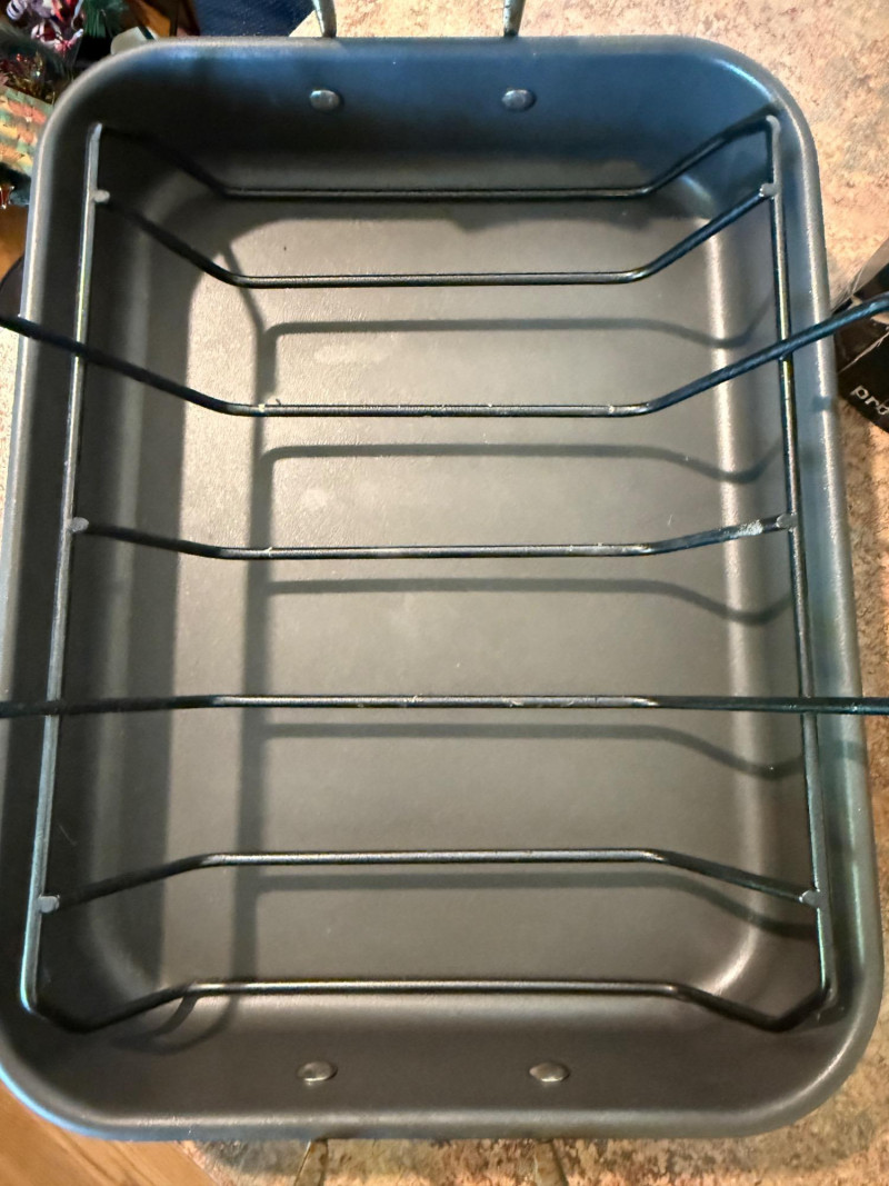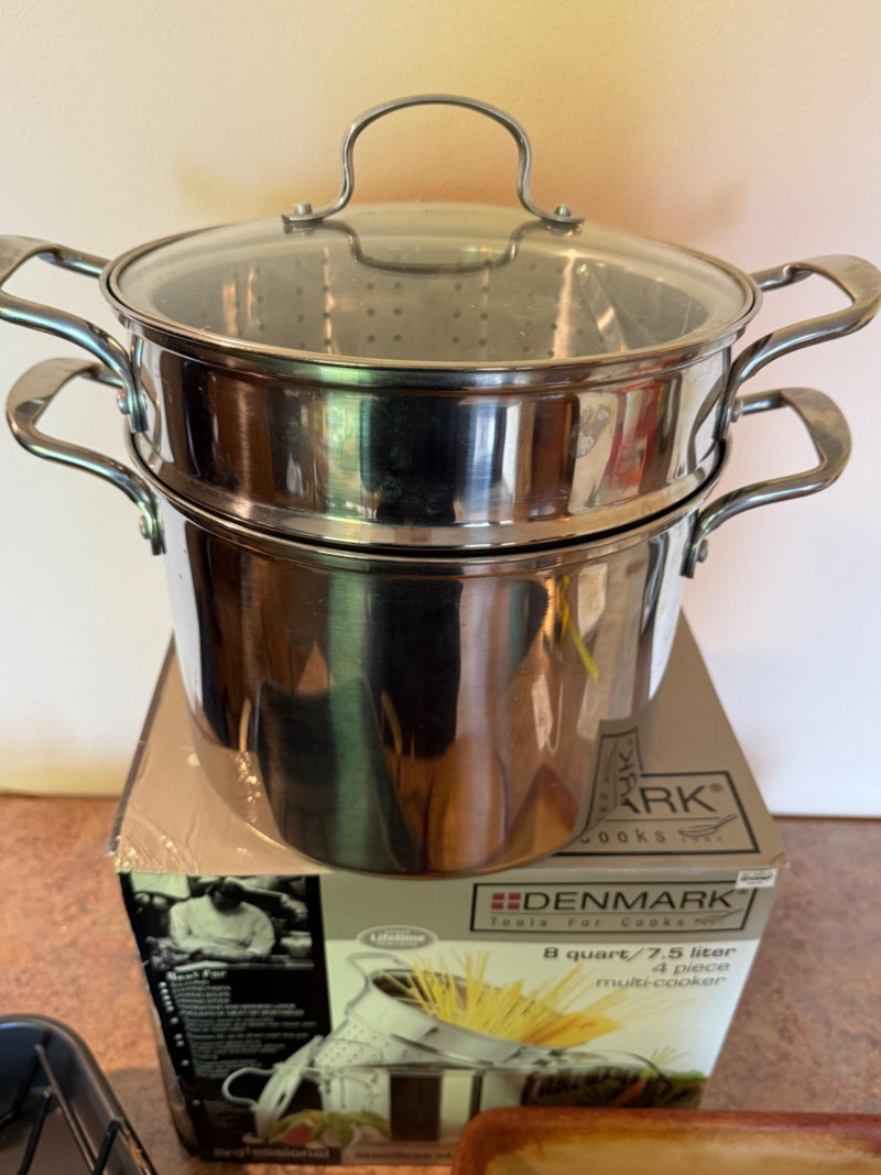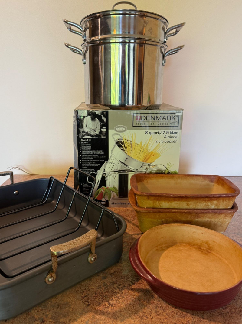 Denmark Tools For Cooks 8 qt 4 Piece Multicooker Sur la Table Aluminum Roasting Pan with heavy duty roasting rack. 8” Round Pampered Chef Cake Pan