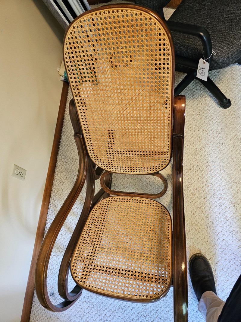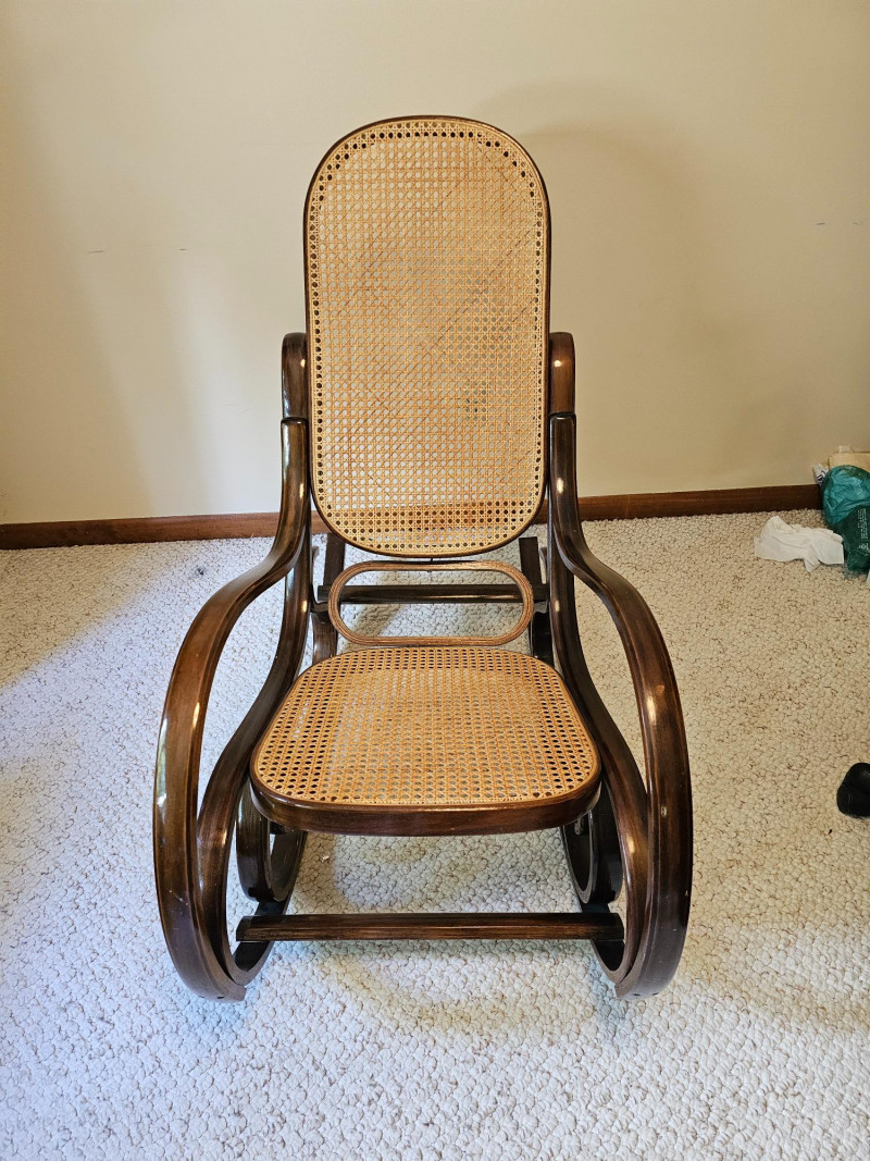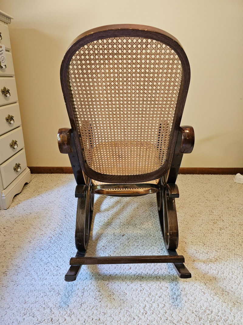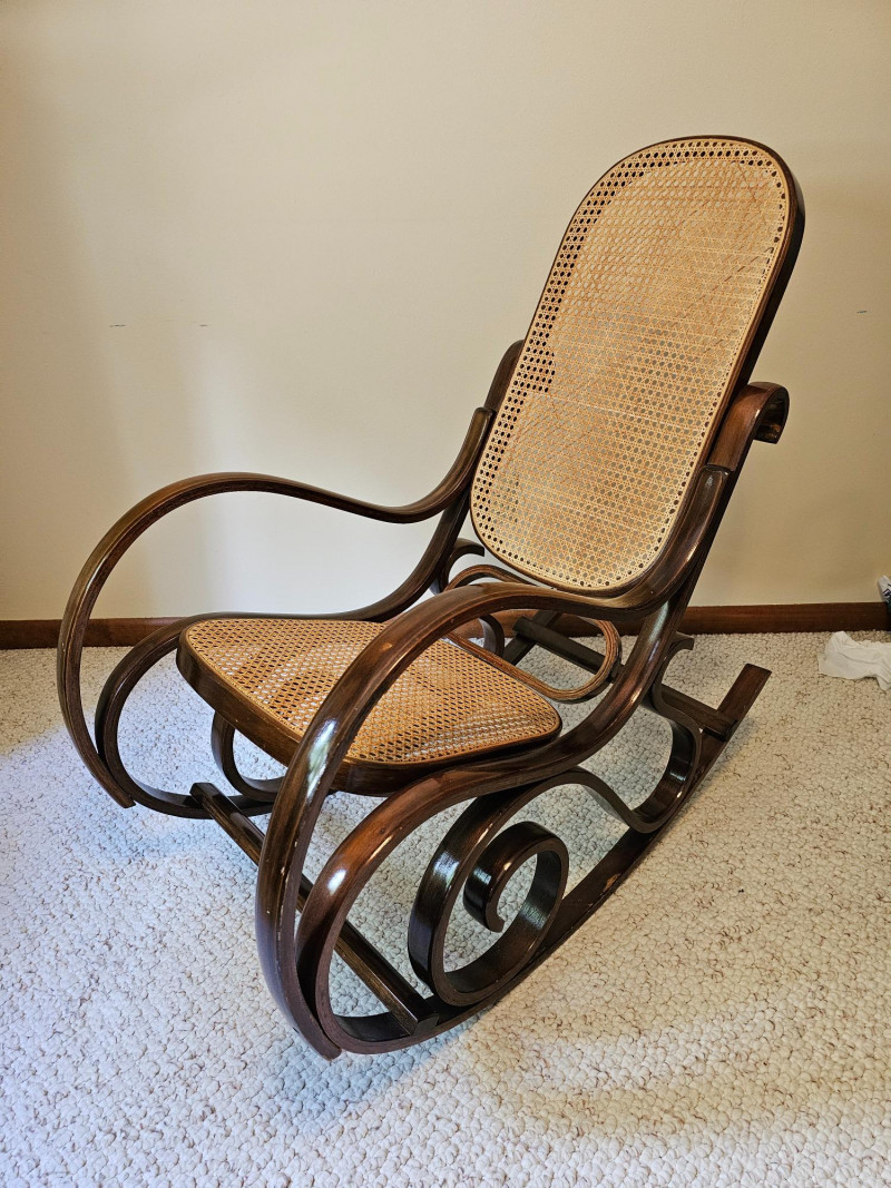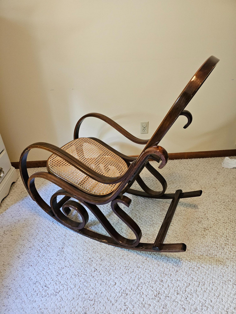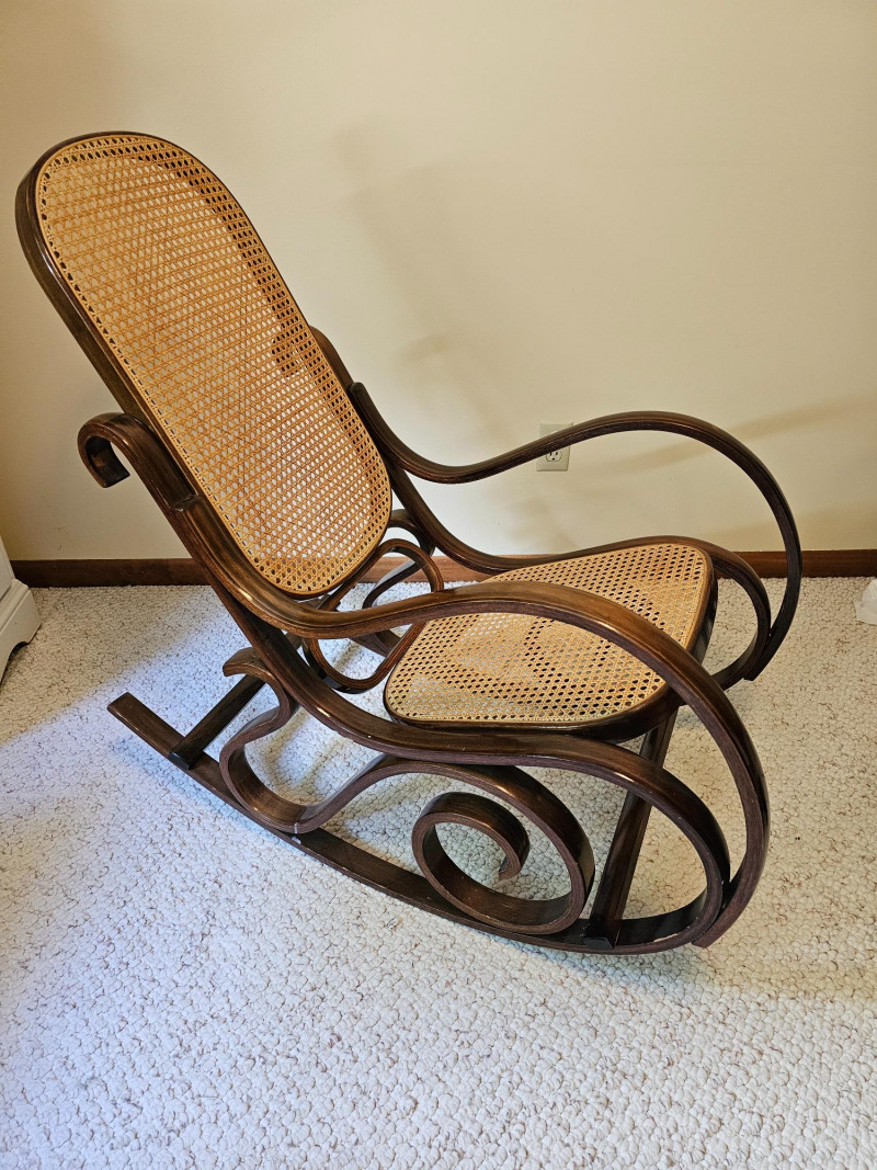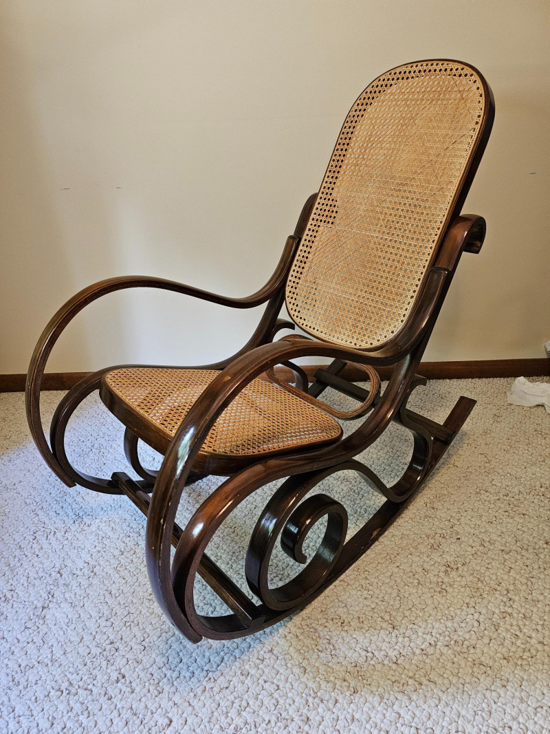 Bentwood & Woven Cane Thonet-Style Rocking Chair Comfortable chair Nice used condition (scrapes on finish in multiple places, see pics) 37.5"T x 21"W x 39"D
