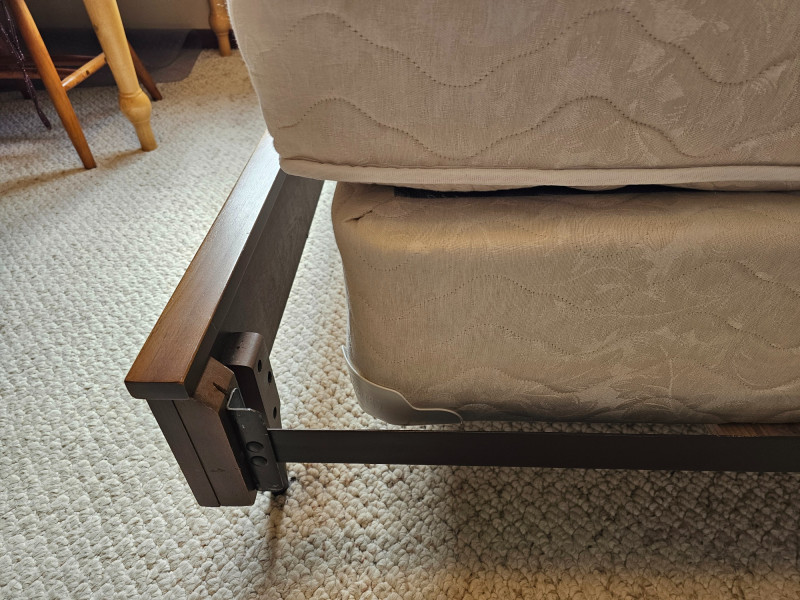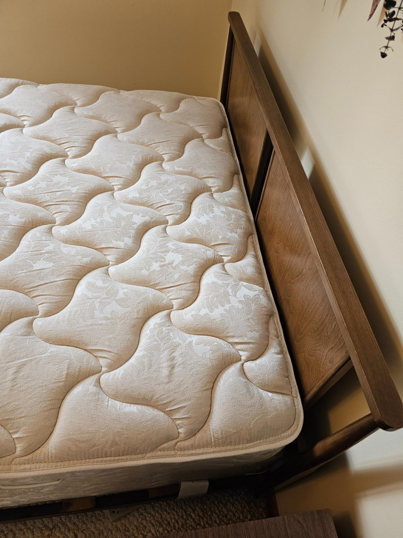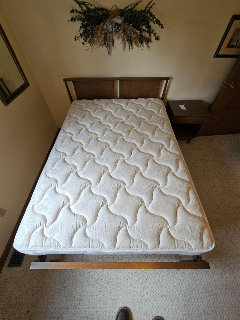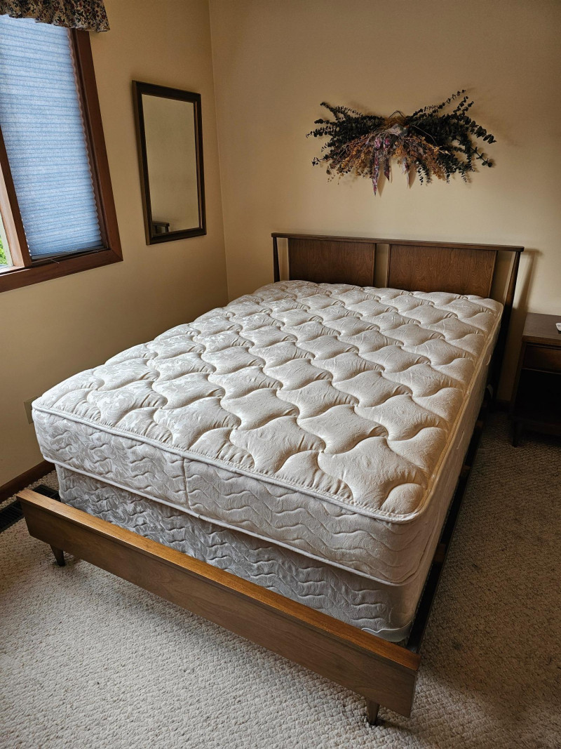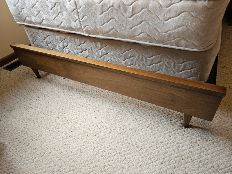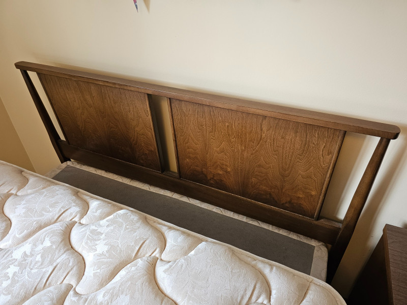 MCM Dark Walnut Finish Full-Size Bed Nice solid wood Mid Century Modern full-size bed frame, headboard, footboard, mattress and box spring Finished in dark walnut with the minimalist look of Danish furniture Box spring & mattress appear to be in good condition and unstained In nice condition! 36.5"T x 79"L x 56"W
