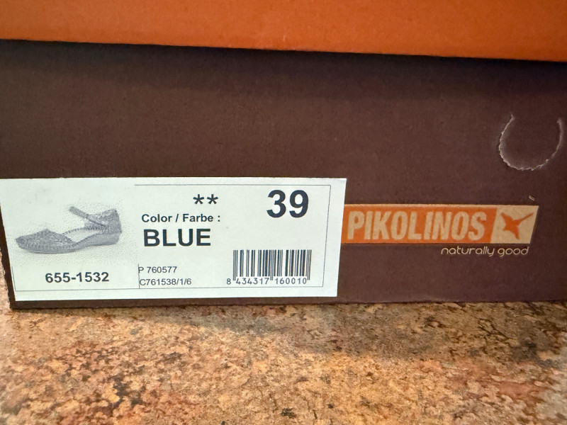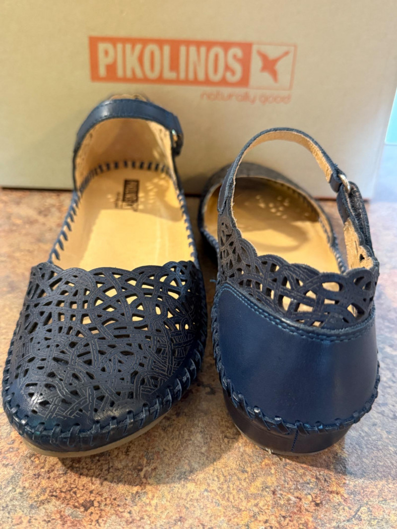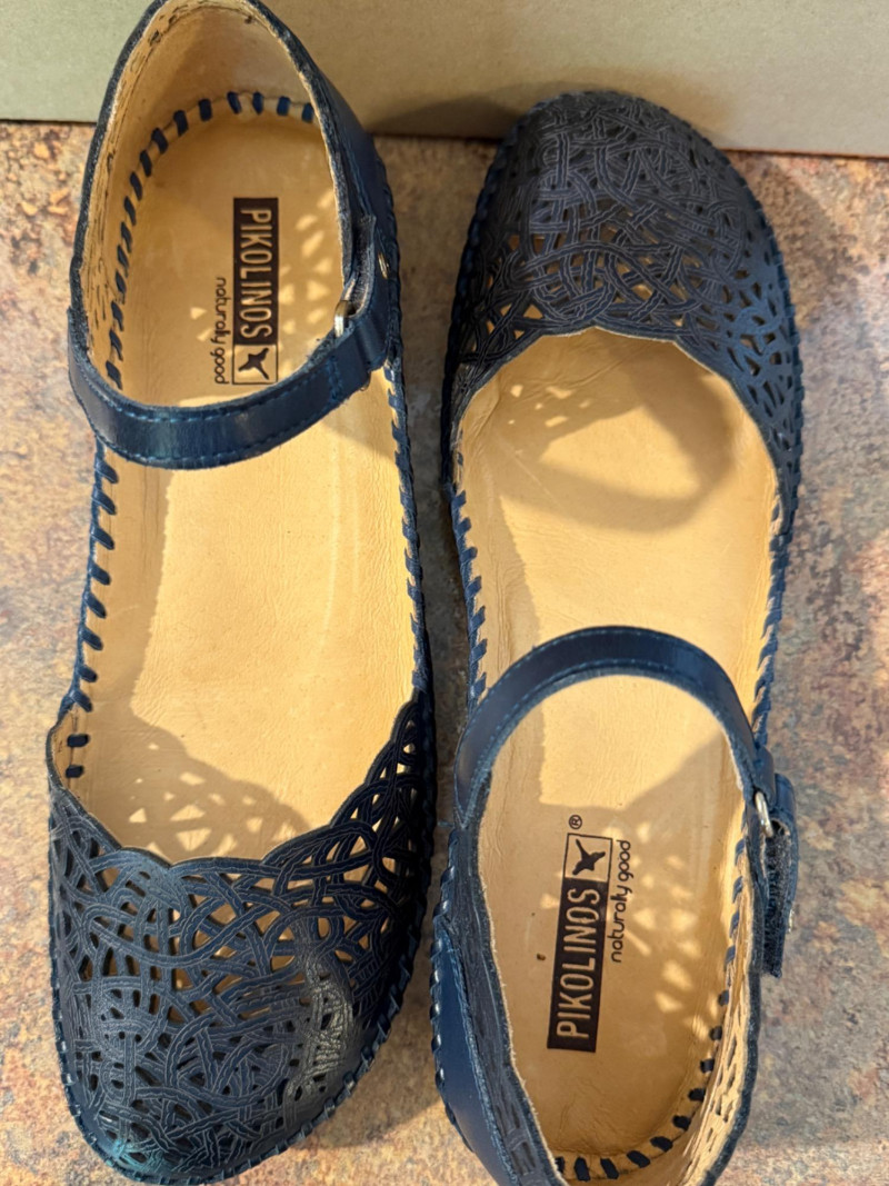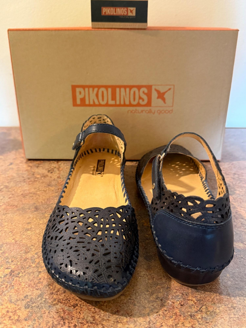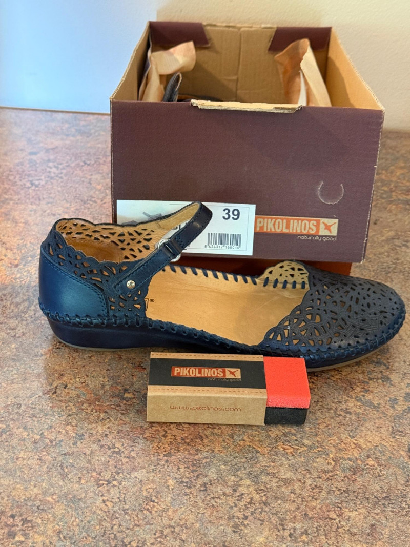 NIB Pokolinos Hand Sewn Mary Janes Size 39 Women's Puerto Vallarta Mary Jane shoe in dark blue, alongside its box and a cleaning sponge. The shoe, size 39, features a laser-cut design on the upper, an adjustable strap, and a low wedge heel. Pikolinos is known for its comfortable, hand-sewn leather shoes.