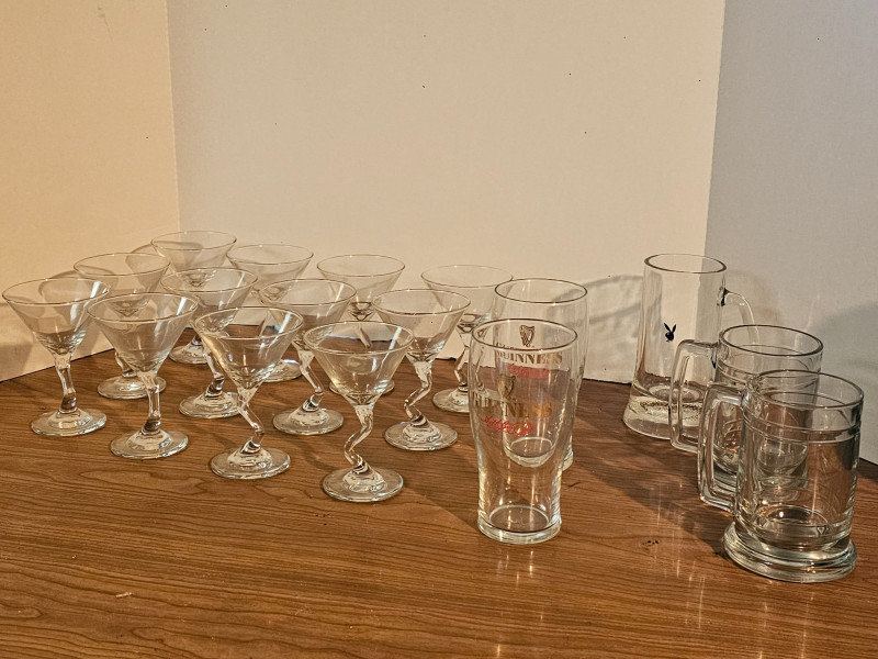 Vintage Bar Glassware (12) 5oz Z-stemmed martini glasses (2) Guiness pint glasses (2) Heavy glass beer mugs (1) Playboy beer mug