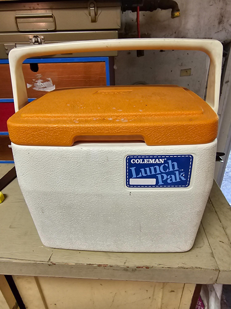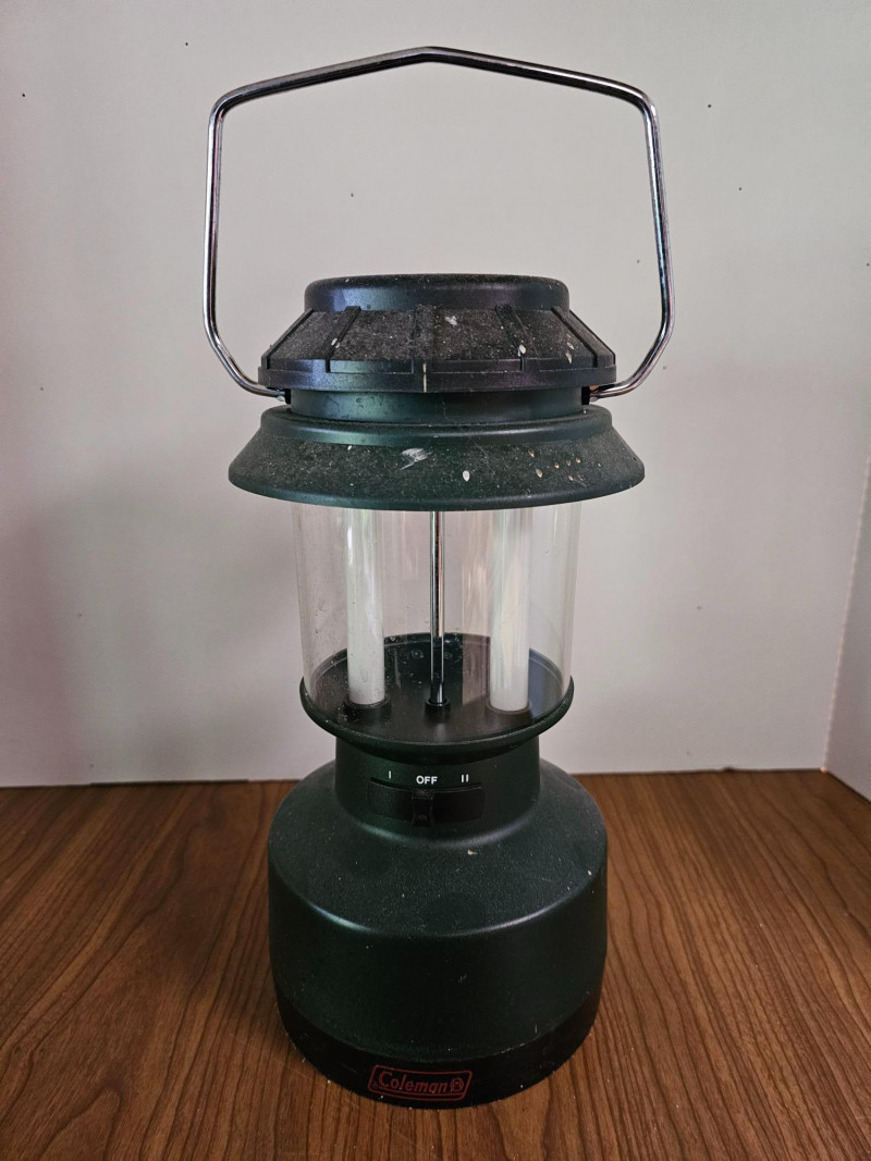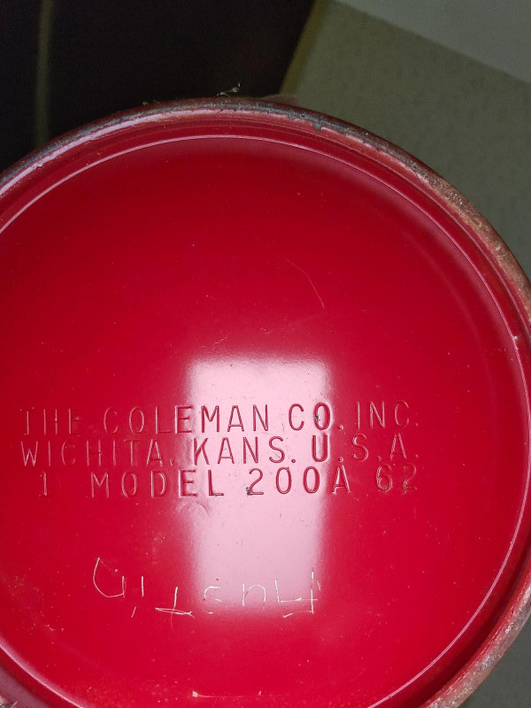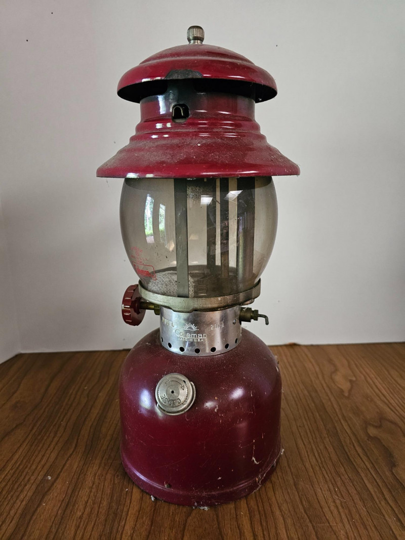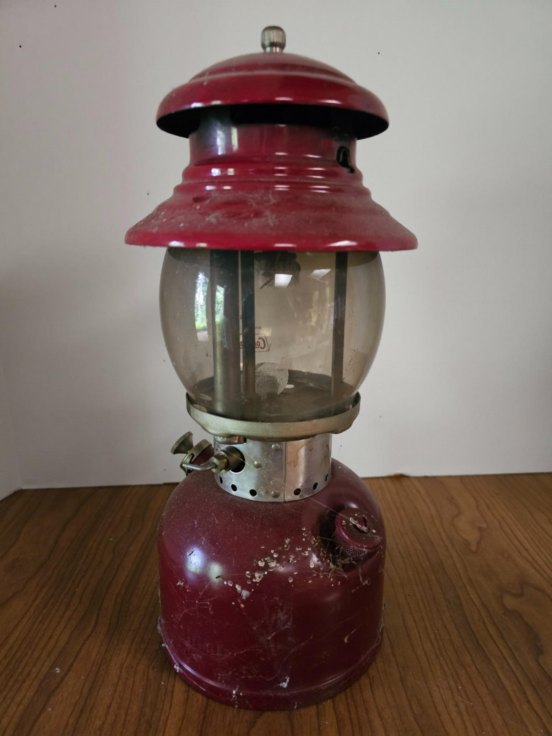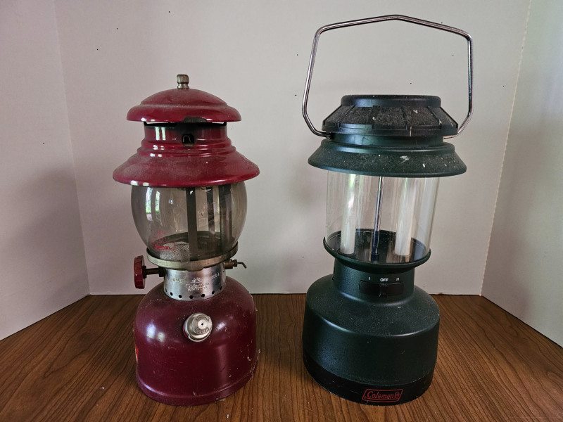 (2) Coleman Lanterns (1 Fuel & 1 Battery) & Cooler (1) Vintage Coleman 200A single-mantel lantern from 1962 (runs on white gas or Coleman stove & lantern fuel) Includes Coleman No. 0 Filter Funnel (1) Coleman fluorescent bulb battery-operated lantern Both Untested (no charging cord for the green Coleman lantern) (1) Vintage Coleman Lunch Pak Cooler - 9"T x 11"W x 8"D