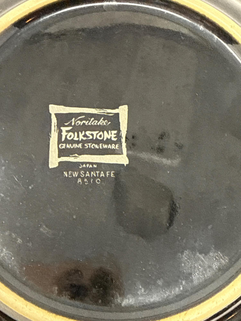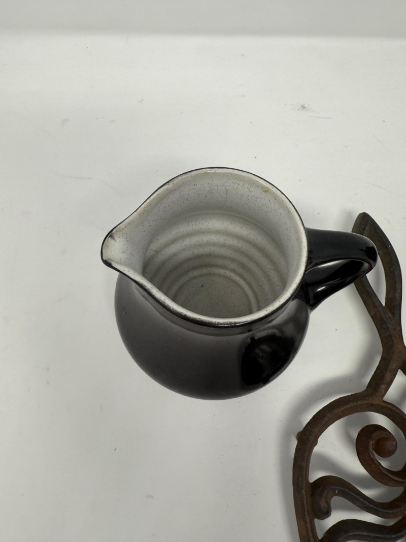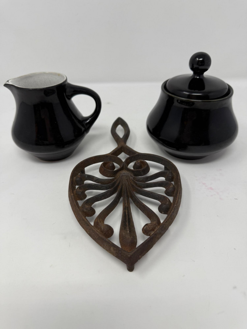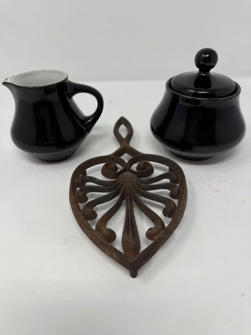 Noritake Folkstone Original Stoneware Cream & Sugar Set and 8” bowl. Vintage Cast Iron Heart Trivet