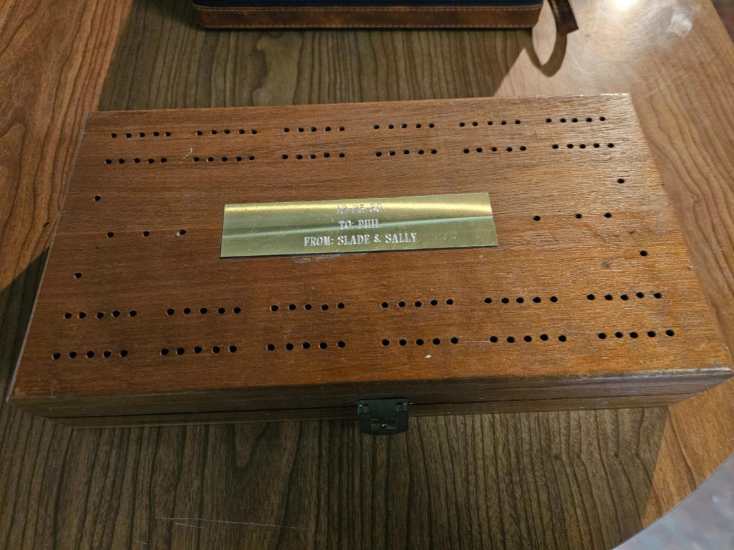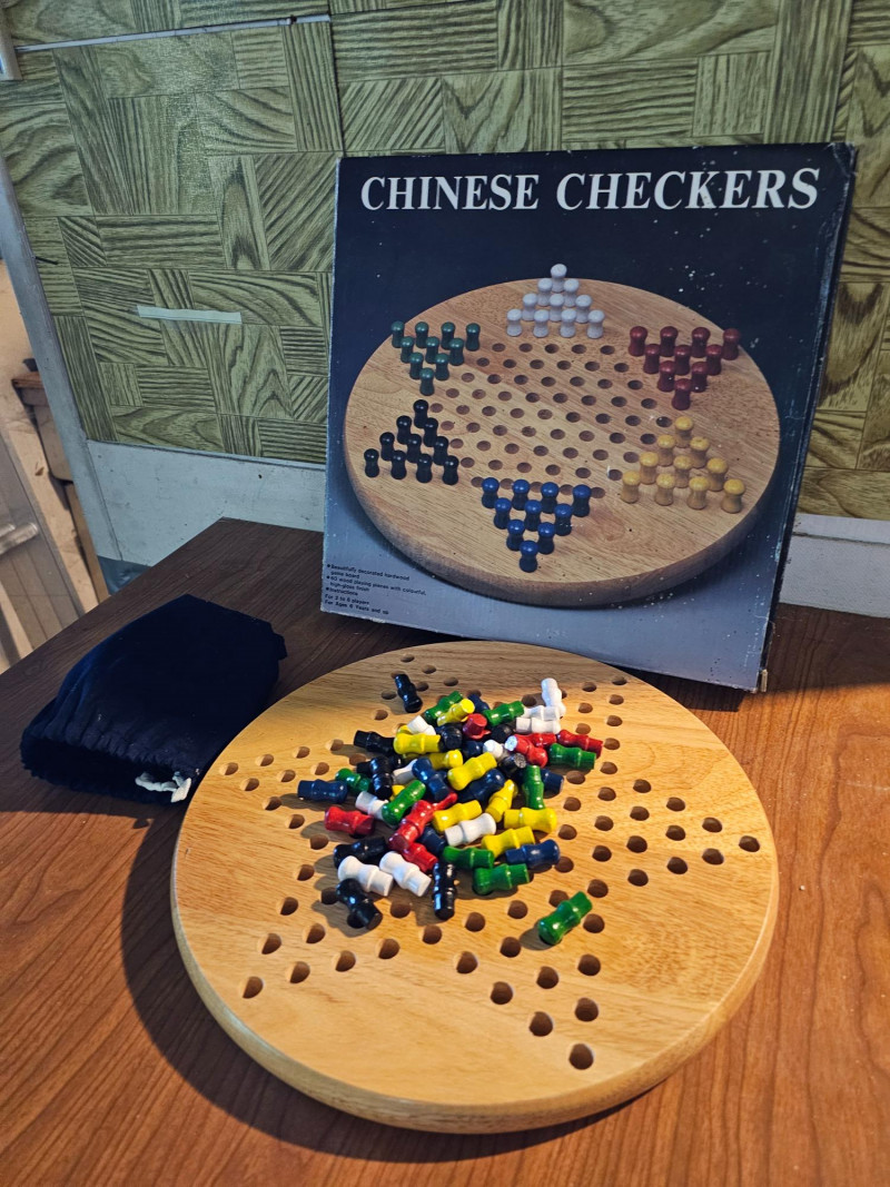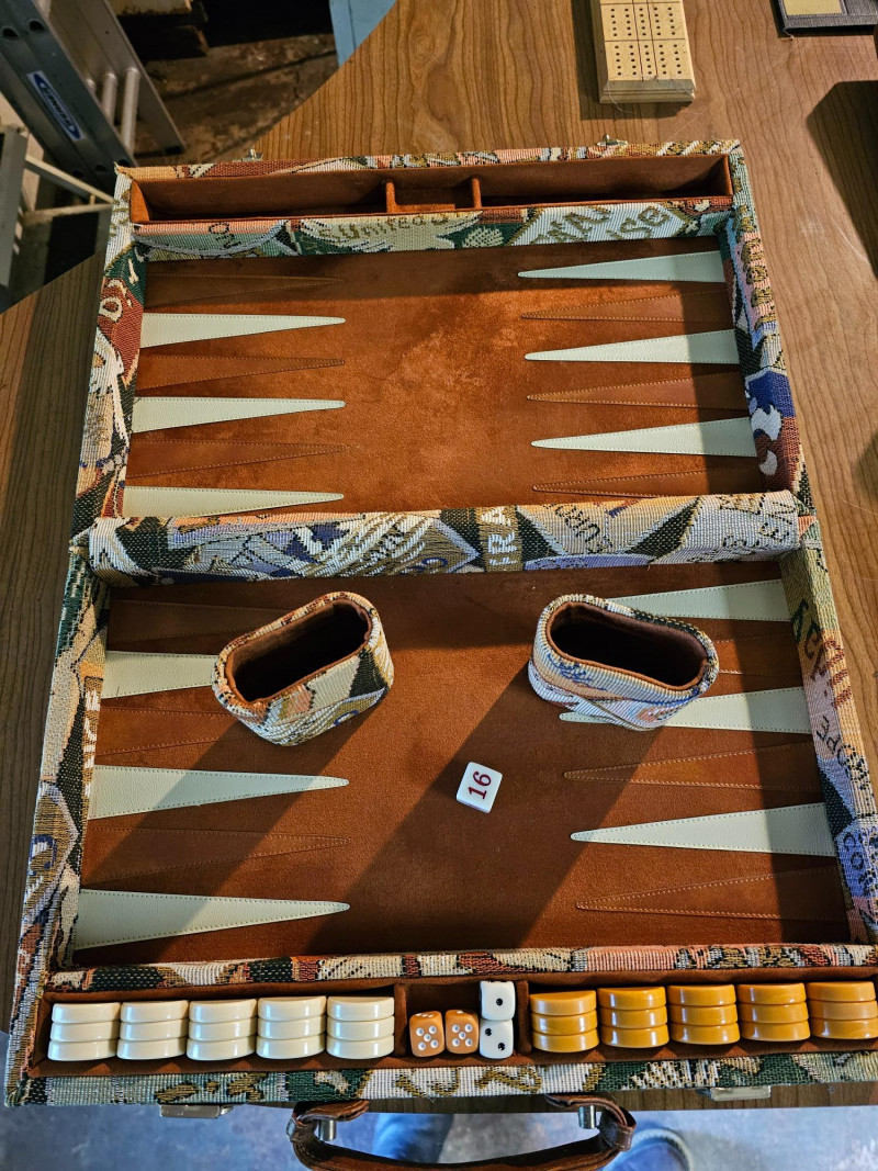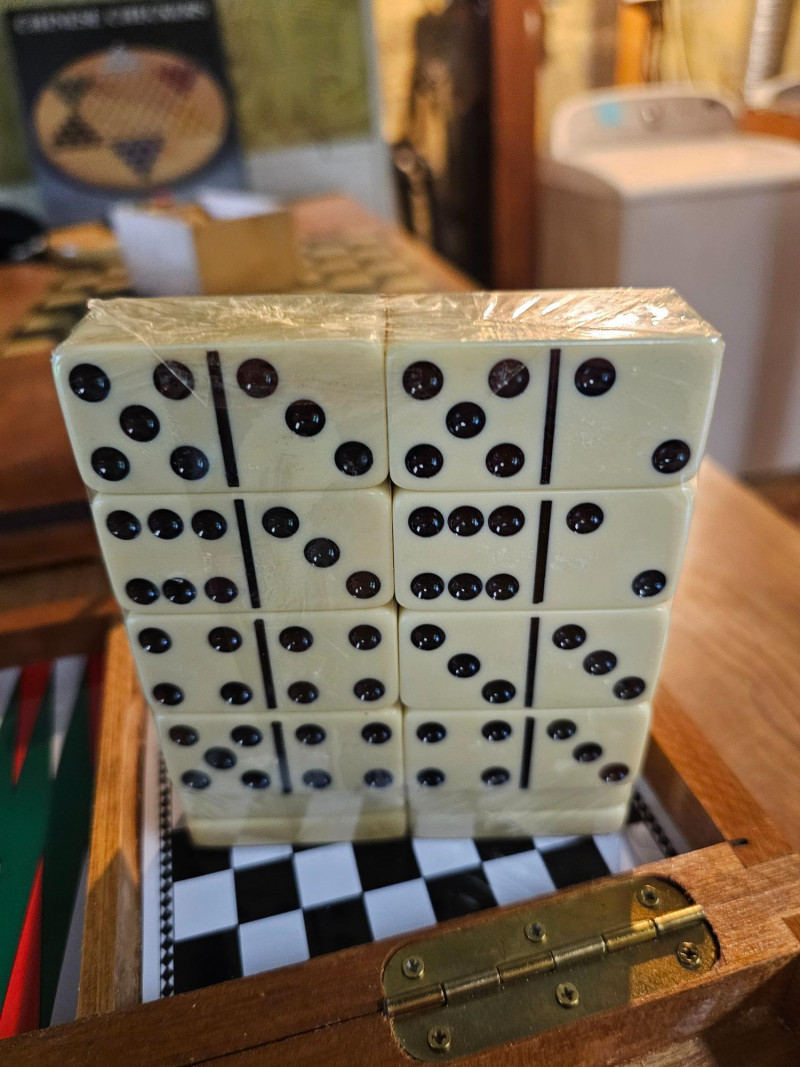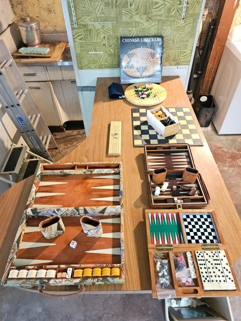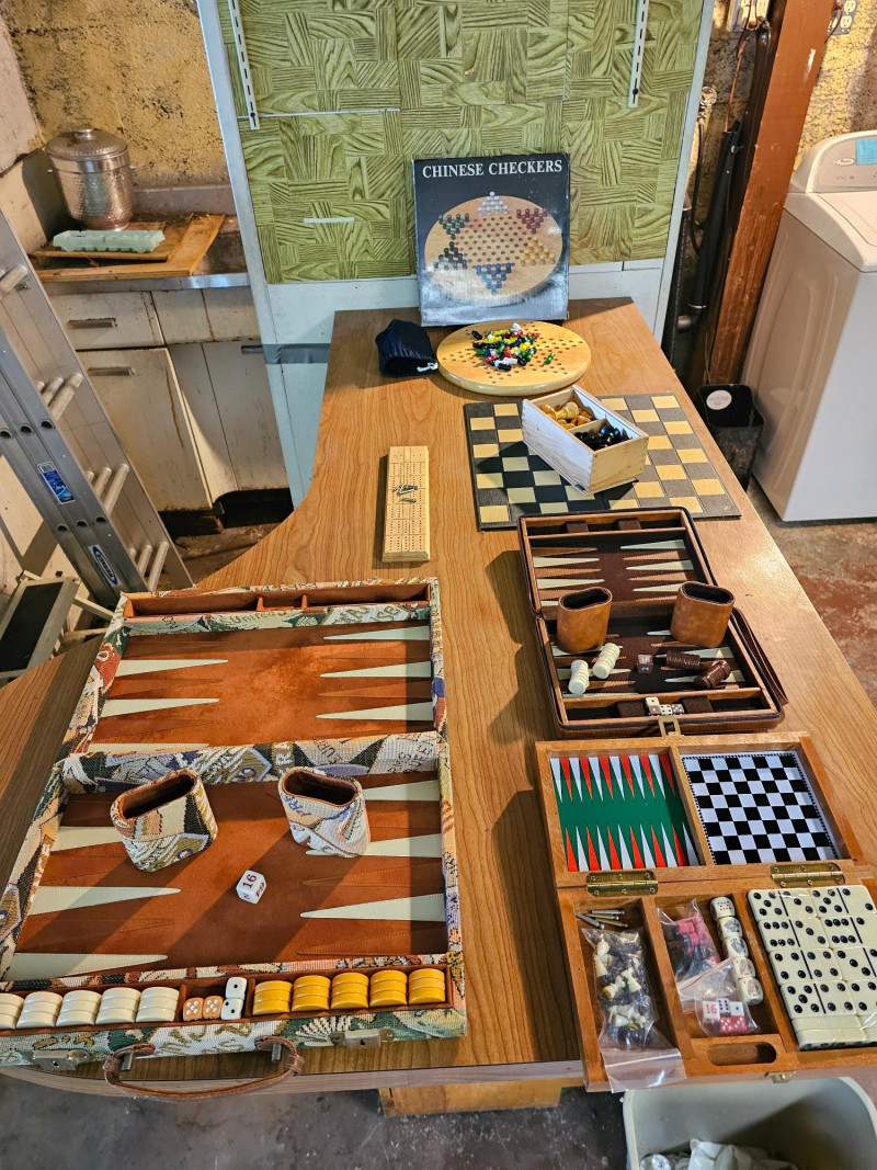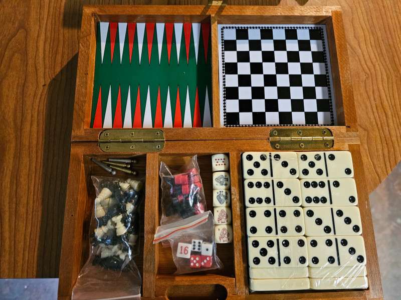 Vintage Travel Games (1) Briefcase Backgammon (1) Smaller Zipper Pouch Backgammon (1) Vintage Travel Game Compendium (checkers, chess, backgammon, dominoes, cribbage) in a wooden case dated 1980 (appears brand new and never used) (1) Chess board & pieces (1) Vintage Cribbage Board & Metal Pegs (1) Chinese Checkers & Plastic Pegs All appears to be in great shape, completeness unknown