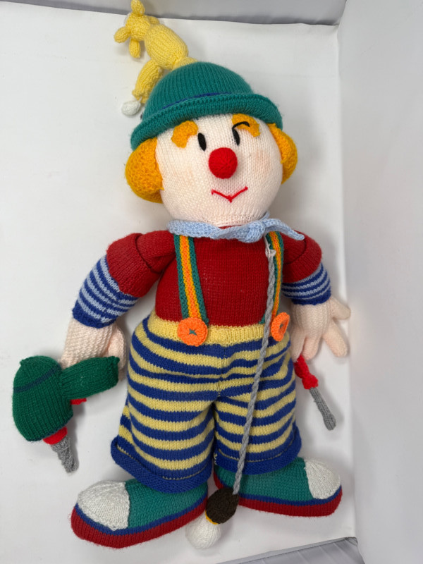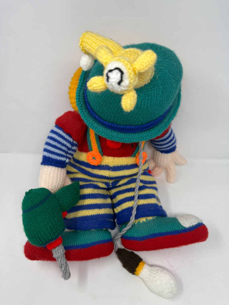 21" Knitted Tool Clown with drill in one hand and screwdriver in the other. What appears to be a lightbulb hanging around it's neck with a blue bandana. Pant legs roll partially up. Really unique! Primitive Rocking Chair 13”x22” This clown has the power and hand tools!
