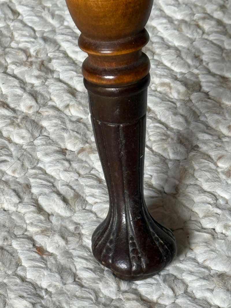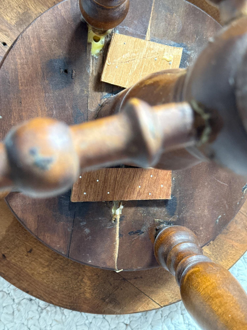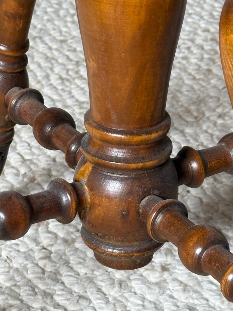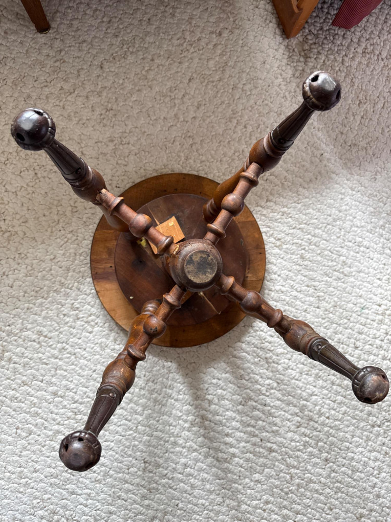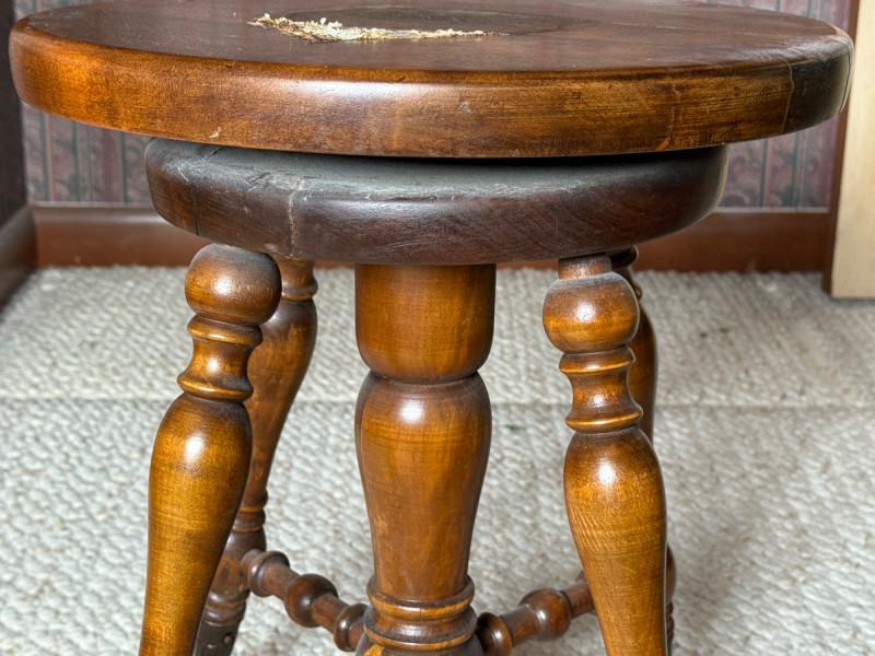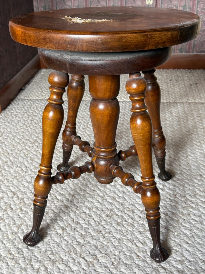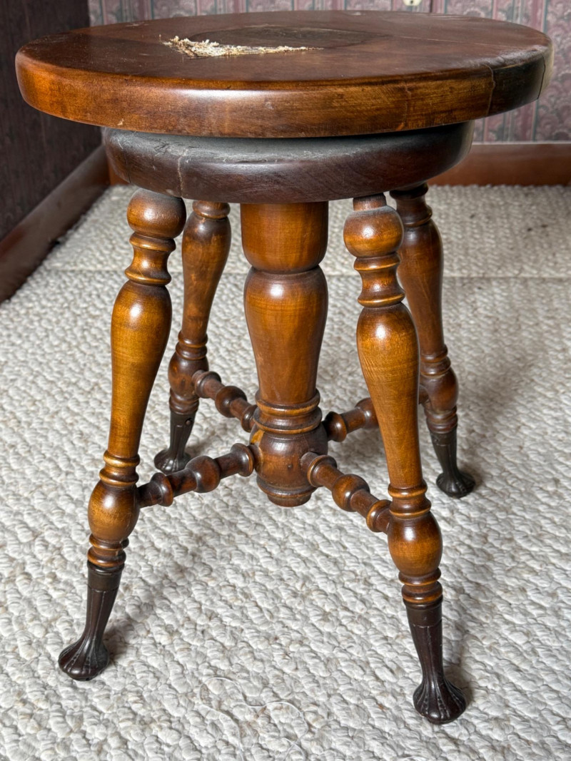 W Dougherty Antique Claw Foot Swivel Piano Stool 14.25” diameter seat and 18” tall with cast iron feet. May have been used as a plant stand. Paper like material adhered to seat. Appears to come off easily. Previous repairs noted. See pics
