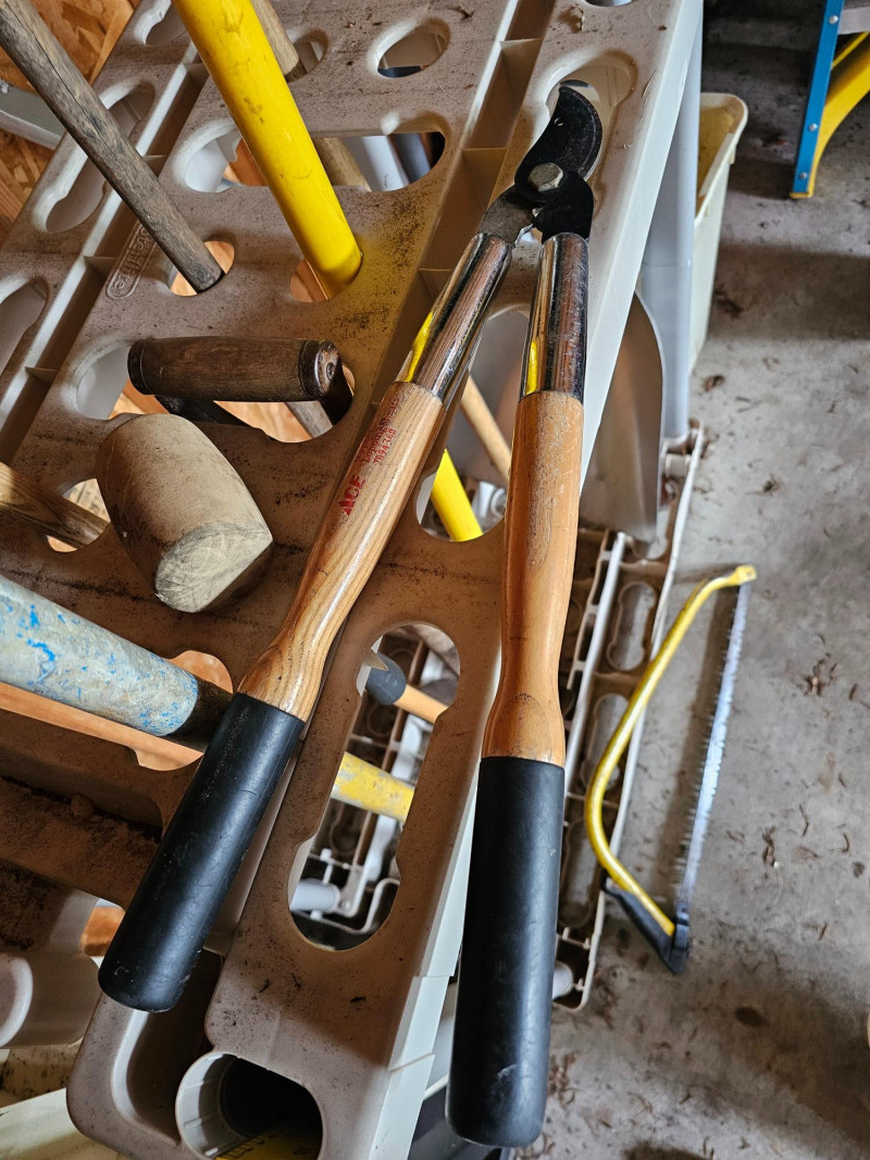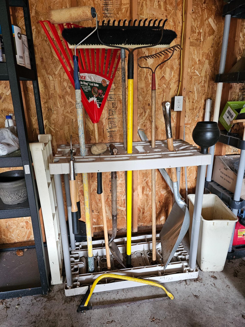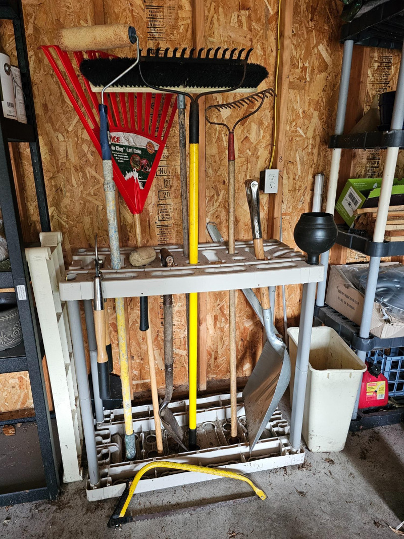 Plastic Garden Tool Caddy With 10 Tools Organize your garage or shed with this tool caddy that will hold up to 33 handled lawn tools Includes short shovel, manure shovel, Leaf rake, 2 rakes, shop brooms, pruners, bow saw and 12" roller handle Caddy is 36"T x 36"W x 18"D