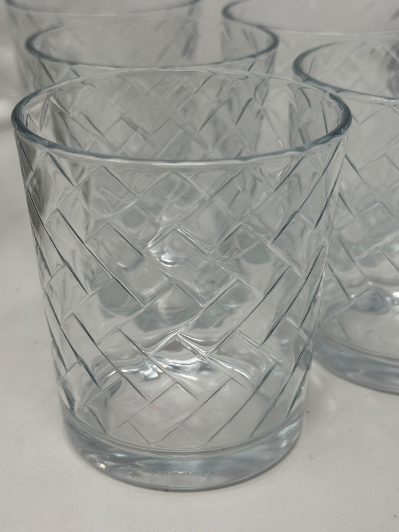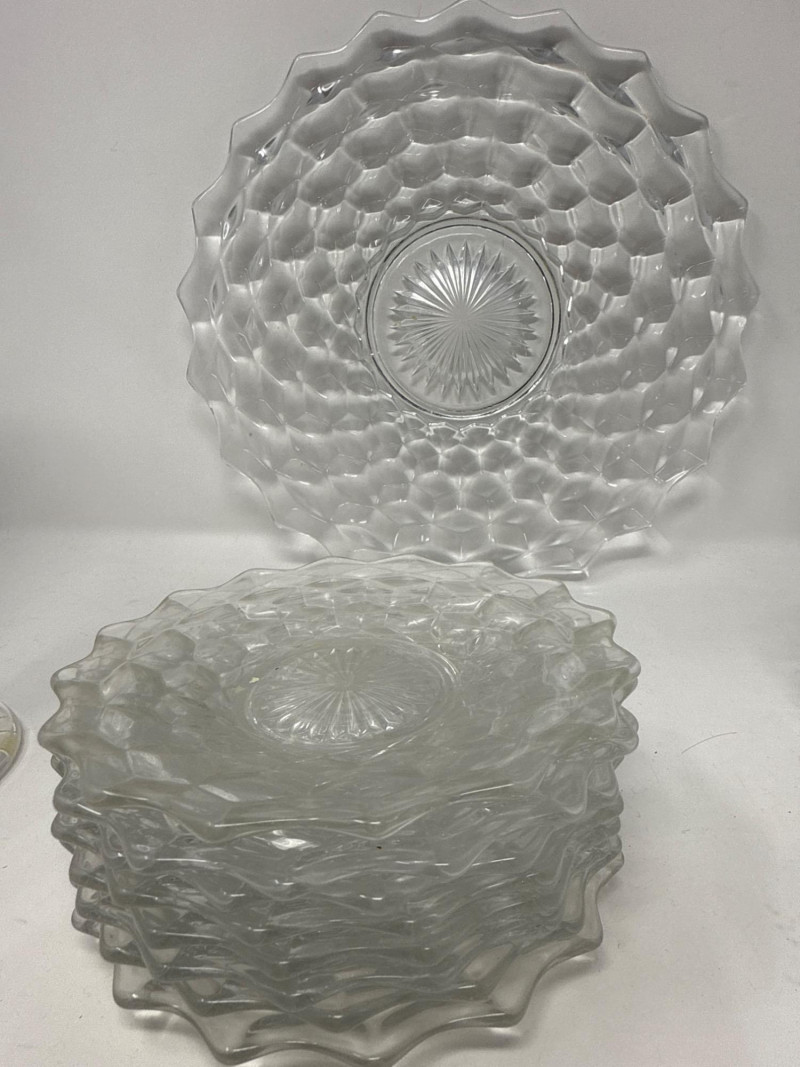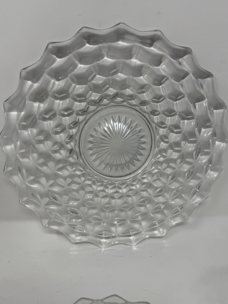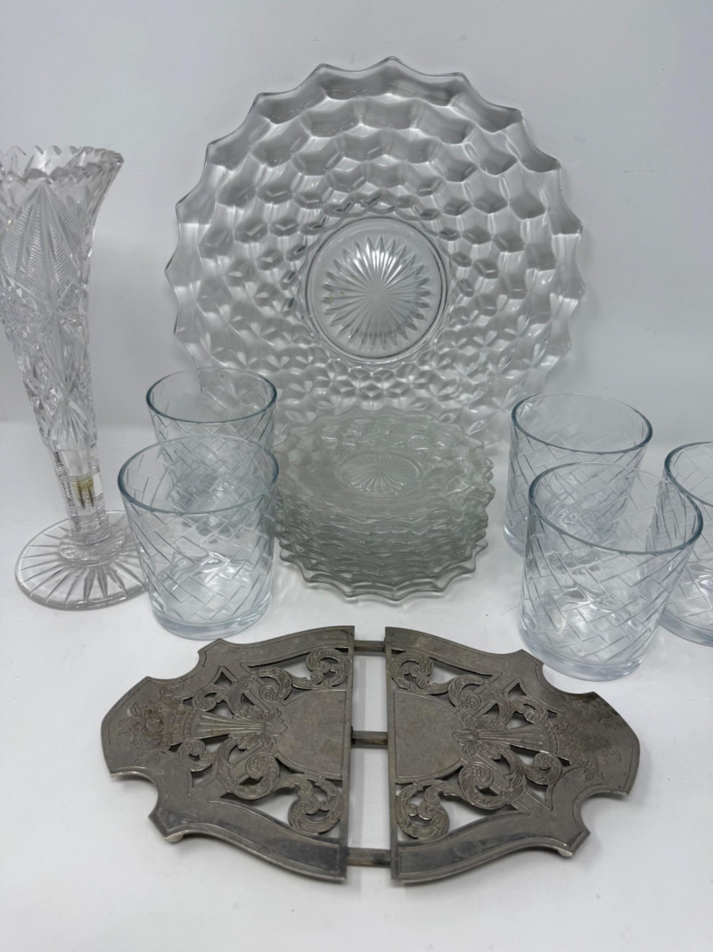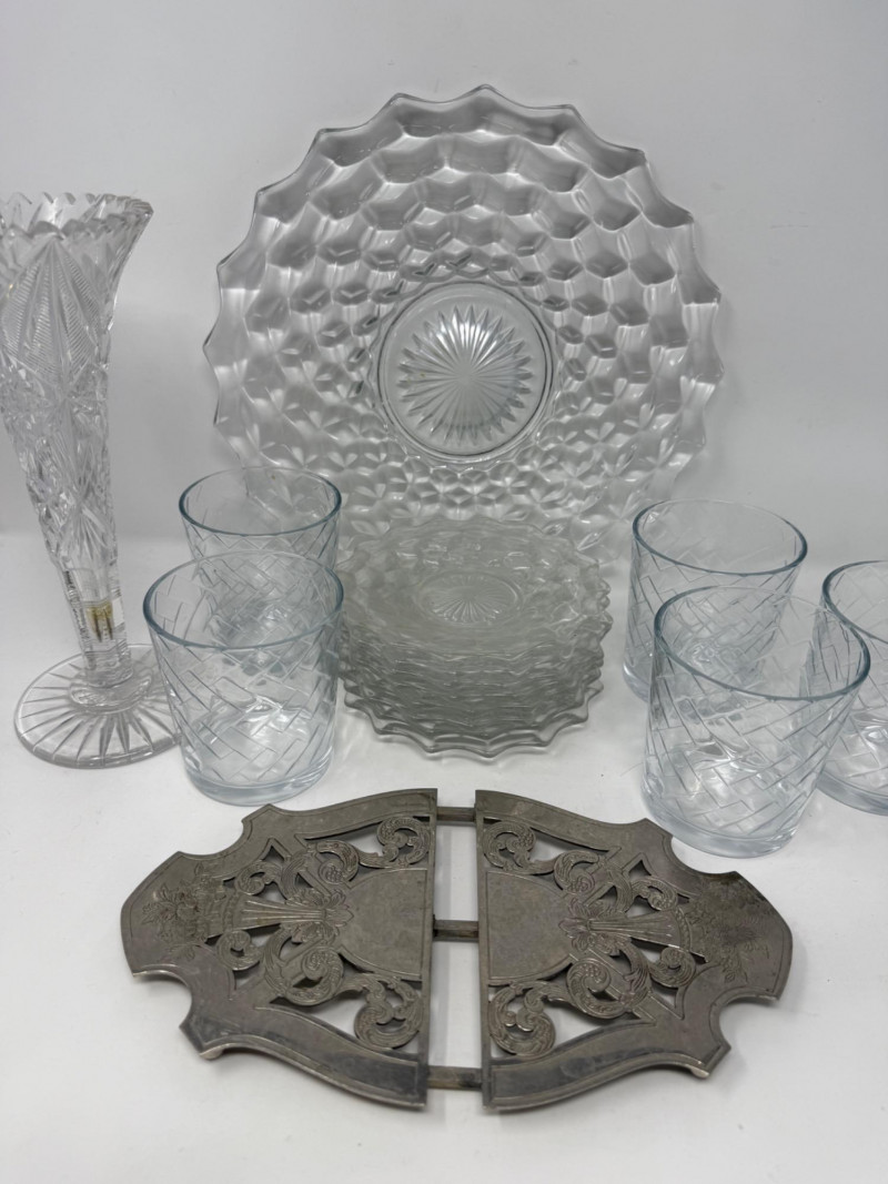 Fostoria American Clear Glass Sandwich Platter -11 7/8” and 8- 6” Plates MB Means Best Manning Bowman Expandable Silver Plate Trivet stamped 1111 5 Pasabahce Old-Fashioned Glasses