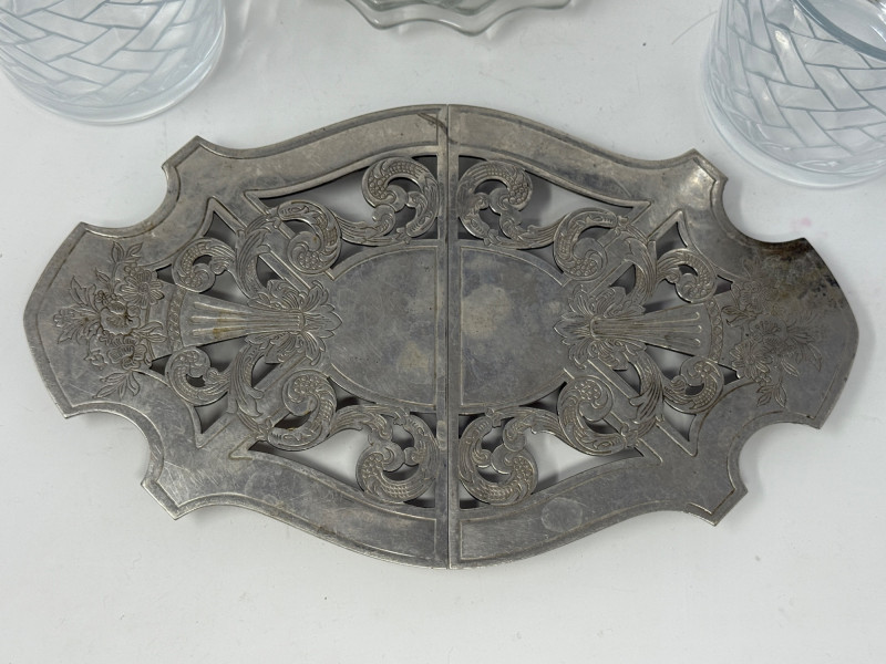 Lot # 236 - Expandable SP Trivet & Fostoria Sandwich Set & Glasses