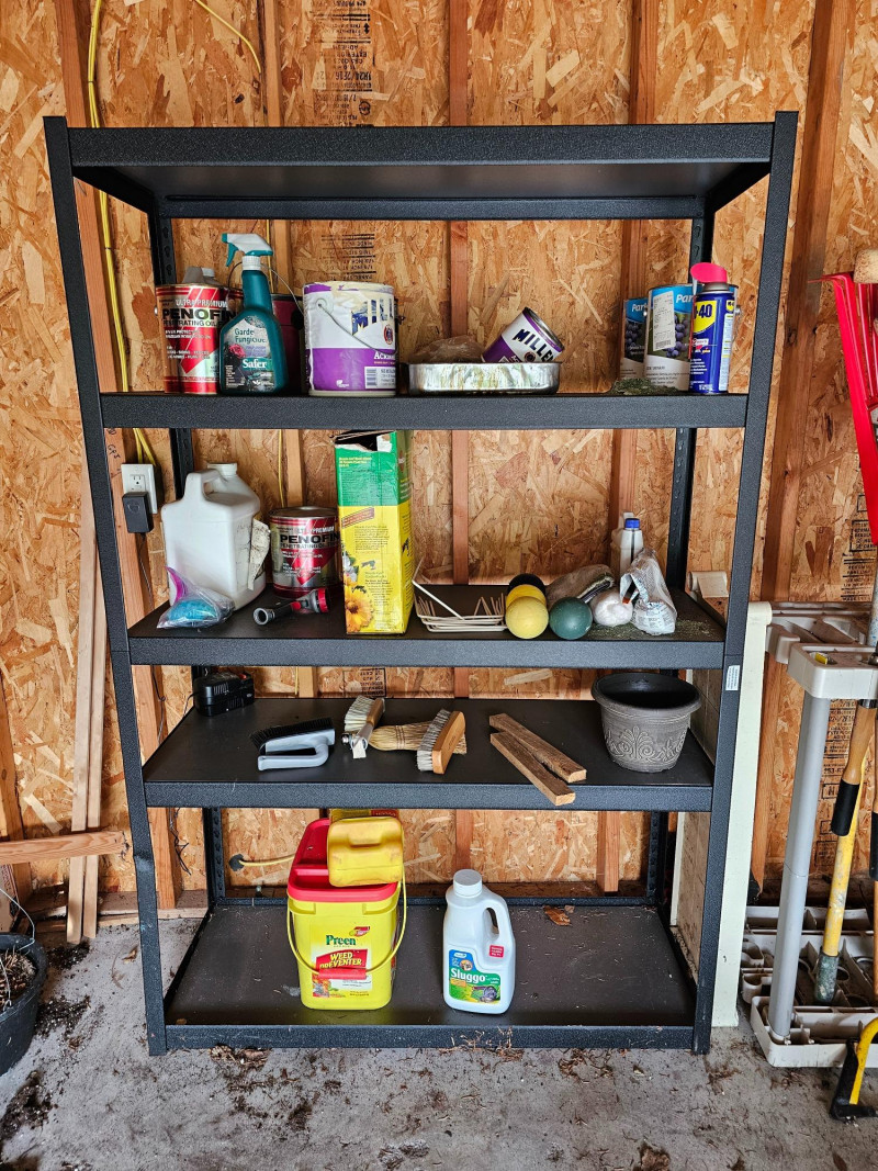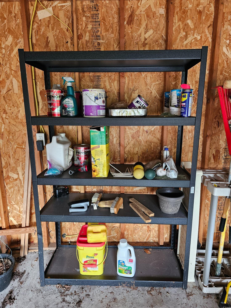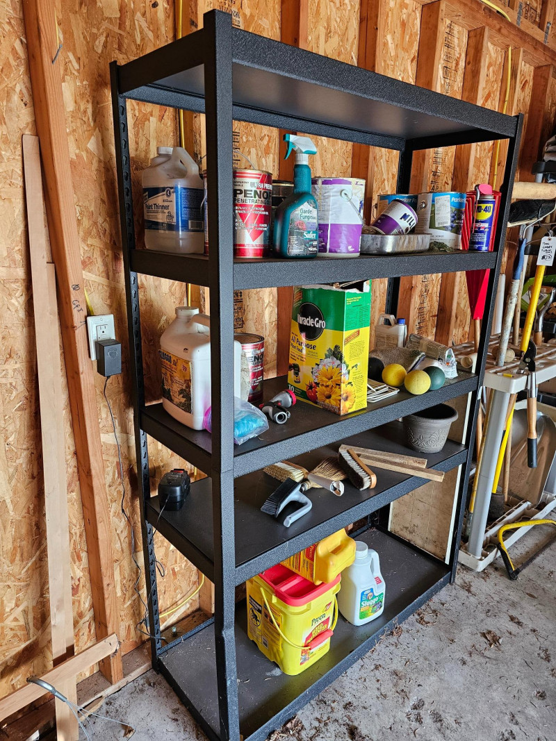 Set Of Storage Shelves With Metal Frame & Composite Shelves 5 shelves of storage Adjustable Black finish shelves perfect for storage in your garage, shed, or wherever Left upright has a dent 72"T x 48"W x 17.5"D Contents on shelves not included