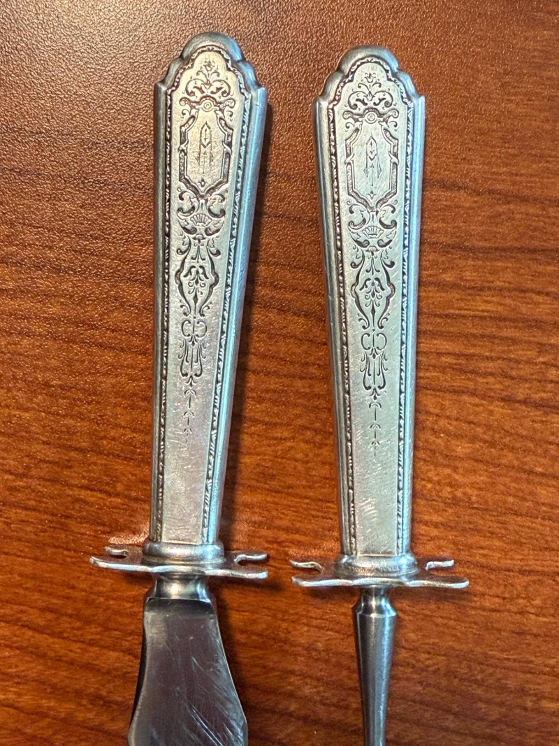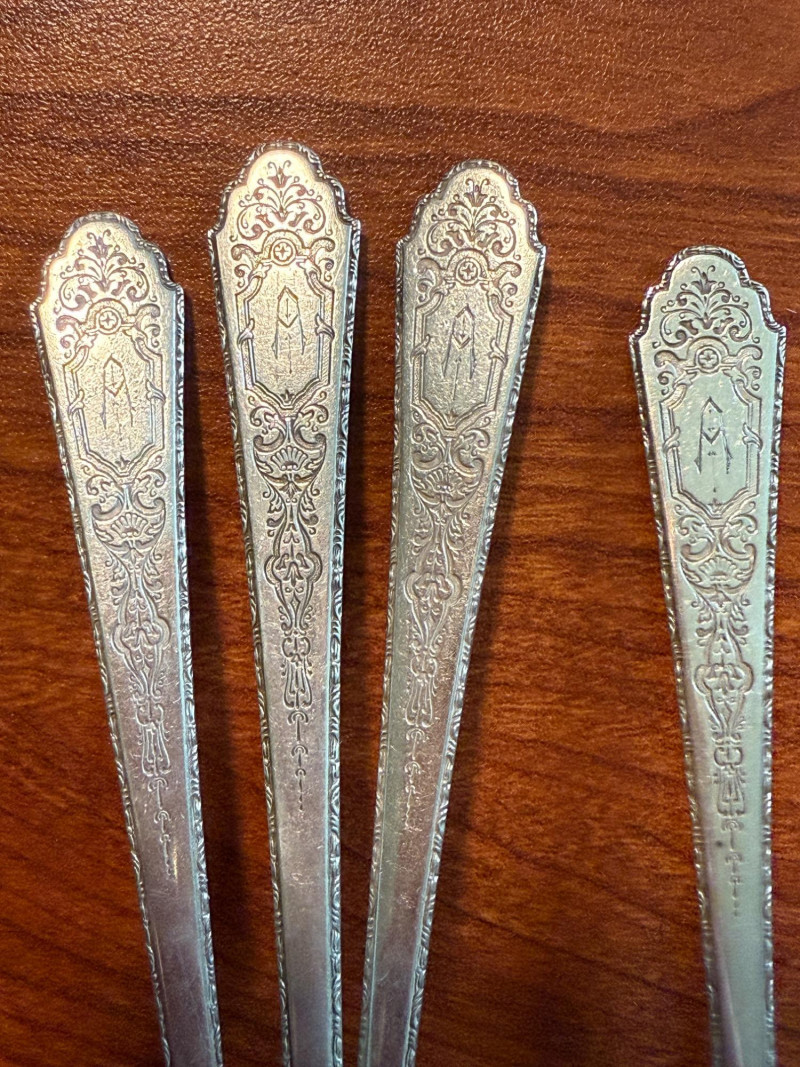 38 Lunt “Treasure” Sterling Silverware pieces. Monogrammed “A” 4 Non-Treasure utensils for a total of 42 sterling silver utensils. Weights are for 1 utensil in grams: 2 - Dinner Knife With Stainless Steel Blade 60g 1- Cheese Knife 34g 2 - Fish Knife 28g 13 - Salad Fork 28g 1 - Trident Fork 13g 3 - Dinner Fork 45g 1 - Serving Fork 53g 1 - Pickle Screw 16g 1 - Carving Fork with Stainless Tines 73g 1 - Carving Knife with Stainless Blade 80g 2 - Serving Spoon 63g 2 - Dinner Spoon 21g 1 - Small Slotted Spoon 23g 11 - Scooping Spoon 22g 4 - Soup Spoon 25g 1 - Large Ladle 48g 1 - Small Ladle 26g 4 - Non-Treasure Sterling Pieces TOTAL weight- 53g