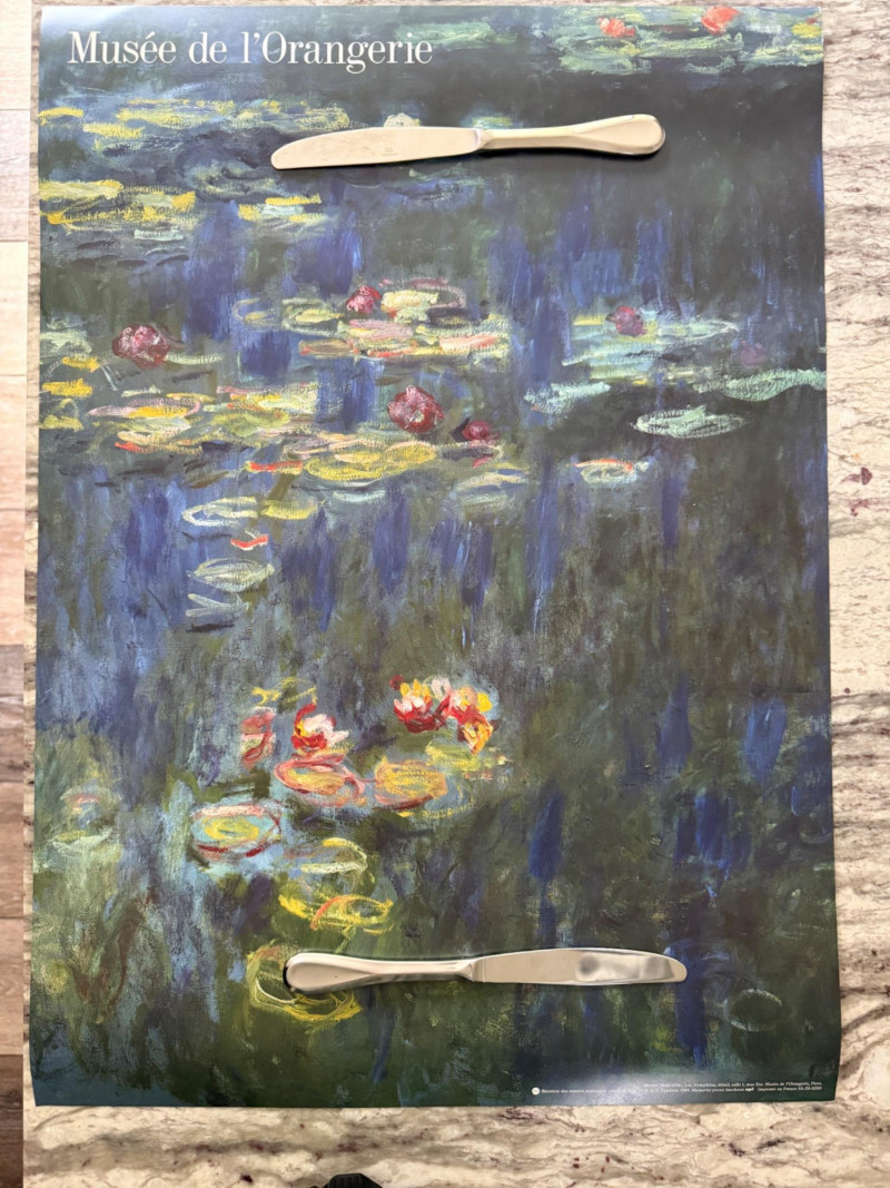 Renoir and Monet Prints From Musee de l’Orangerie Gabrielle and Jean" by Pierre-Auguste Renoir, circa 1895. It depicts Gabrielle Renard, the family caretaker and frequent model, with Jean, Renoir's son, during his early childhood. Claude Monet's "Water Lilies" (1919), part of a series of approximately 250 oil paintings" Large prints from the Musee de l’Orangerie. 19.5”x27.5” Butter knives not included.