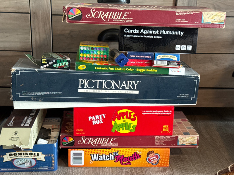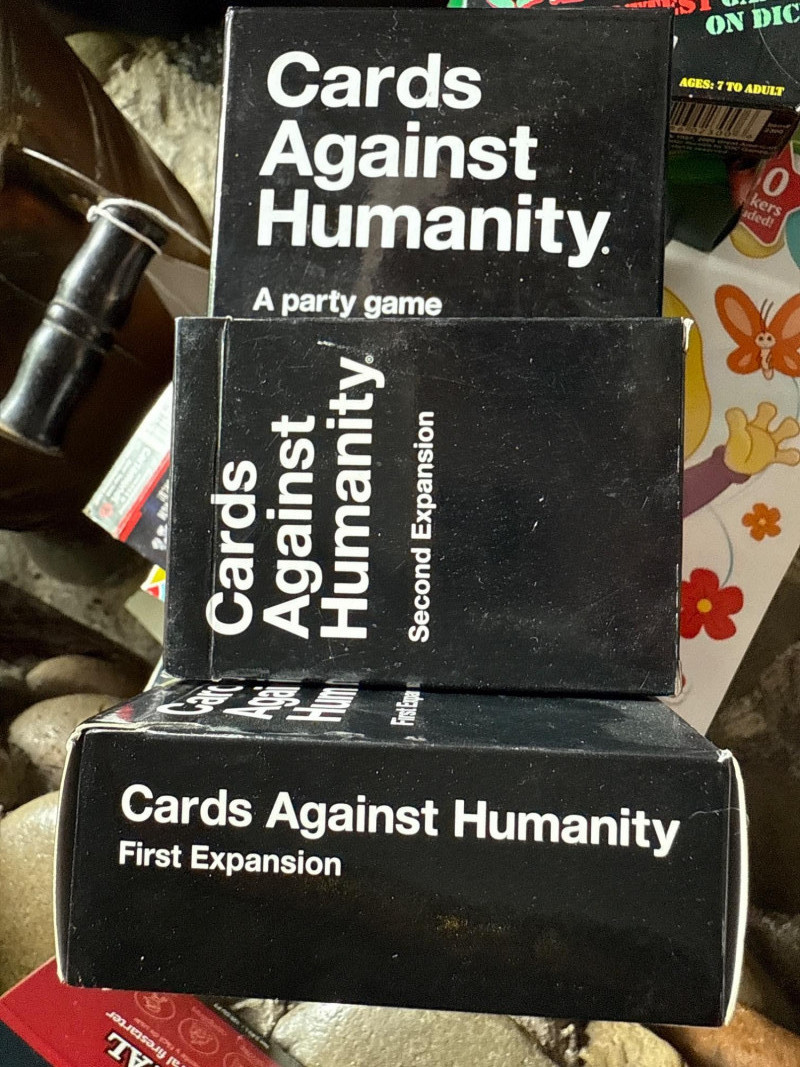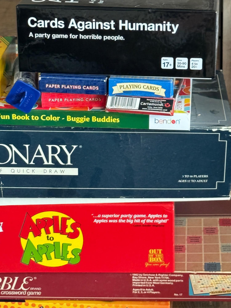 Fun and Games 2 - 10 Different Games + Dominos, Greed, LCR, Playing Cards, Crayons and Color Book and Board Games Cards Against Humanity expansion 1, 2.