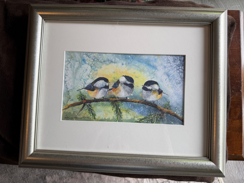 Winter Chickadees, a watercolor print Mottled silver wood frame with white matting measures 17”x14”