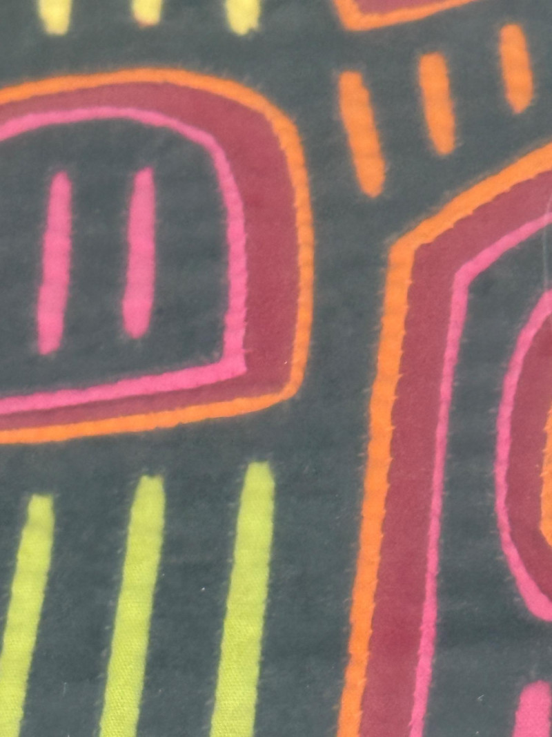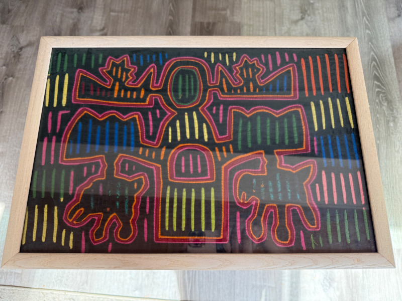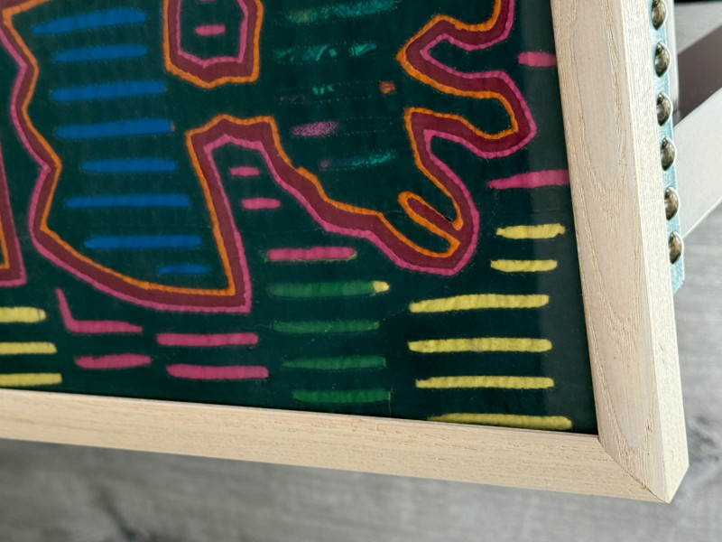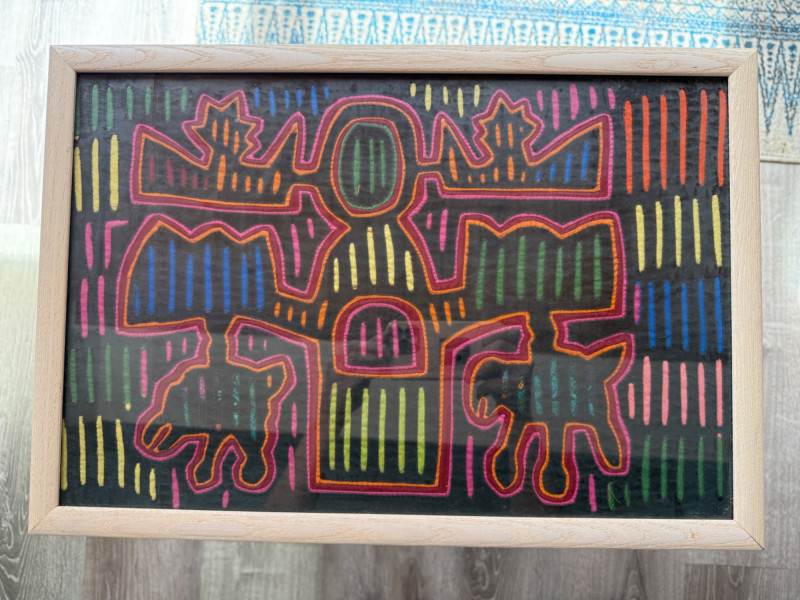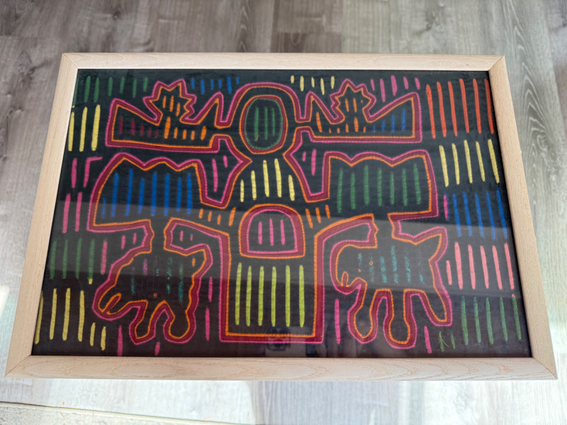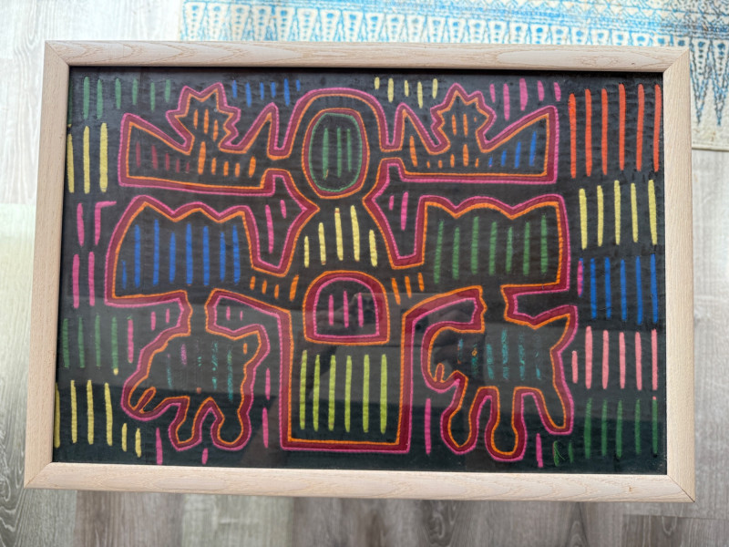 Mola,a textile art form from the Guna people of Panama Hand Stitched Colorful Framed Under Glass Fabric Art Measures 19” x 13” in a light wood frame.