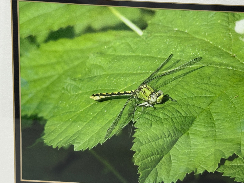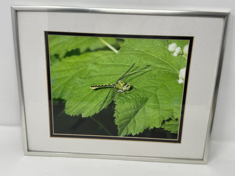Dragonfly Tiffany Style Candle Lamp is 9”x5.5” Framed photo double matted in a silver metal frame. Measures 11.5”x14”