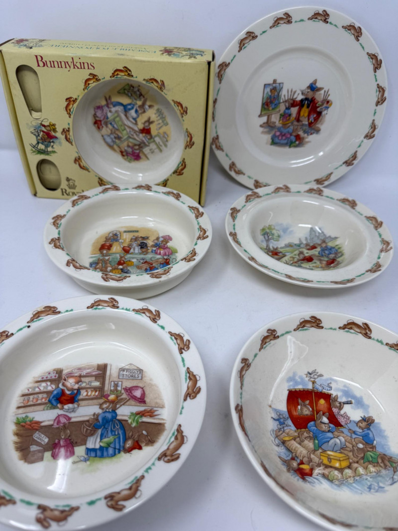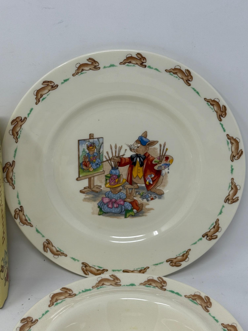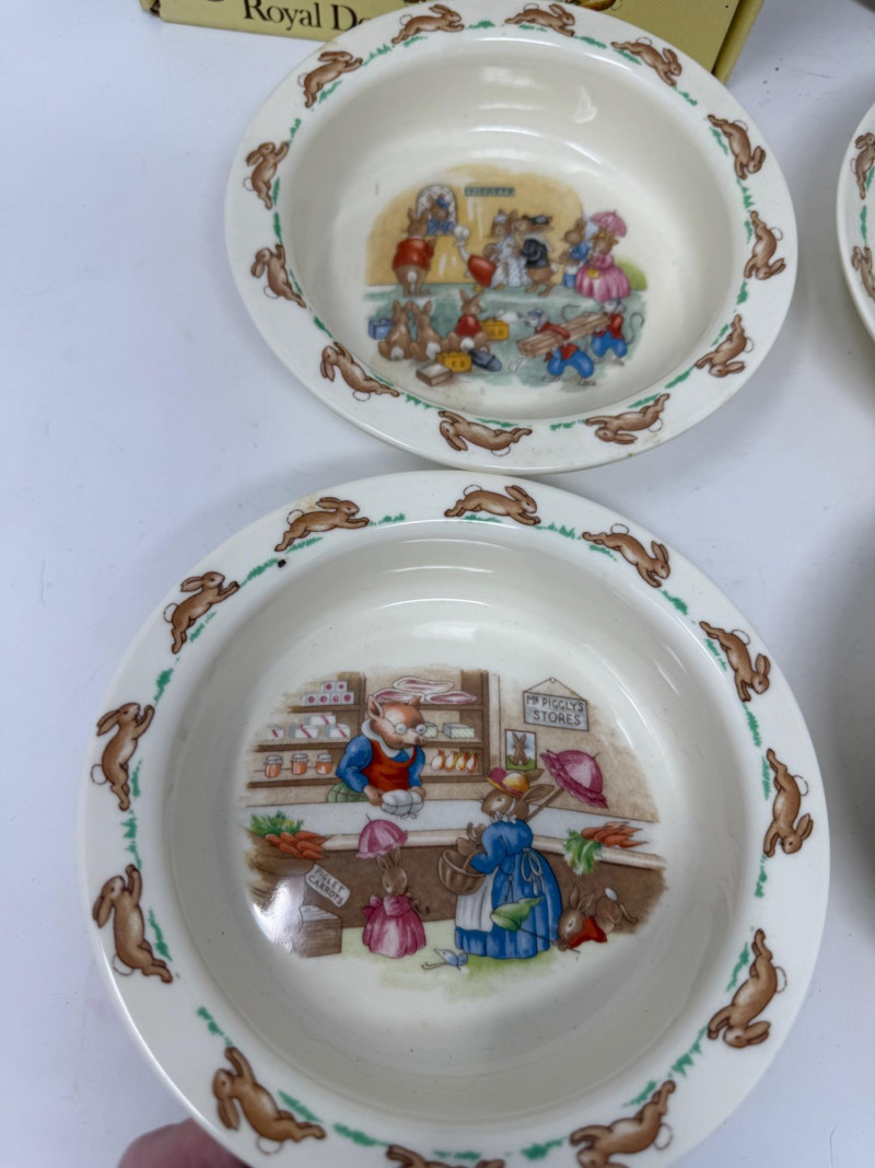 6- Royal Doulton Bunnykins Bowls and Plate Bowl in box only, no spoon.