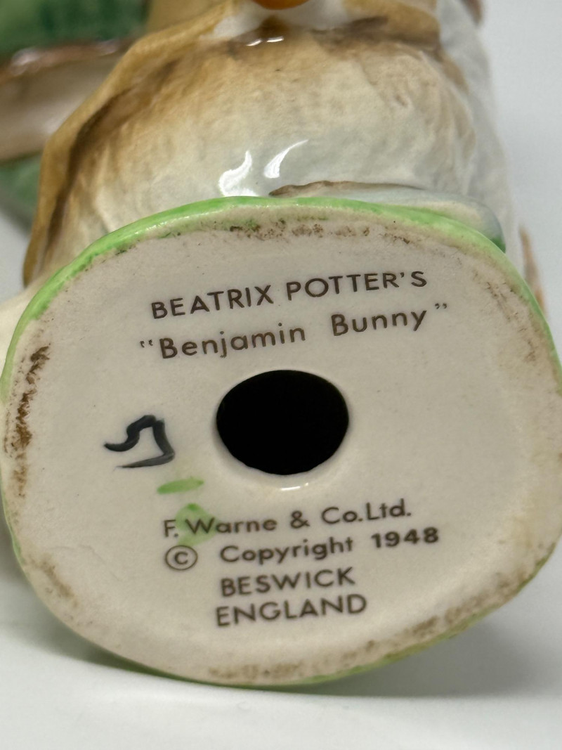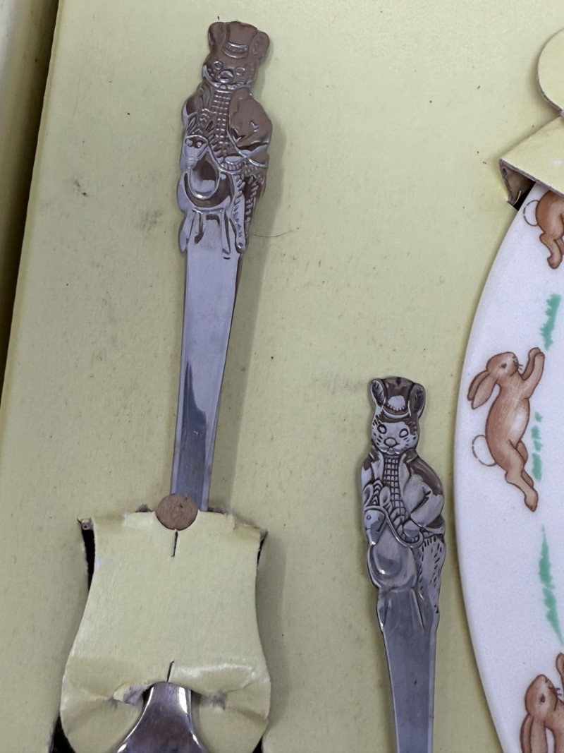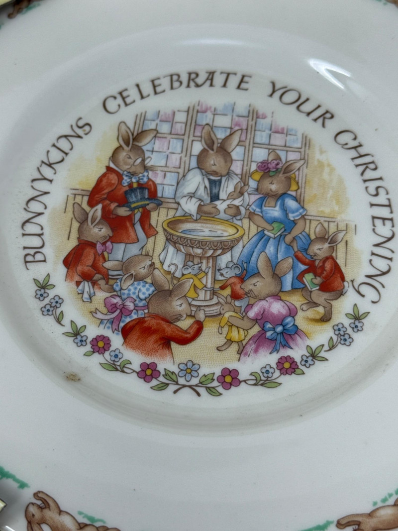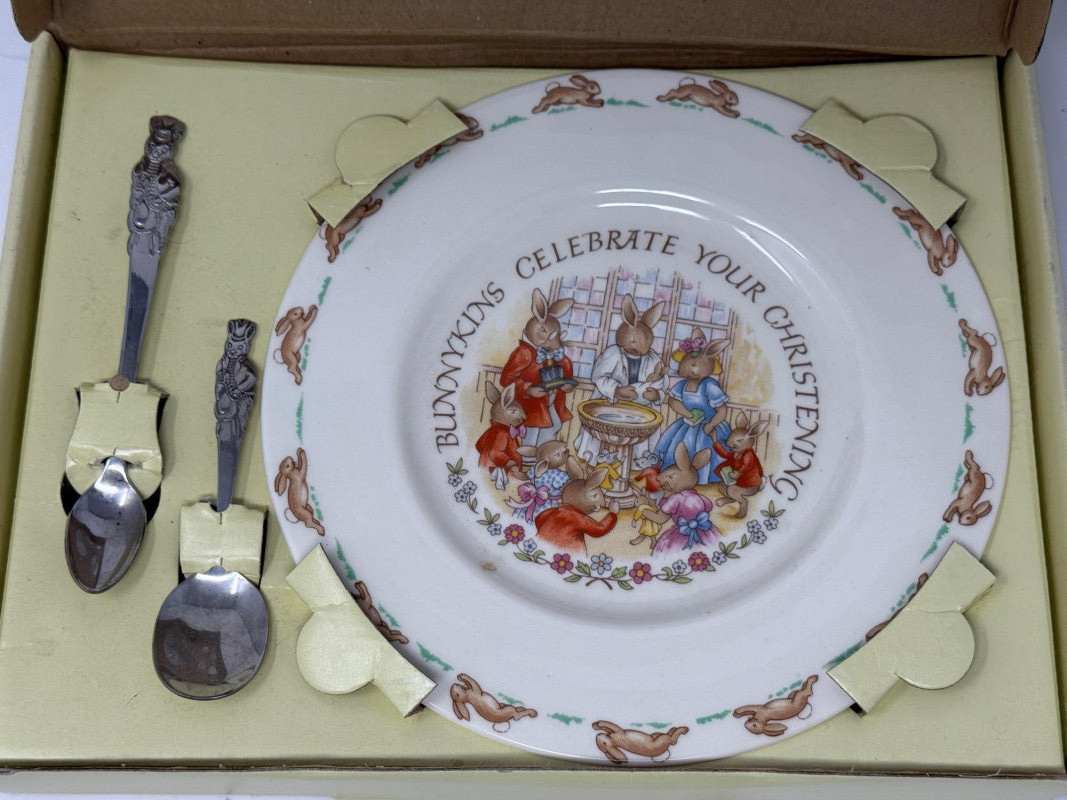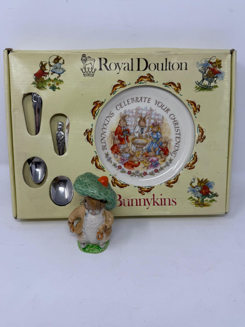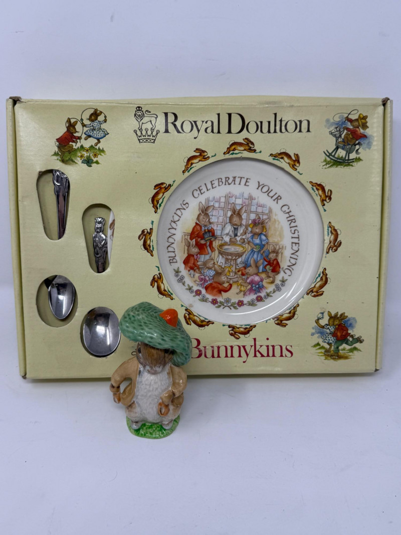 Bunnykins Christening Plate & Fork/Spoon Set in original box. 1948 4” Beatrix Potter Benjamin Bunny Figurine