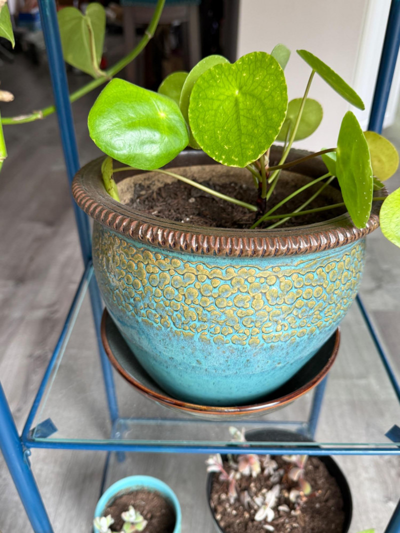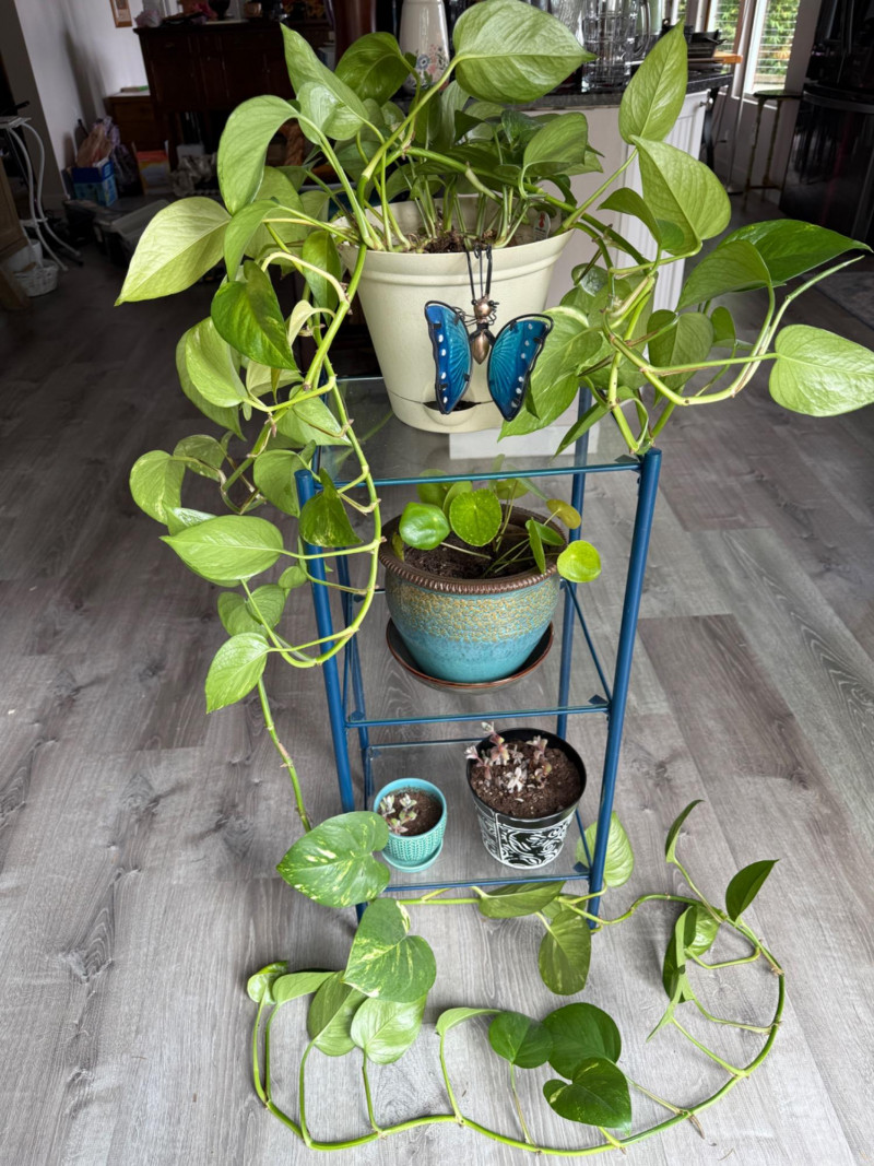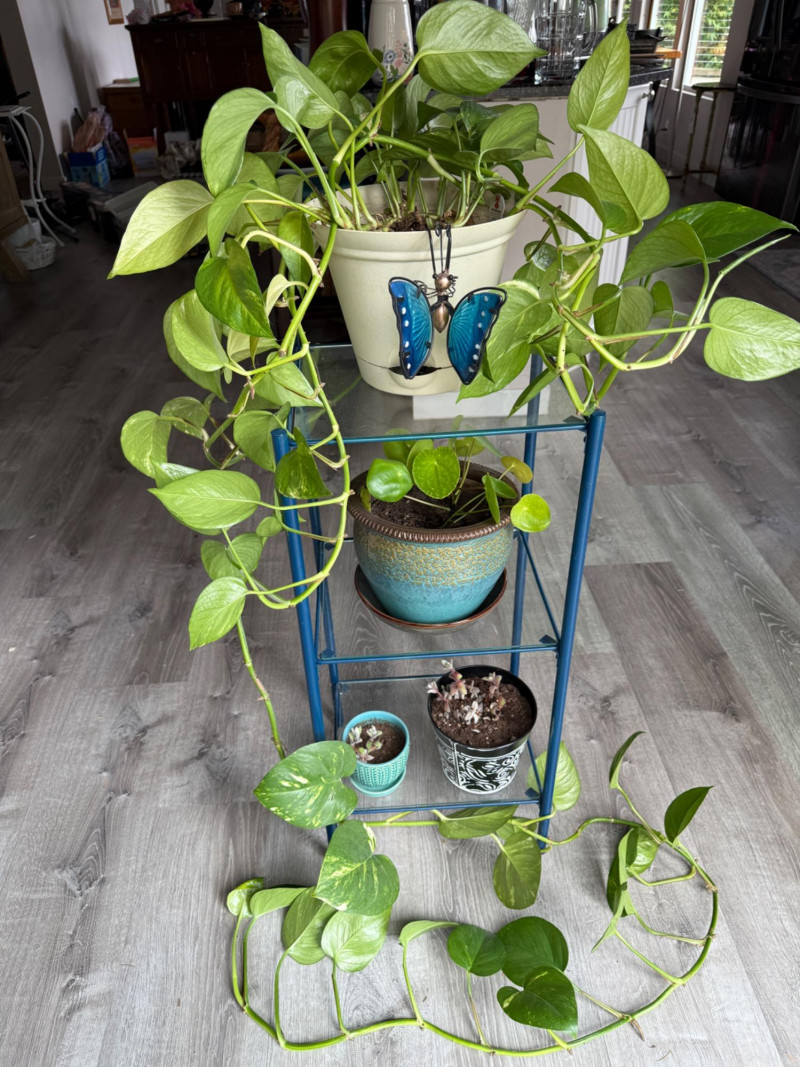4 Happy Healthy Houseplants.on stand 13”x11”x30” glass shelf blue metal frame.