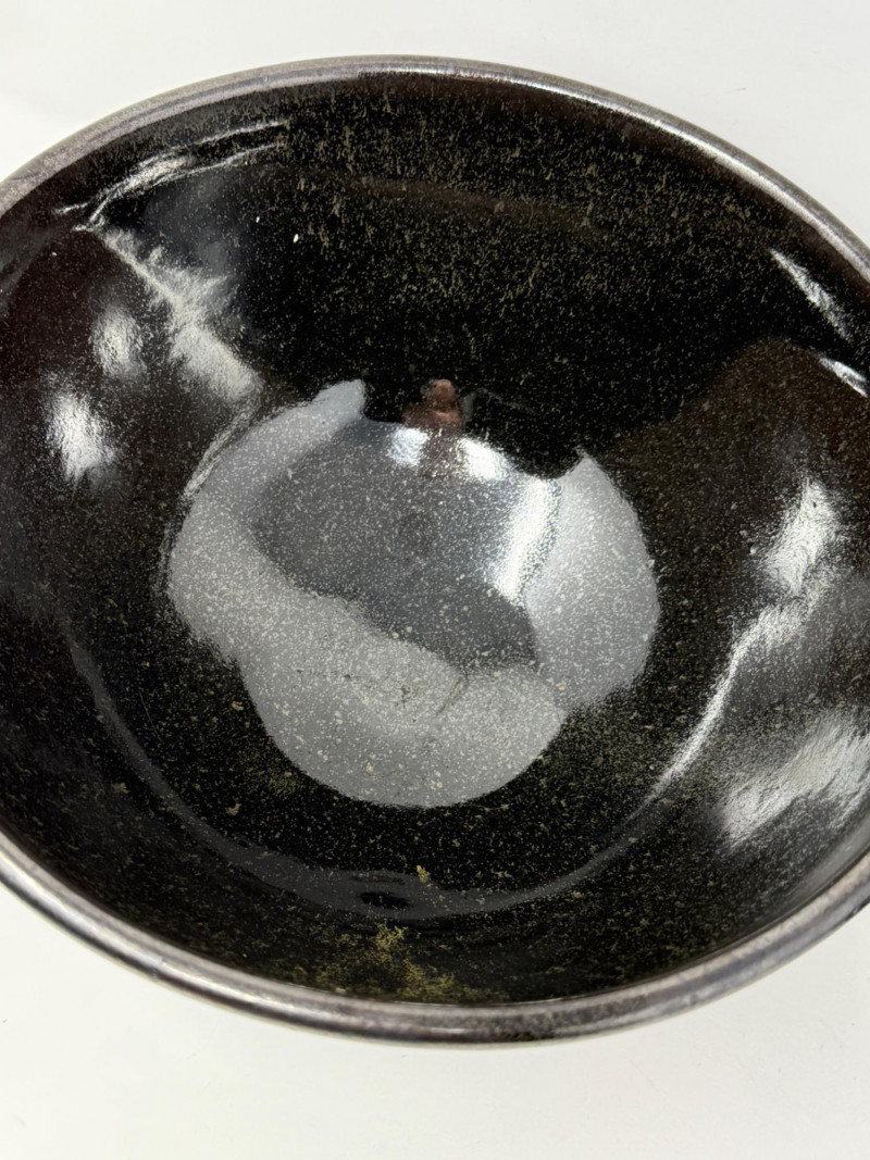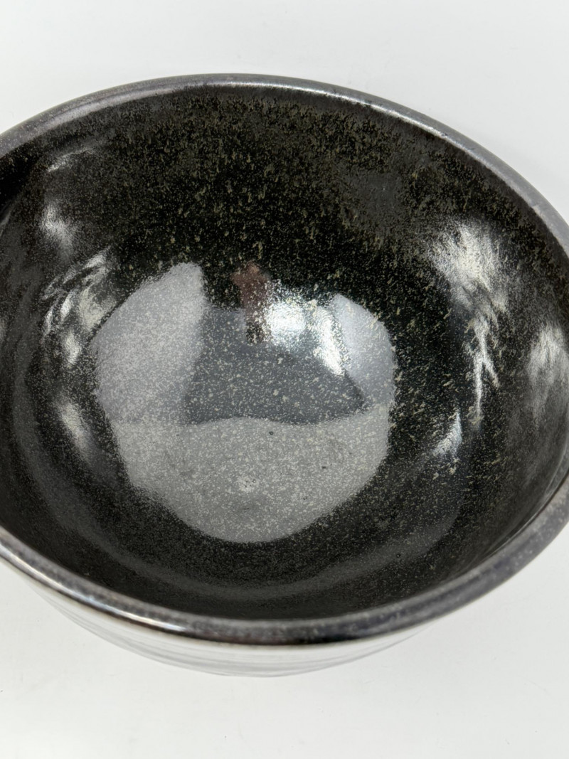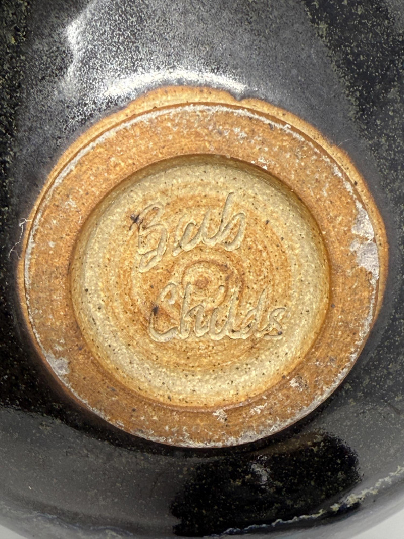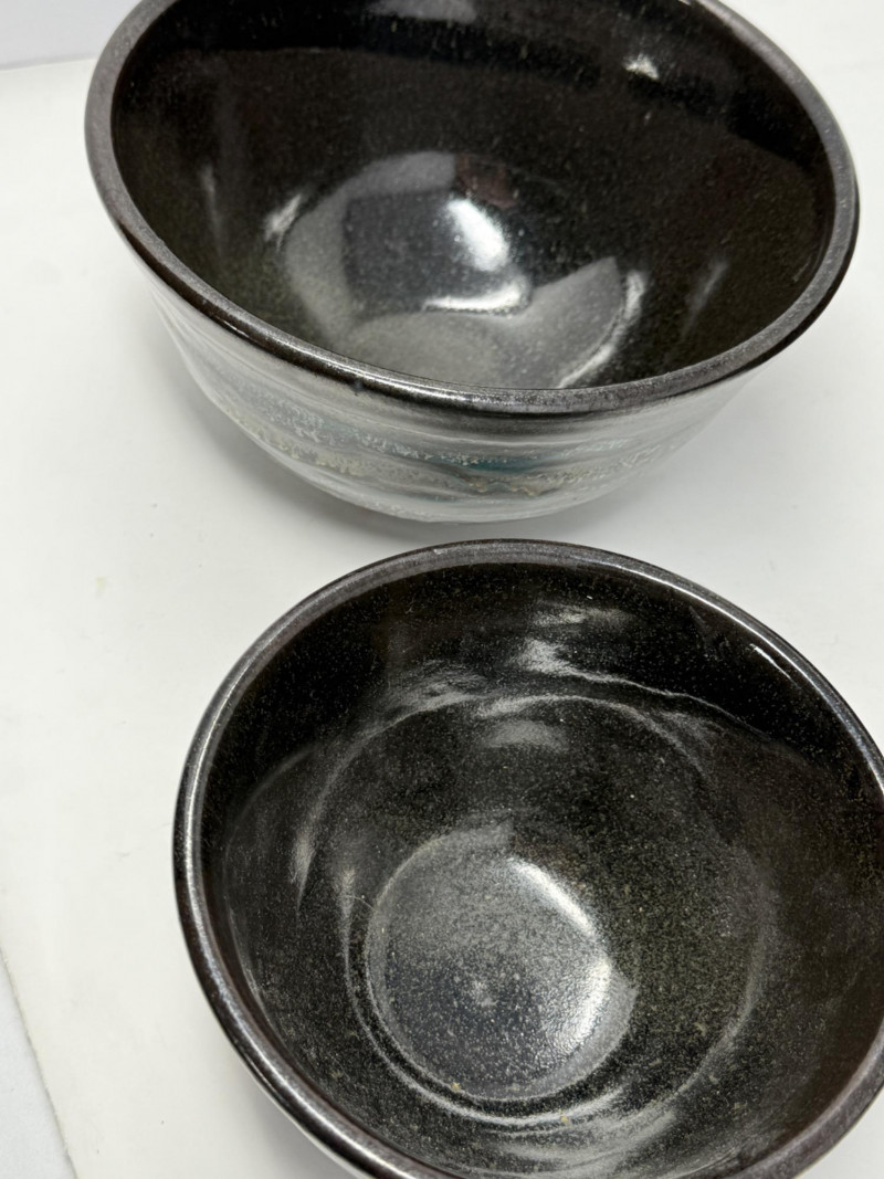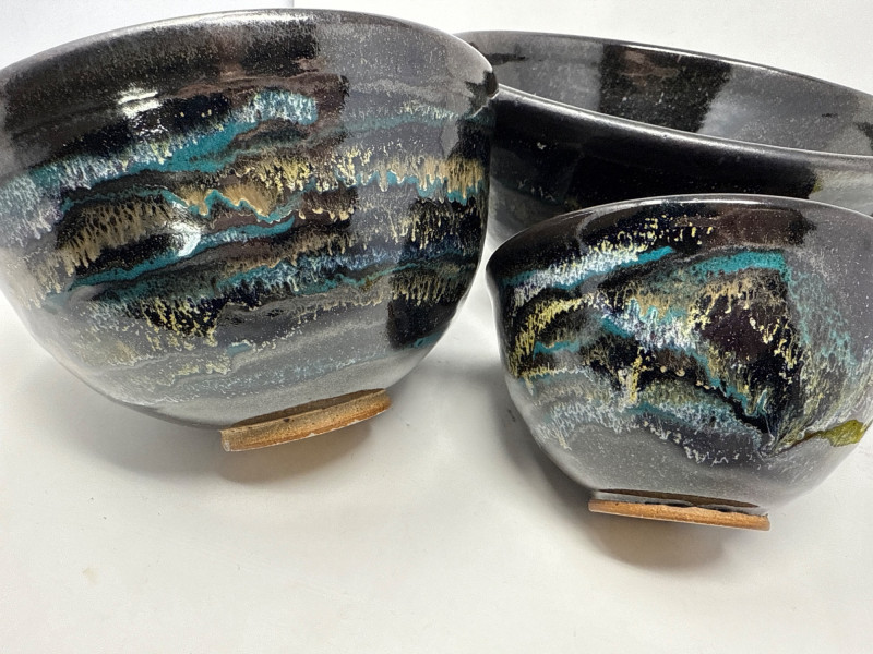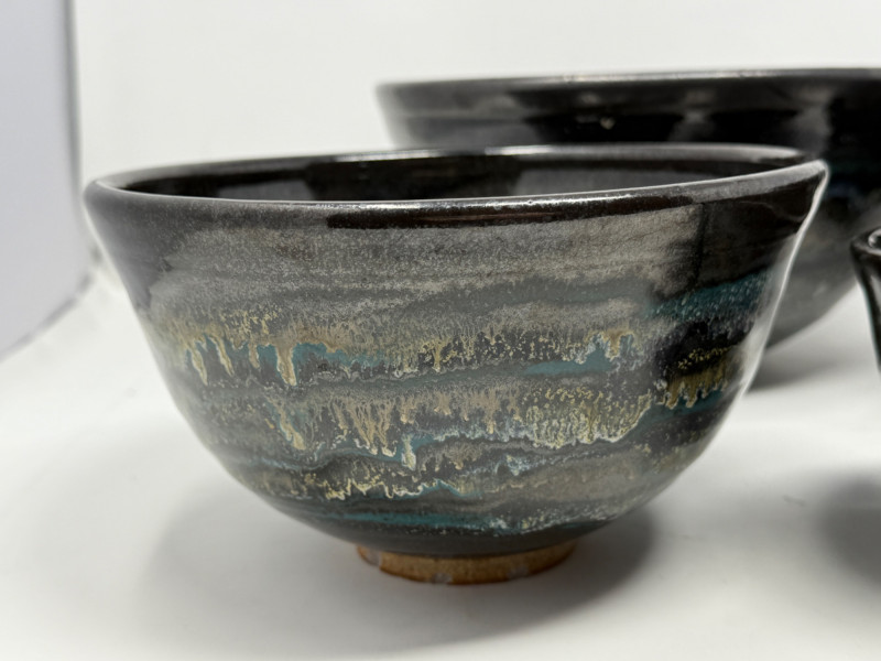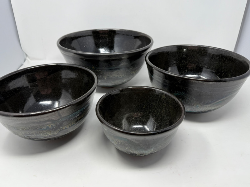 Set of 4 Hand Crafted Glazed Pottery Footed Nesting Bowls signed by Barb Childs. Smallest is 6”x3.75” Beautiful set in black teal blues tan glaze.