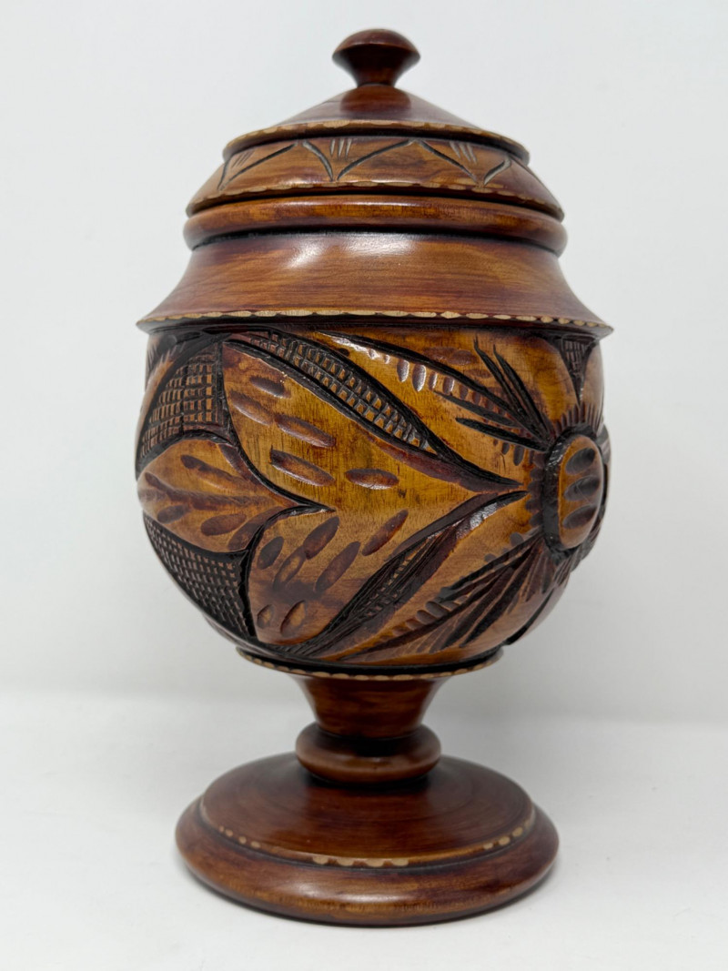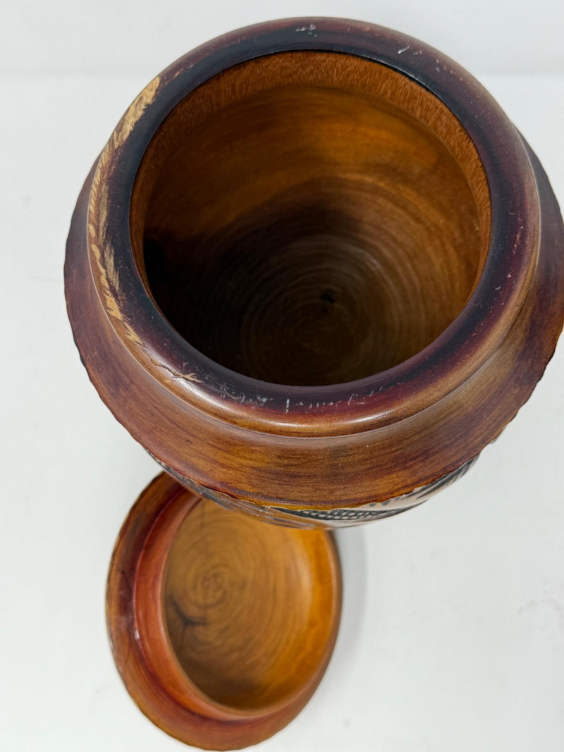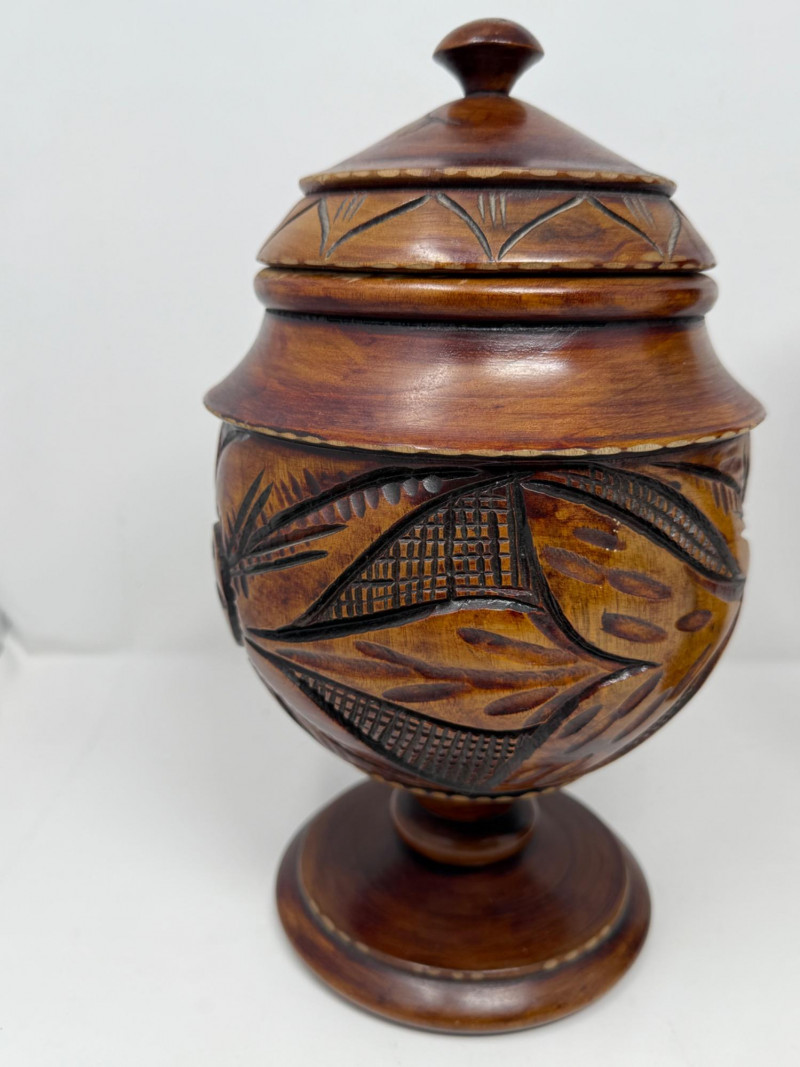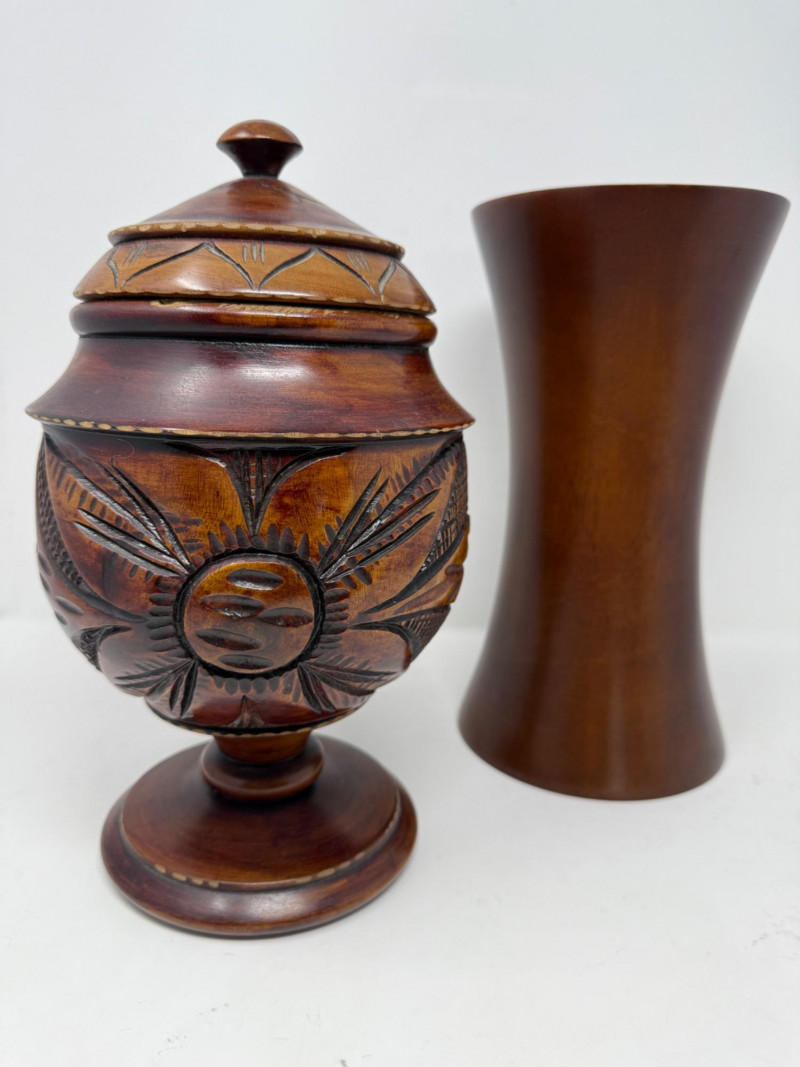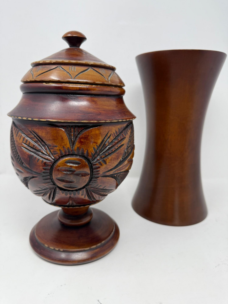 Hand Carved Wood Urn & Modern Wood Vessel Hand Carved Wood Urn is 6.5”x11.5” Modern Wood Vessel 6”x11”