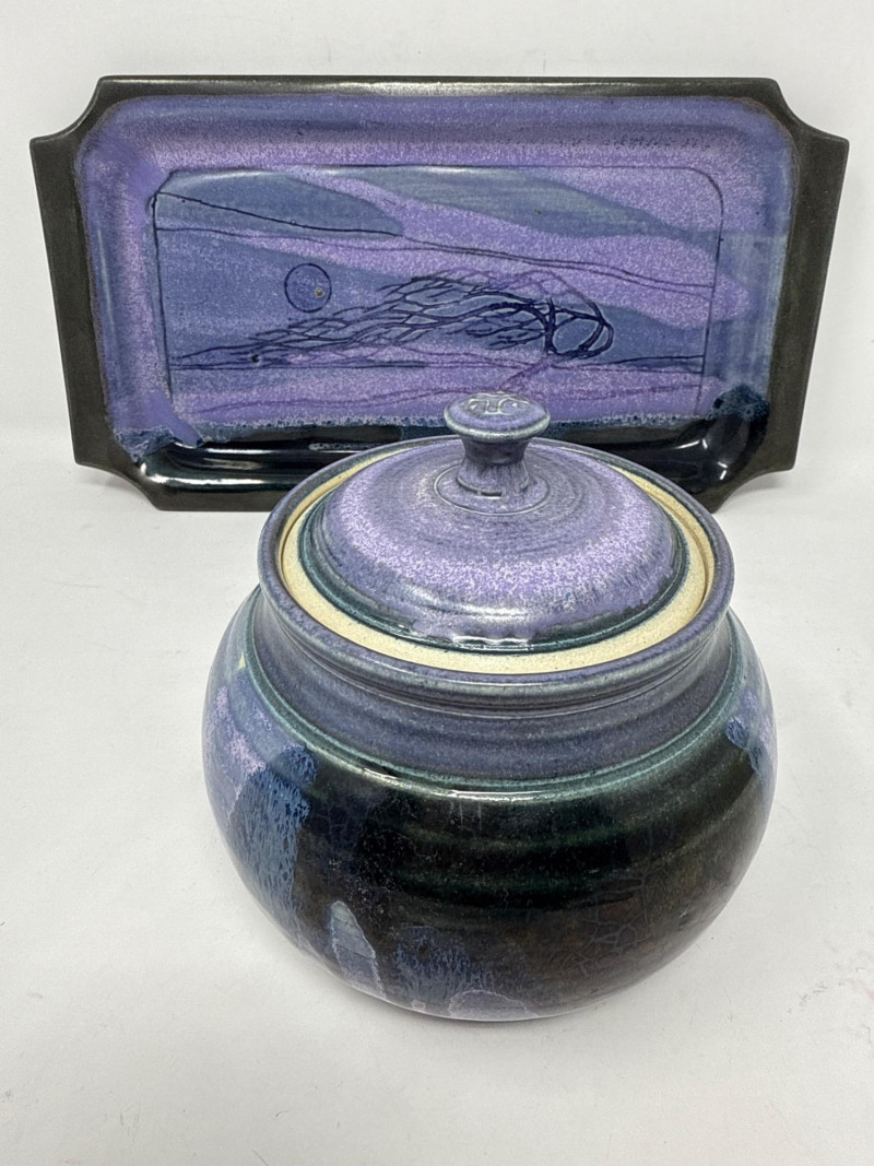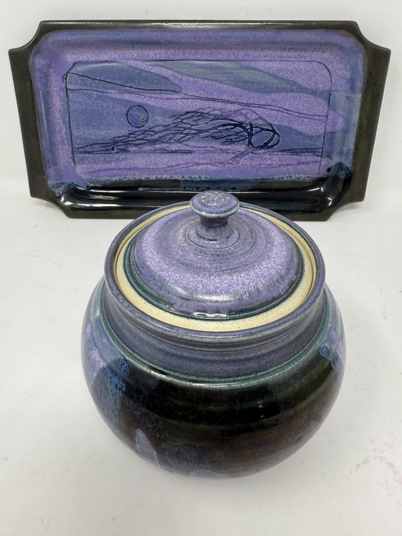 John Dunlap of Harstine Island Gallery Hand Crafted Glazed Pottery Tray and Lidded Pot Pot with lid is 5.5”x5.5”