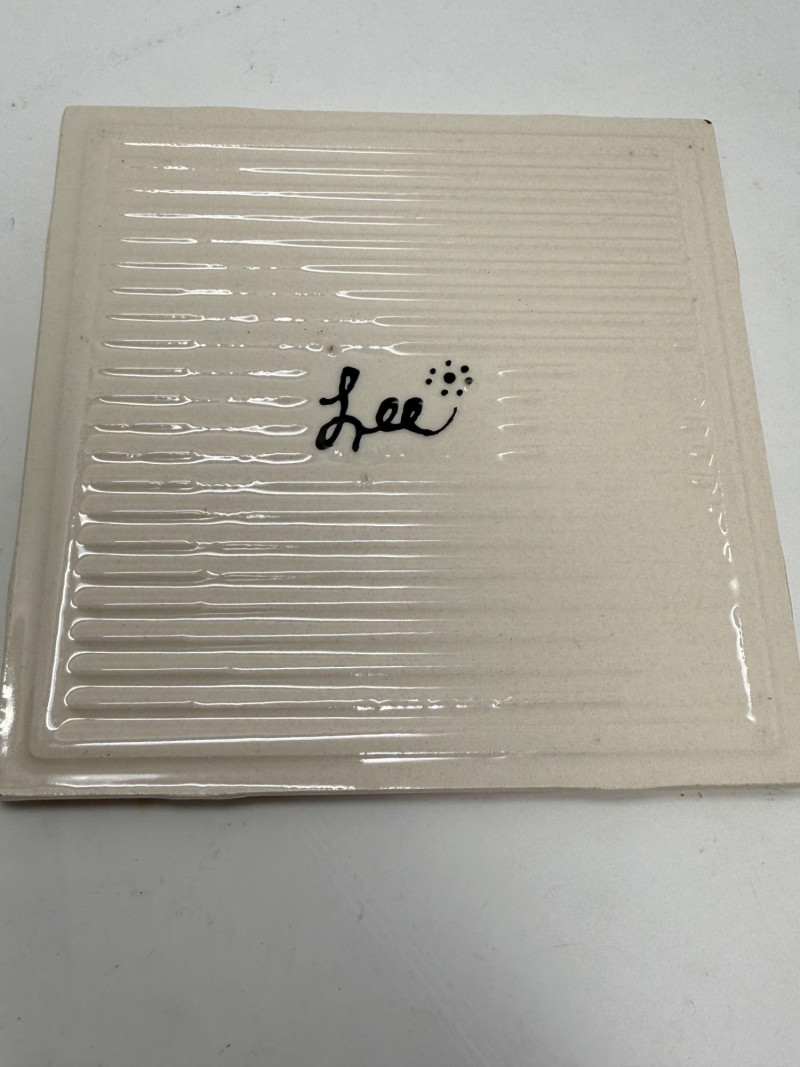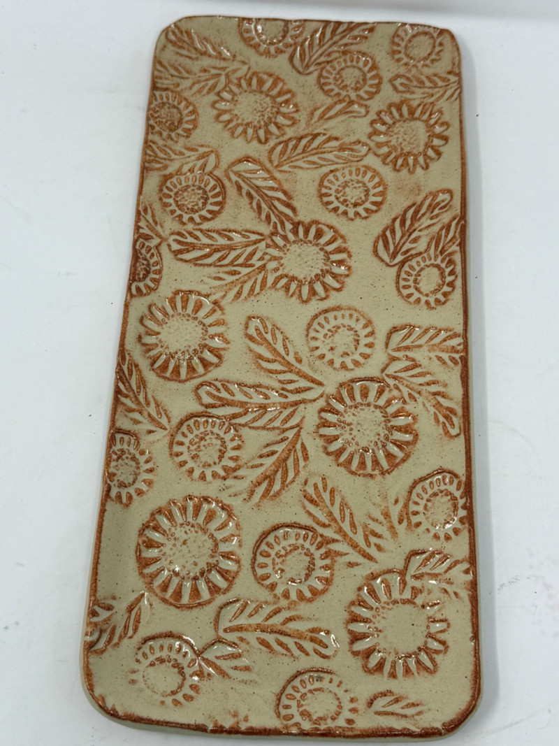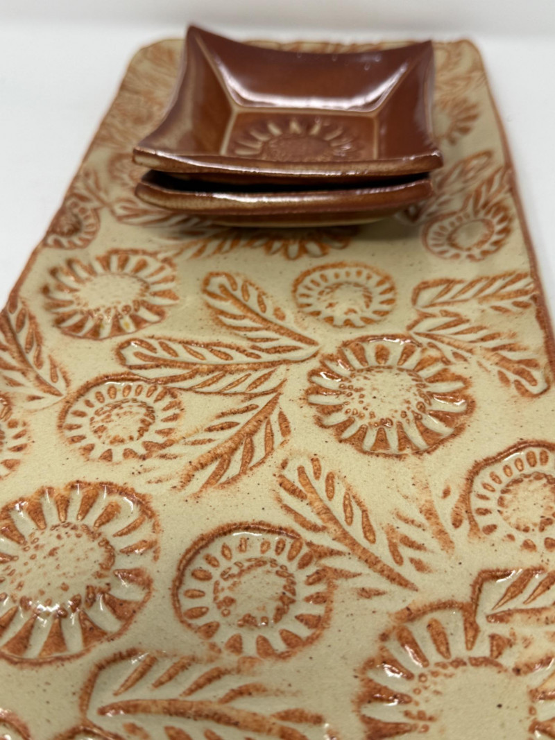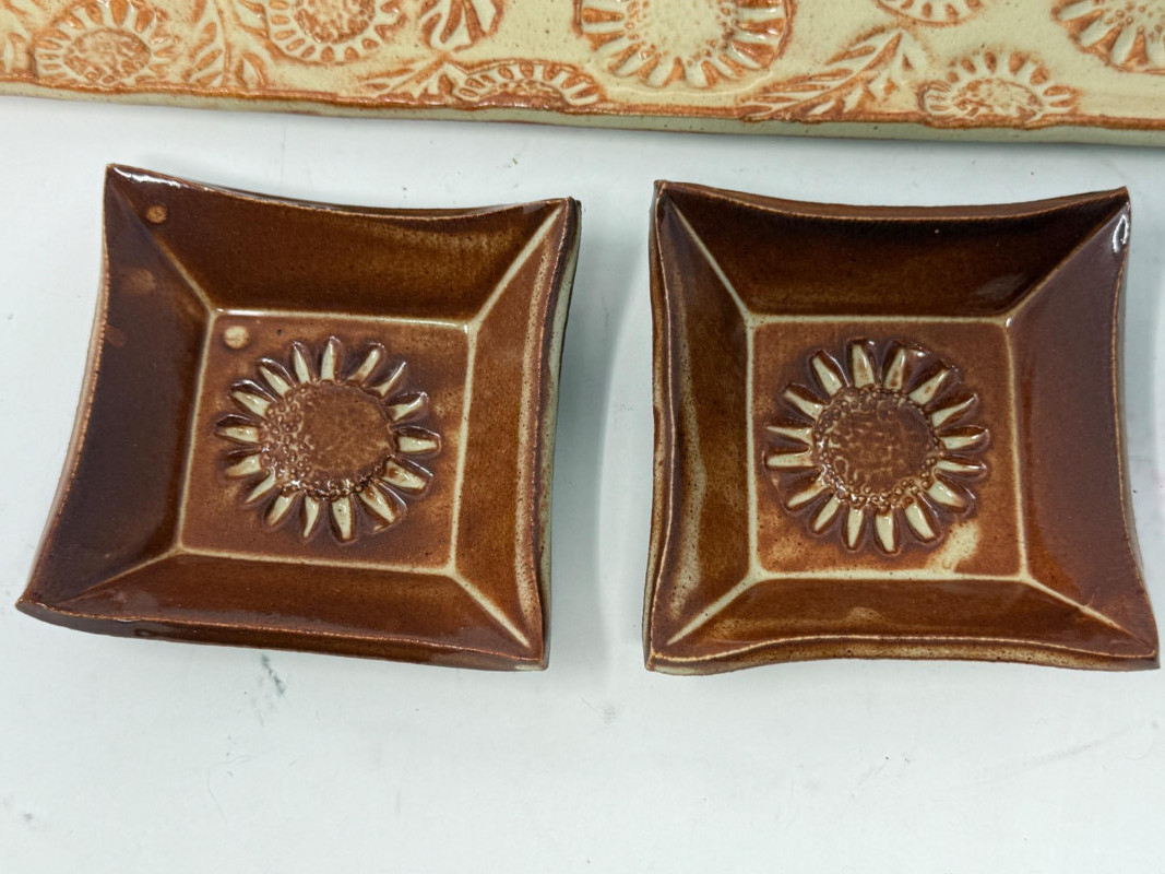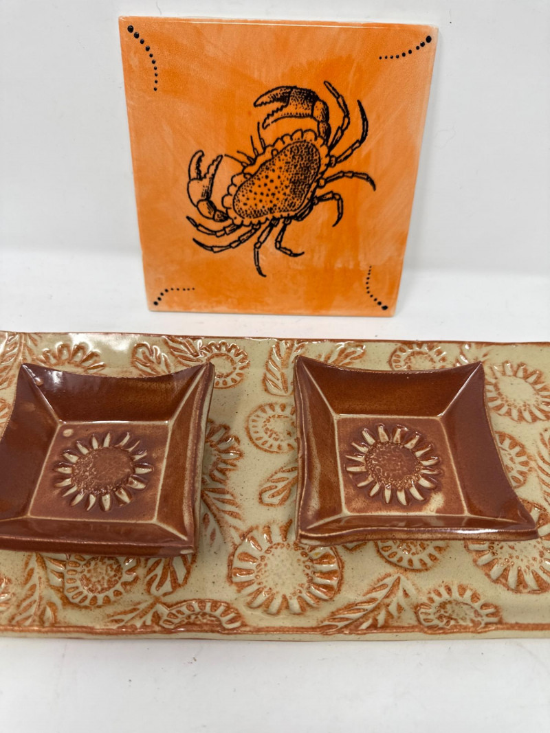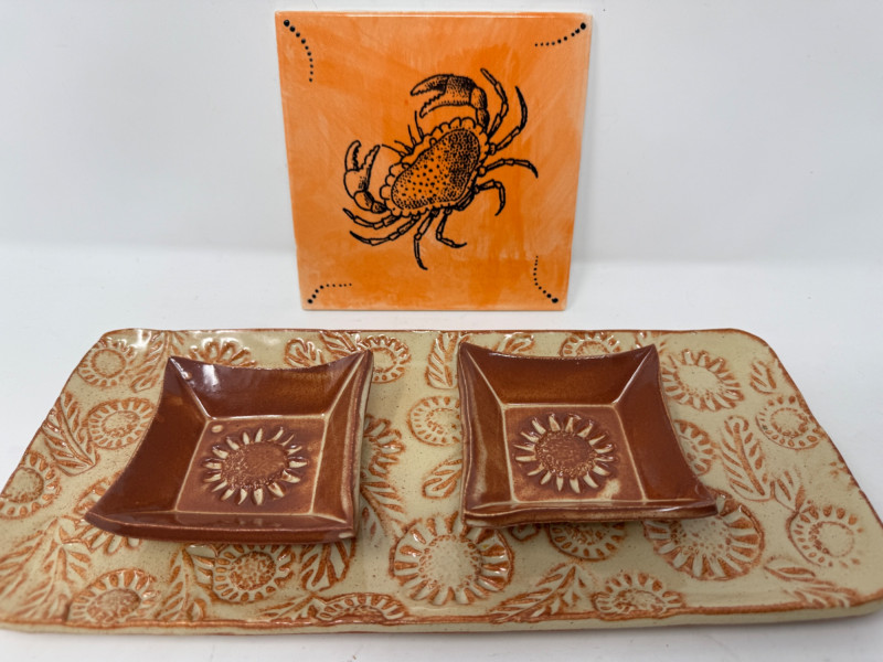 Glazed Pottery Tray with sunflower design & 2 Small Dishes measures 6”x13.5” and 3.5” square dishes. Hand-painted Crab Trivet by Lee is 6” square
