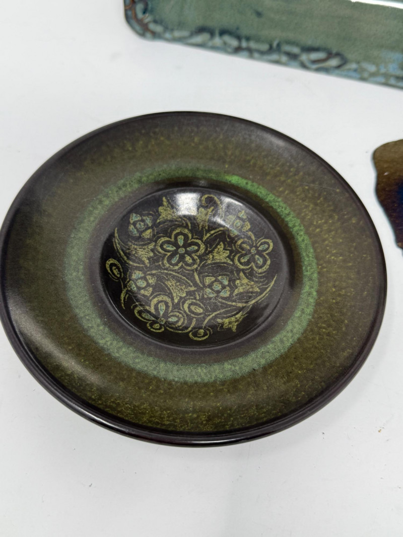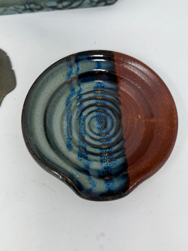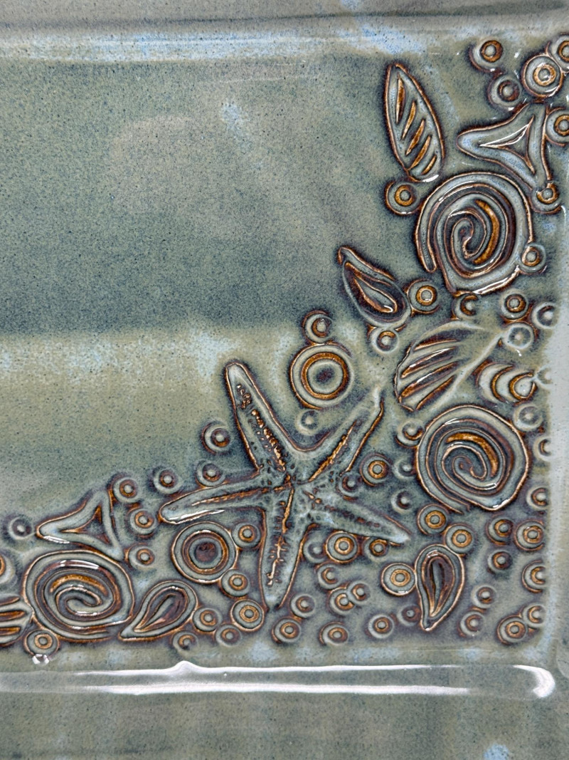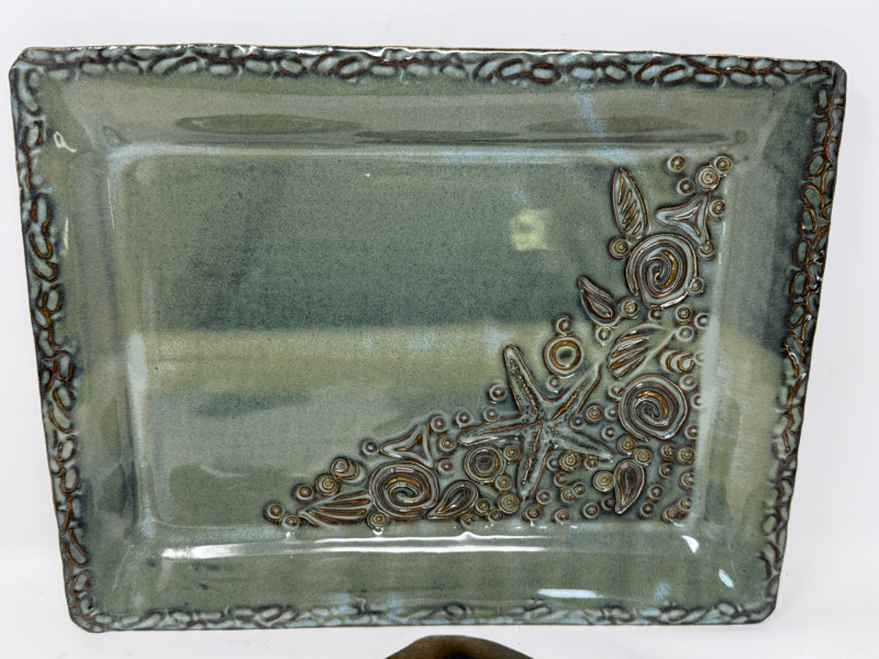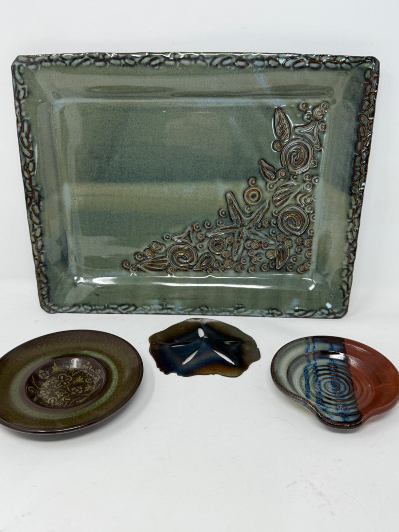 Hand Crafted Starfish Glazed Pottery Tray is 14.5”x11.5” by Barbara Childs Metal Sand Dollar is 5” Small pottery ring bowl 5” and soap holder.4.75”