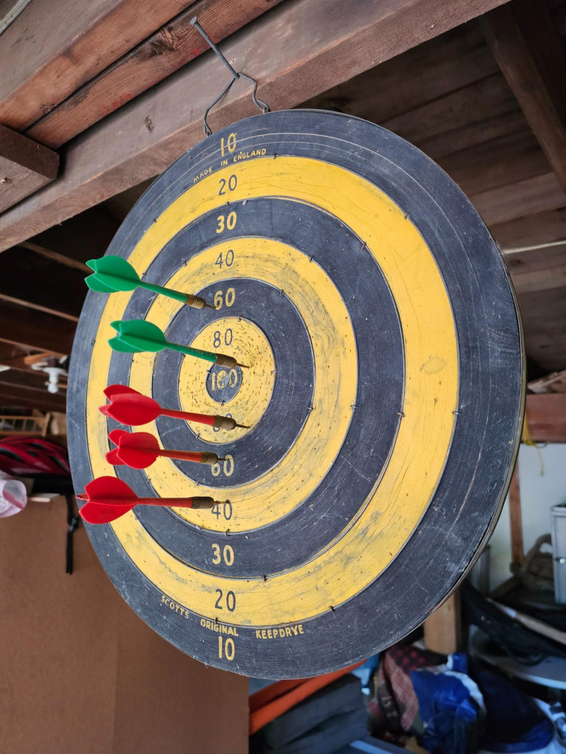 Vintage Scotts Original Keepdrye Dartboard & 5 Darts Double-sided Dartboard made in England for Sportcraft Includes 5 darts (2 green, 3 red) 18.5" Round The backside (checkerboard side) has been well used (see pics)
