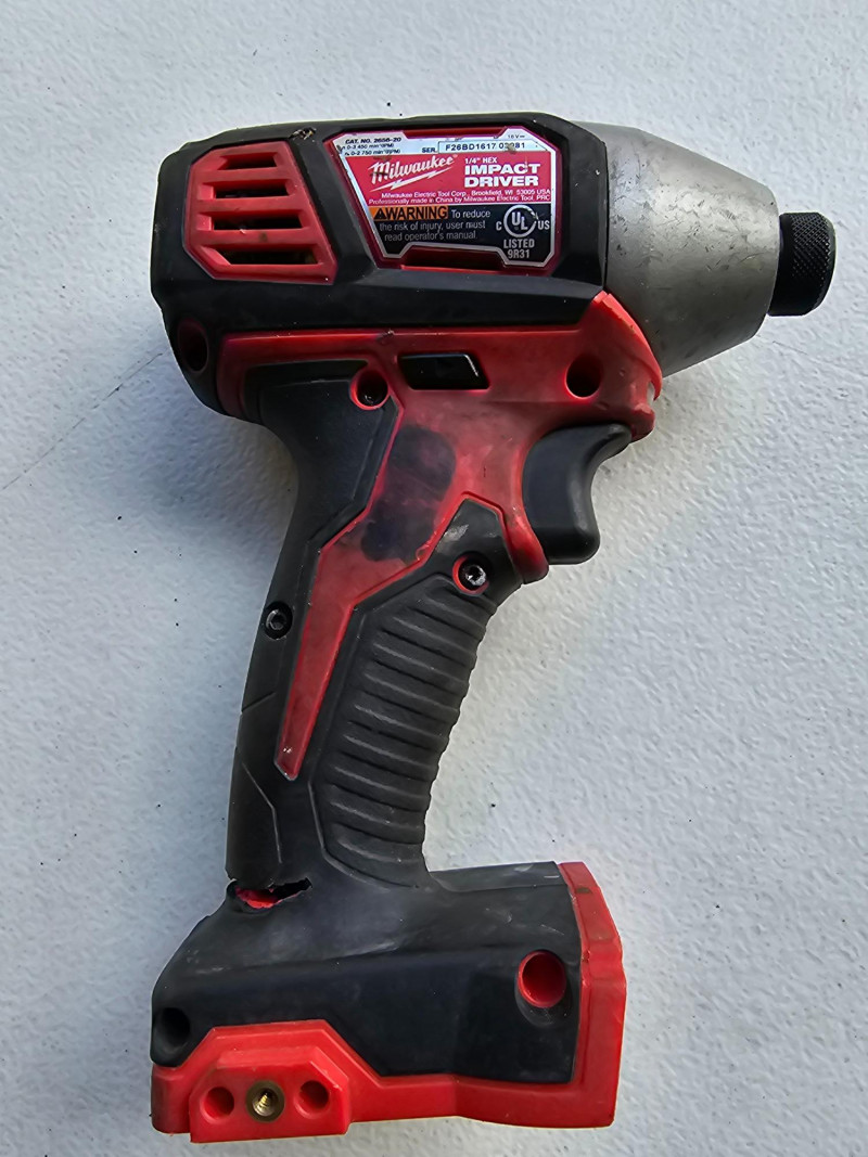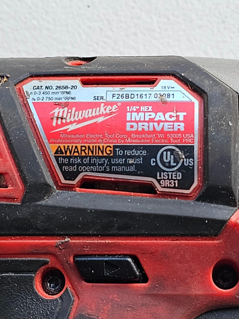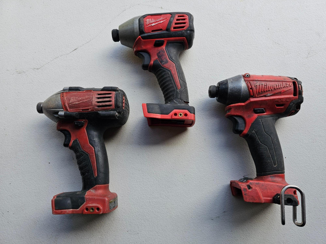 (3) Milwaukee 18V 1/4" Impact Drivers (Tools Only) (1) Milwaukee #2656-20 (Cracked on handle) (1) Milwaukee FUEL Brushless (Scrapes on body) (1) Milwaukee #2650-20 (Looks to be in the best condition of the 3) All in used condition (see pics) Untested - No Batteries Included