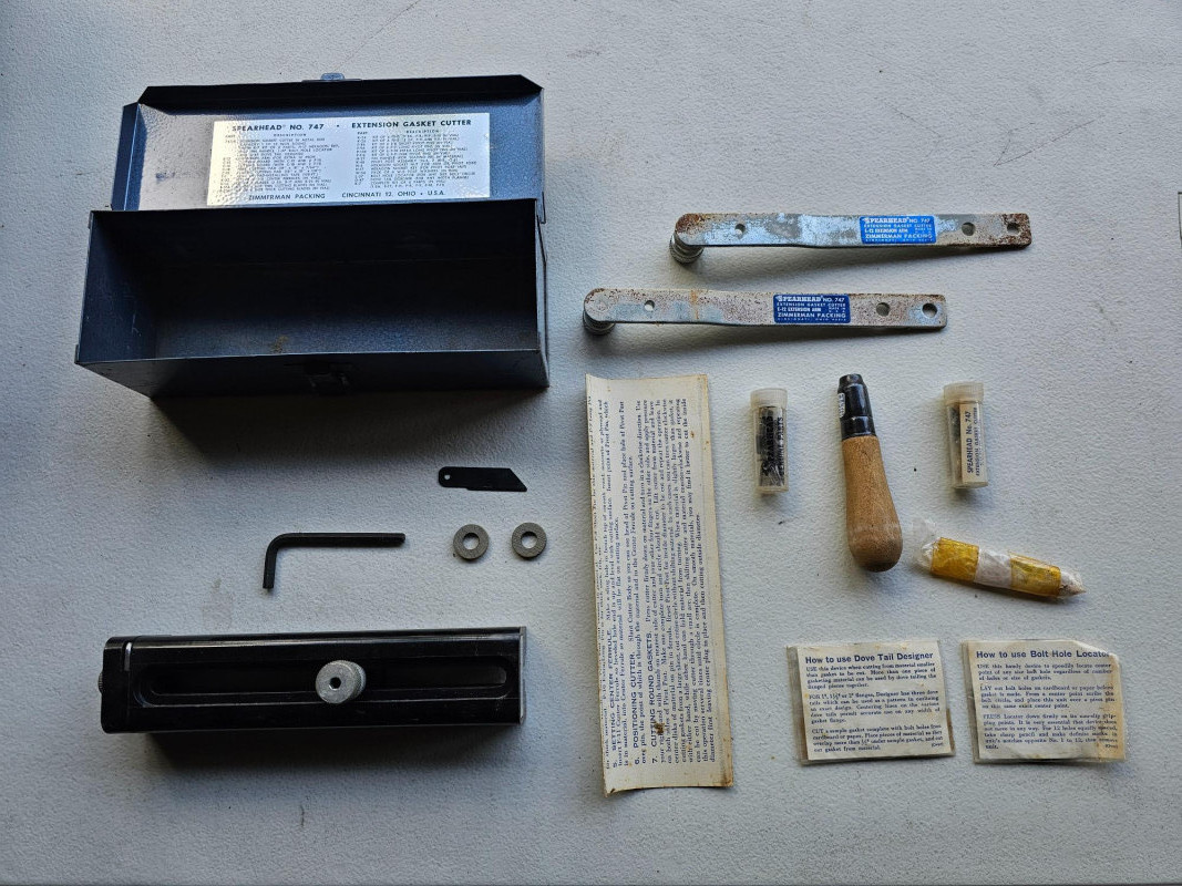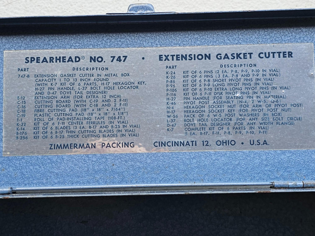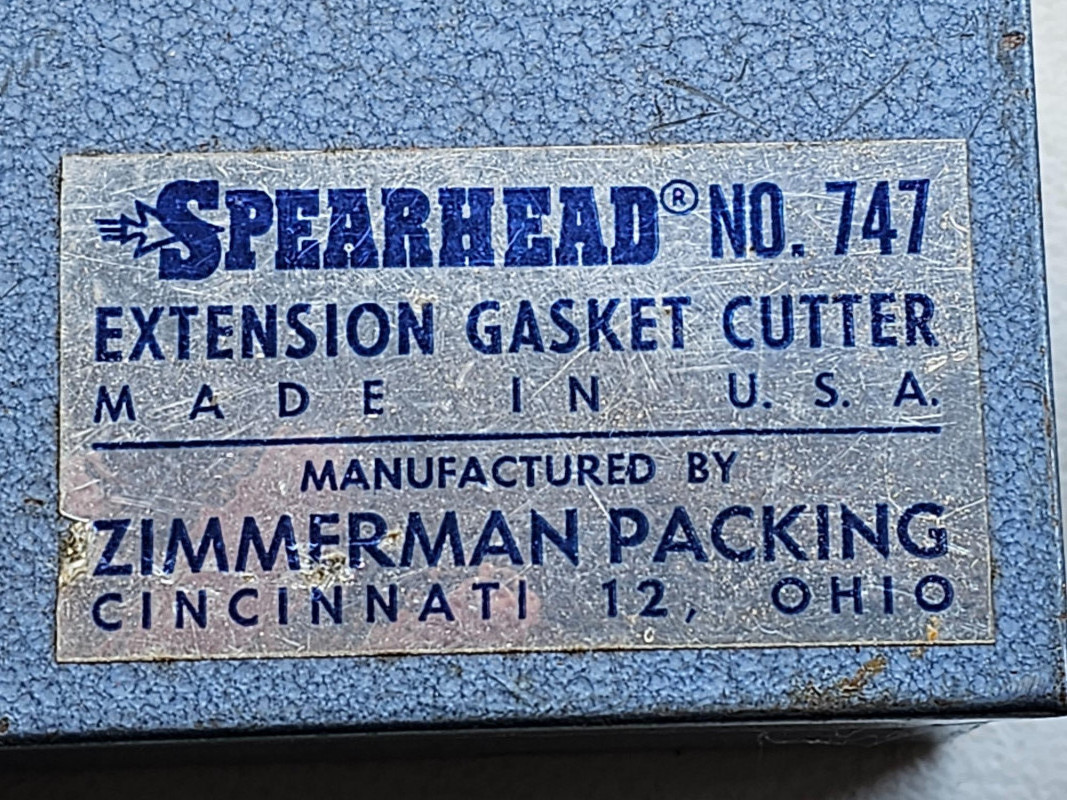 Spearhead No. 747 Extension Gasket Cutter Made in USA by Zimmerman Packing Includes everything you see in original metal box and instructions In used condition Untested!