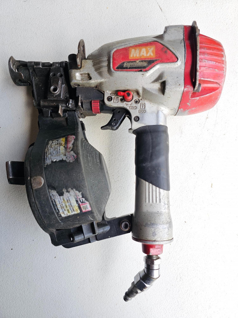 MAX SuperRoofer Coil Roofing Nailer Model #CN445R3 Pneumatic Fastner length: 3/4" - 1.75" Weight: 5.2lbs Some damage noted in pics on the coil can Untested!