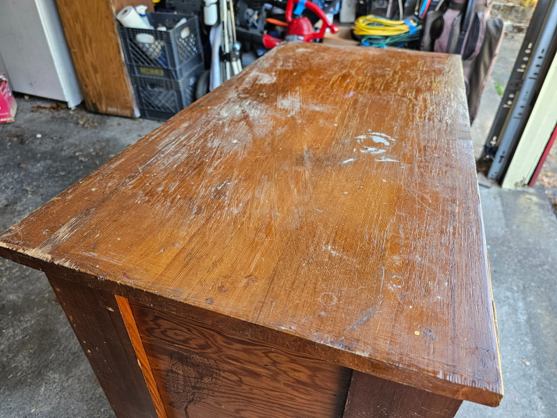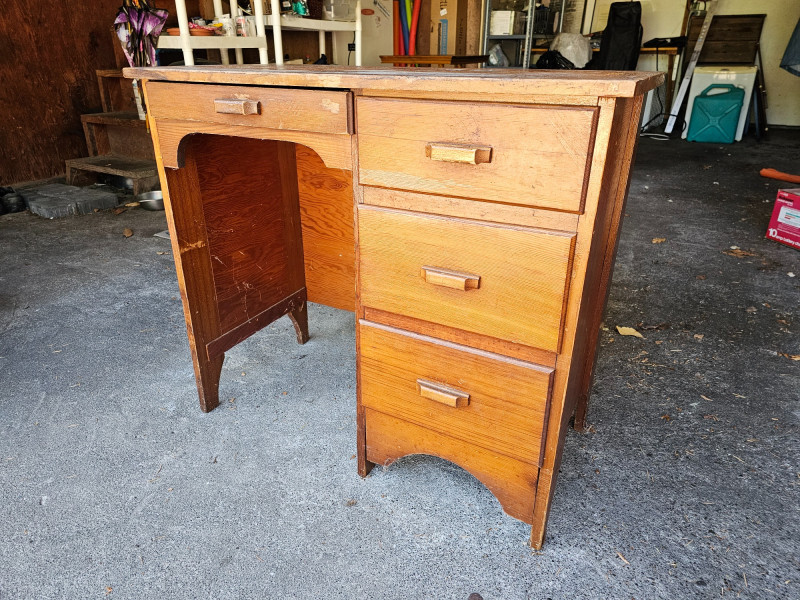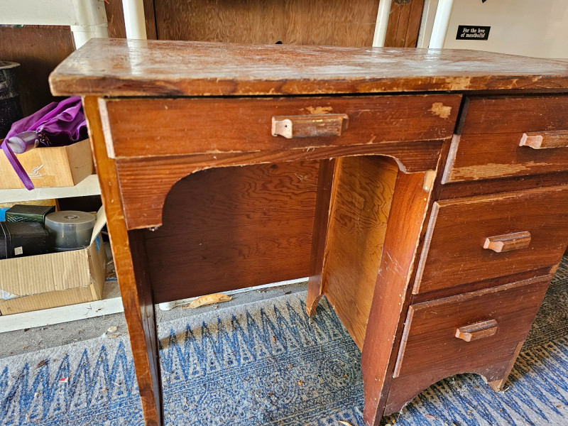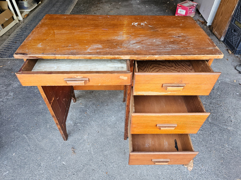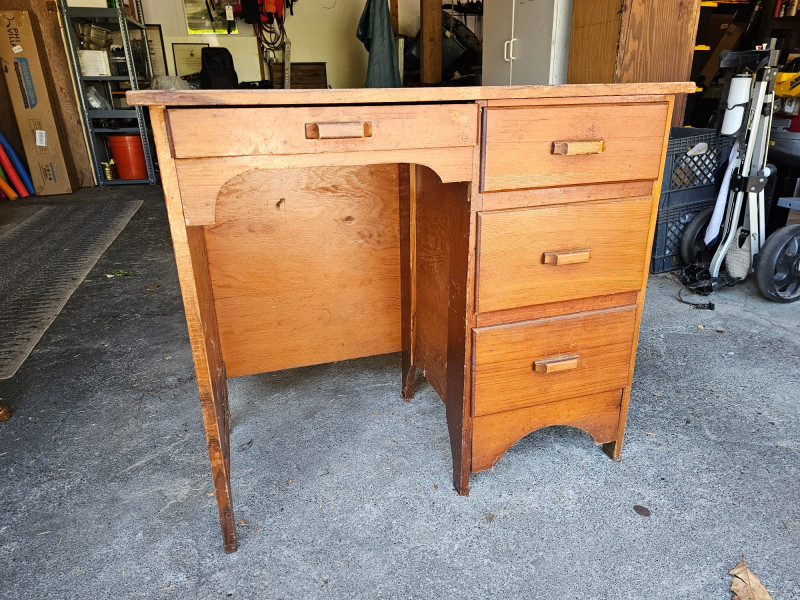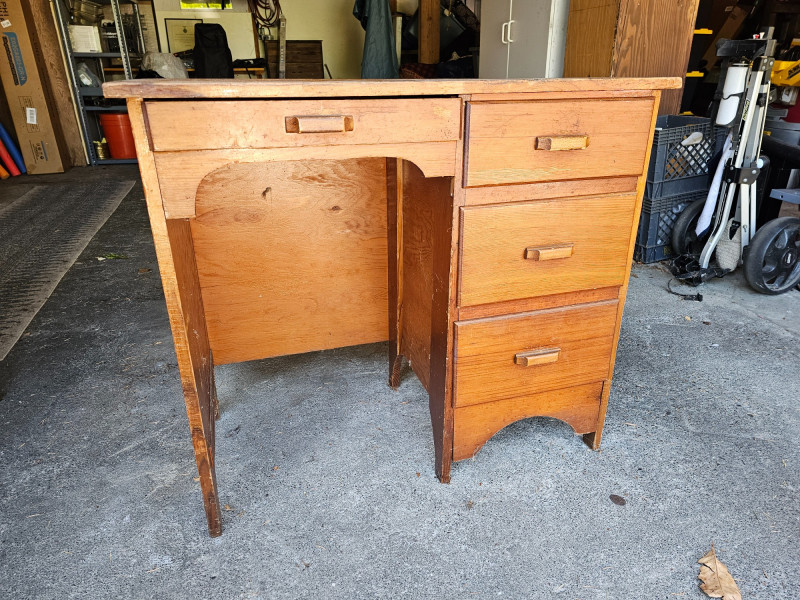 Antique Wooden 4-Drawer Child's Desk Smaller size desk seems ideal for younger students or repurposed, perhaps a bill-pay station? Use as-is or possible candidate for refinishing See pics for condition, has some issues 30"T x 34.25"W x 17.24"D