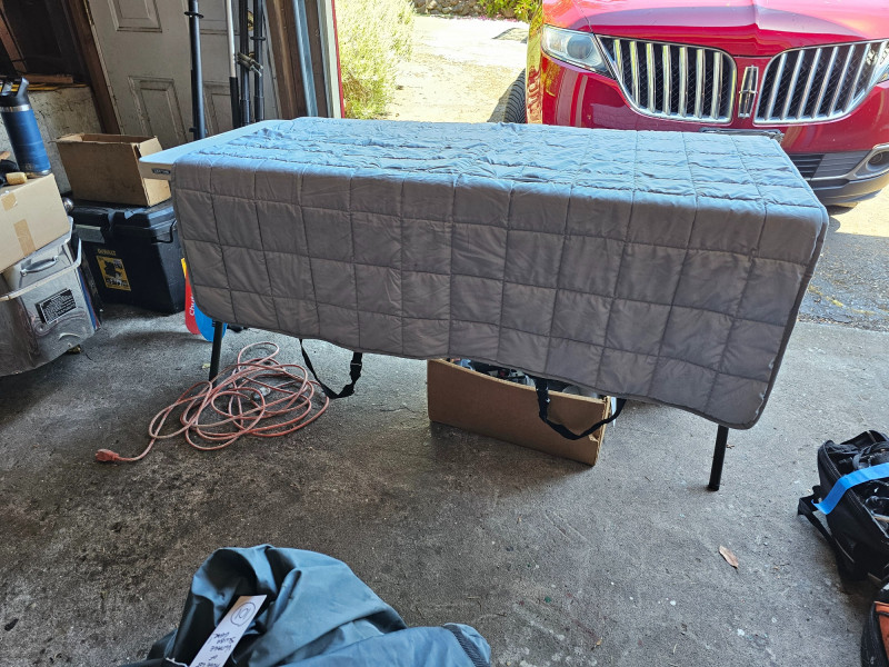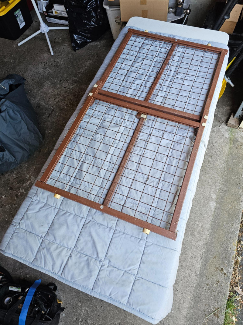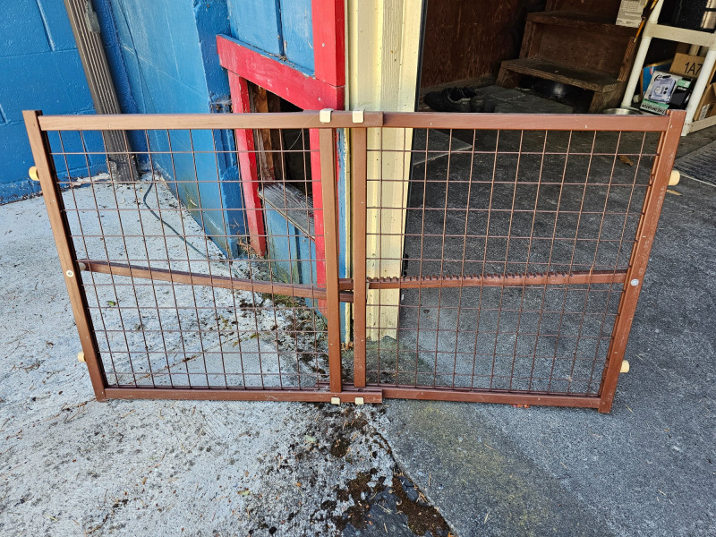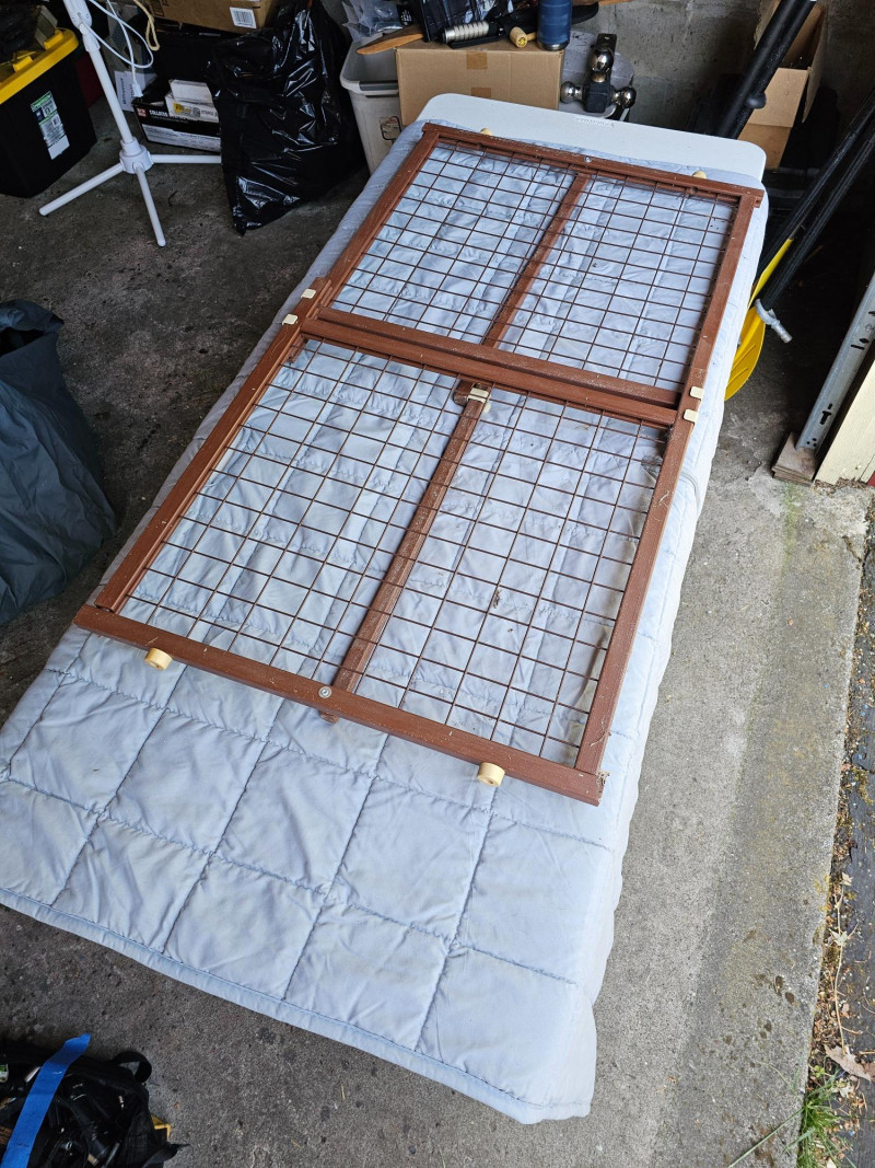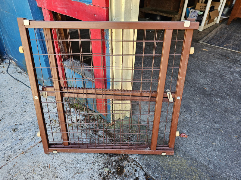 Wood Frame Pet/Baby Gate & Pet Car Seat Protector Wood Frame Pet/Baby Gate - 23"T x 42"W (expanded) Quilted Gray Cloth Pet Car Seat Protector - 57"T x 55"W All straps are intact Both in good used condition!