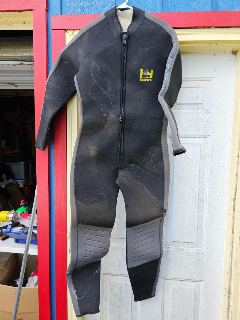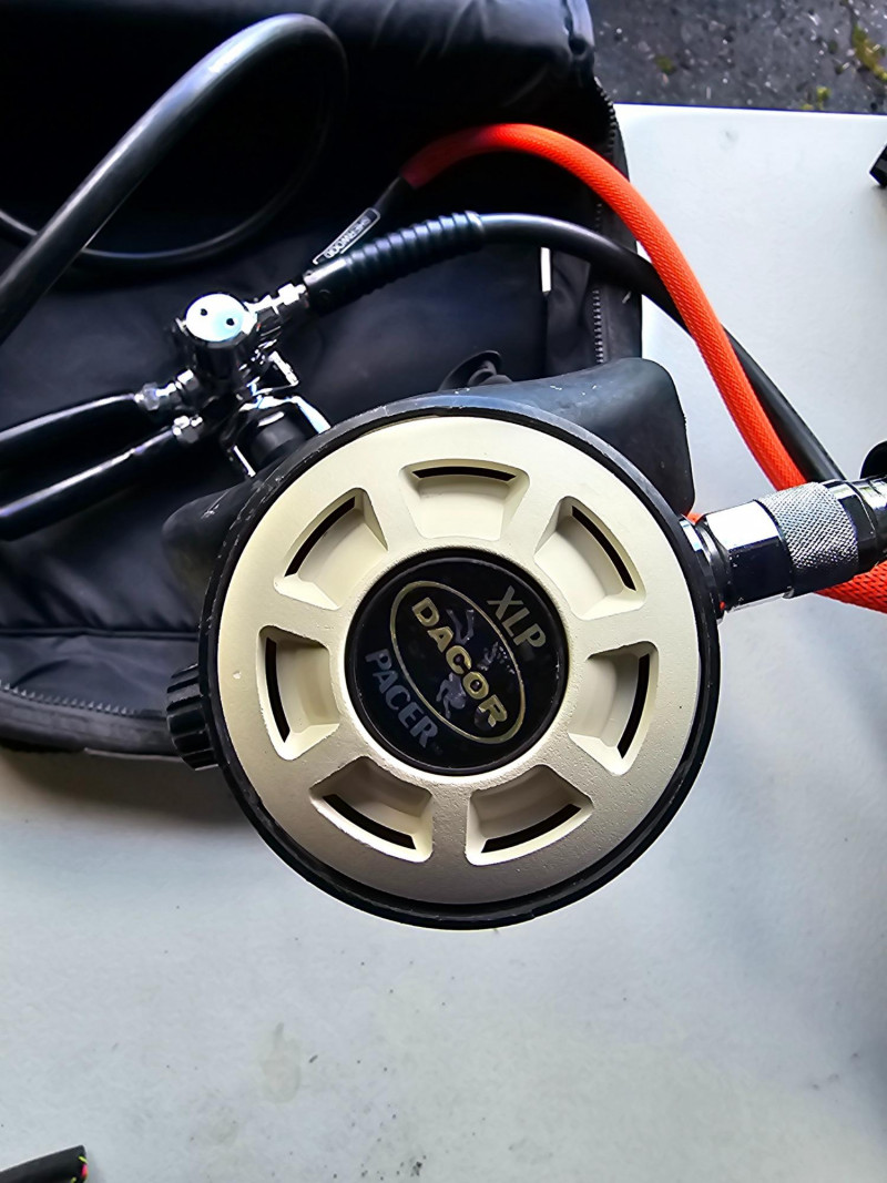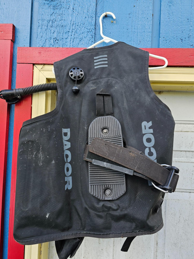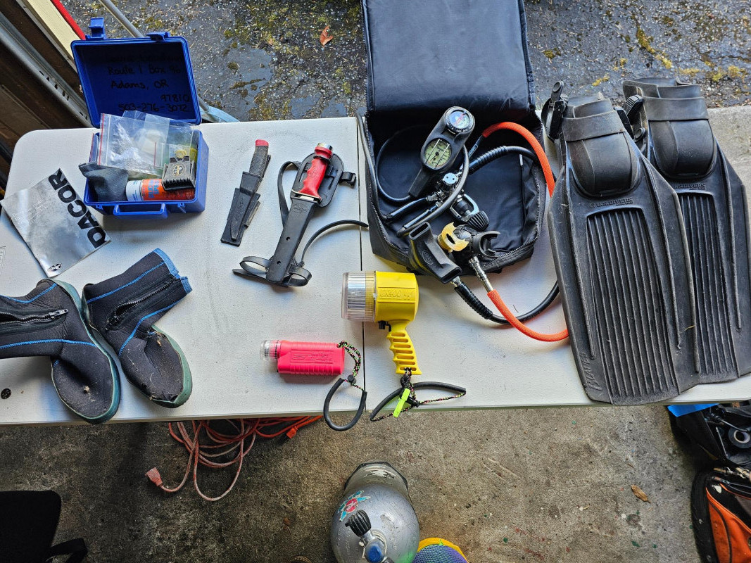 Vintage Scuba Diving Gear Dacor Enduro Buoyancy Control Device Vest Harvey's Full Wetsuit (left leg has damage) Harvey's Sleeveless Wetsuit Dacor XLP Pacer Regulator Sherwood Second Stage Regulator Oceanic 3-Gauge Console: compass (works), depth gauge, & pressure gauge) Wenoka Sea Style padded scuba diving regulator bag Pair of U.S. Divers Aqua-Lung Blades/Fins (Size XL) Dacor 7" Blade Dive Knife & Ankle Sheath Gage Technical Gear 4" Serrated Blade Knife & Clip Sheath Underwater Kinetics UK400 Dive Light (works) Underwater Kinetics SL4 Sun Light Oceanic Dive Boots (Size 12 - damaged with holes) (2) Vintage scuba tanks (last inspected in 1995) Large Gray Dive Gear Bag Items are dirty from many years of storage in a garage. No guarantee on functionality due to these items being about 30 years old. Consider these items needing proper maintenance, inspections, and testing before use.