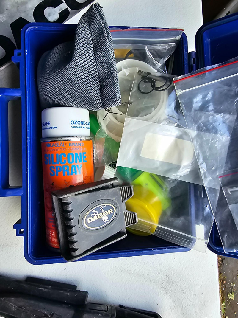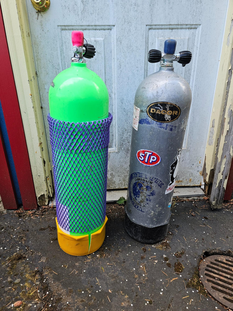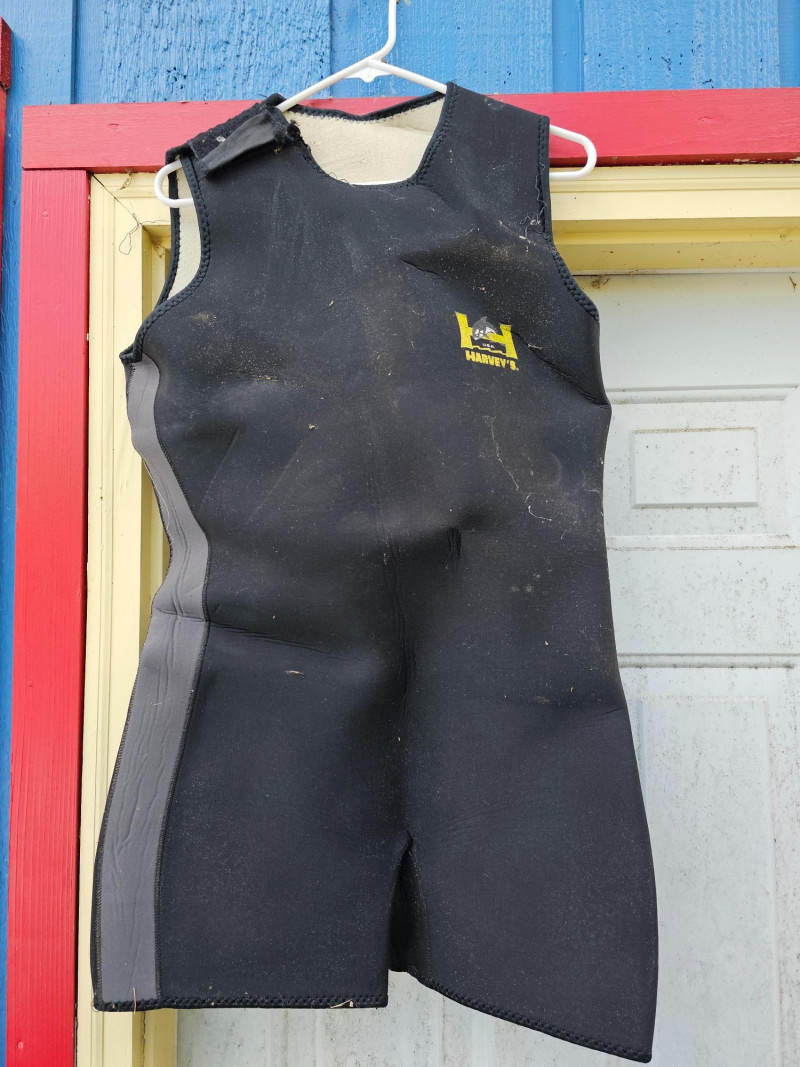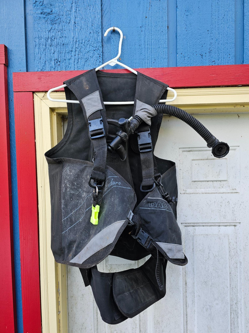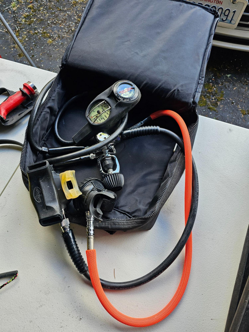 Vintage Scuba Diving Gear Dacor Enduro Buoyancy Control Device Vest Harvey's Full Wetsuit (left leg has damage) Harvey's Sleeveless Wetsuit Dacor XLP Pacer Regulator Sherwood Second Stage Regulator Oceanic 3-Gauge Console: compass (works), depth gauge, & pressure gauge) Wenoka Sea Style padded scuba diving regulator bag Pair of U.S. Divers Aqua-Lung Blades/Fins (Size XL) Dacor 7" Blade Dive Knife & Ankle Sheath Gage Technical Gear 4" Serrated Blade Knife & Clip Sheath Underwater Kinetics UK400 Dive Light (works) Underwater Kinetics SL4 Sun Light Oceanic Dive Boots (Size 12 - damaged with holes) (2) Vintage scuba tanks (last inspected in 1995) Large Gray Dive Gear Bag Items are dirty from many years of storage in a garage. No guarantee on functionality due to these items being about 30 years old. Consider these items needing proper maintenance, inspections, and testing before use.
