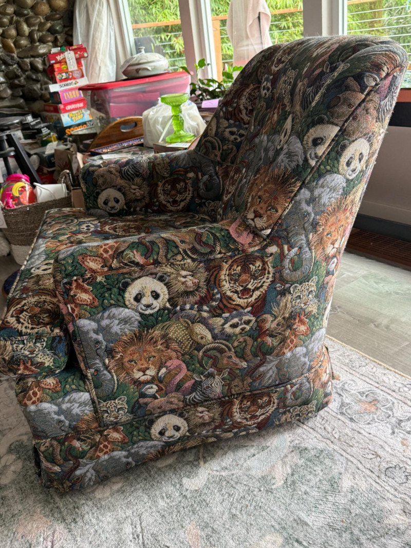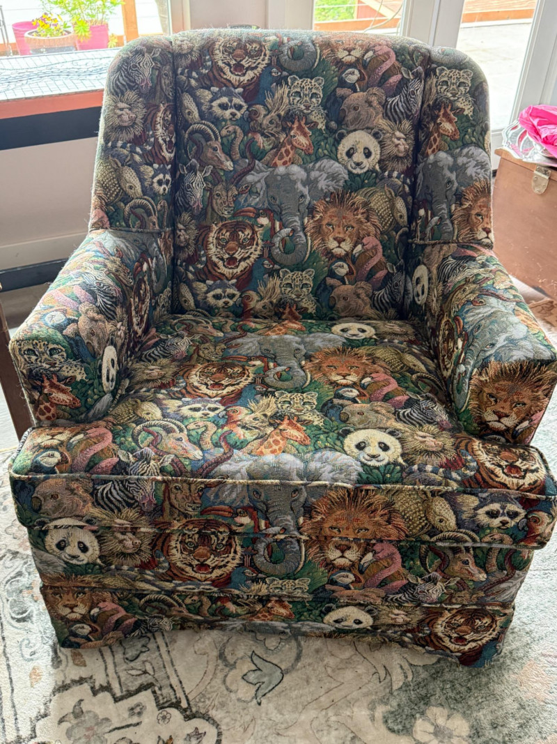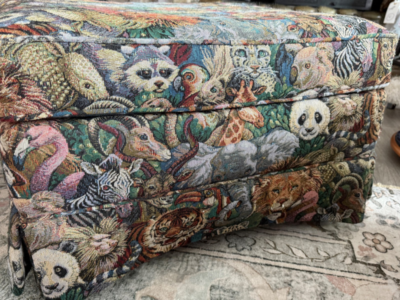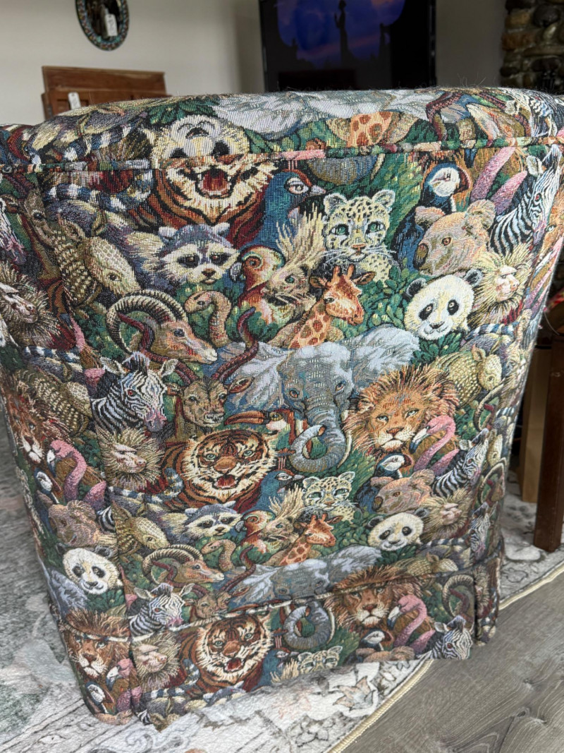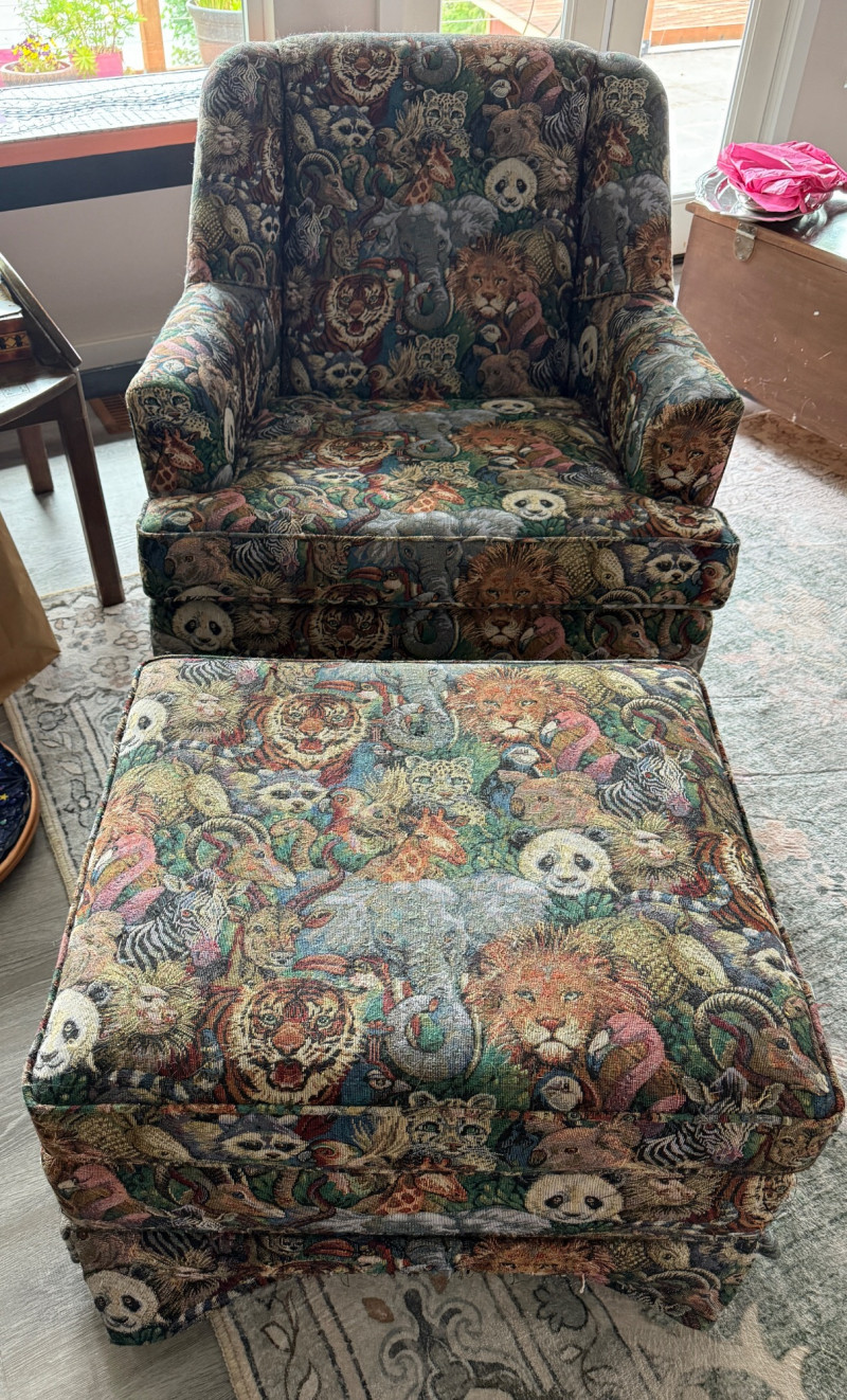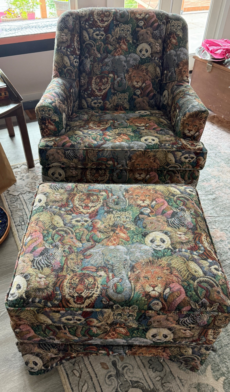 Safari Animal Print Chair and Ottoman. Stationary chair. A few pulled threads on the ottoman and chair seat cushion front. Includes arm rest covers. 32”x36”x33”