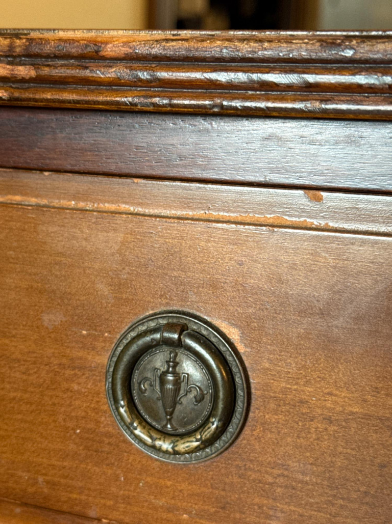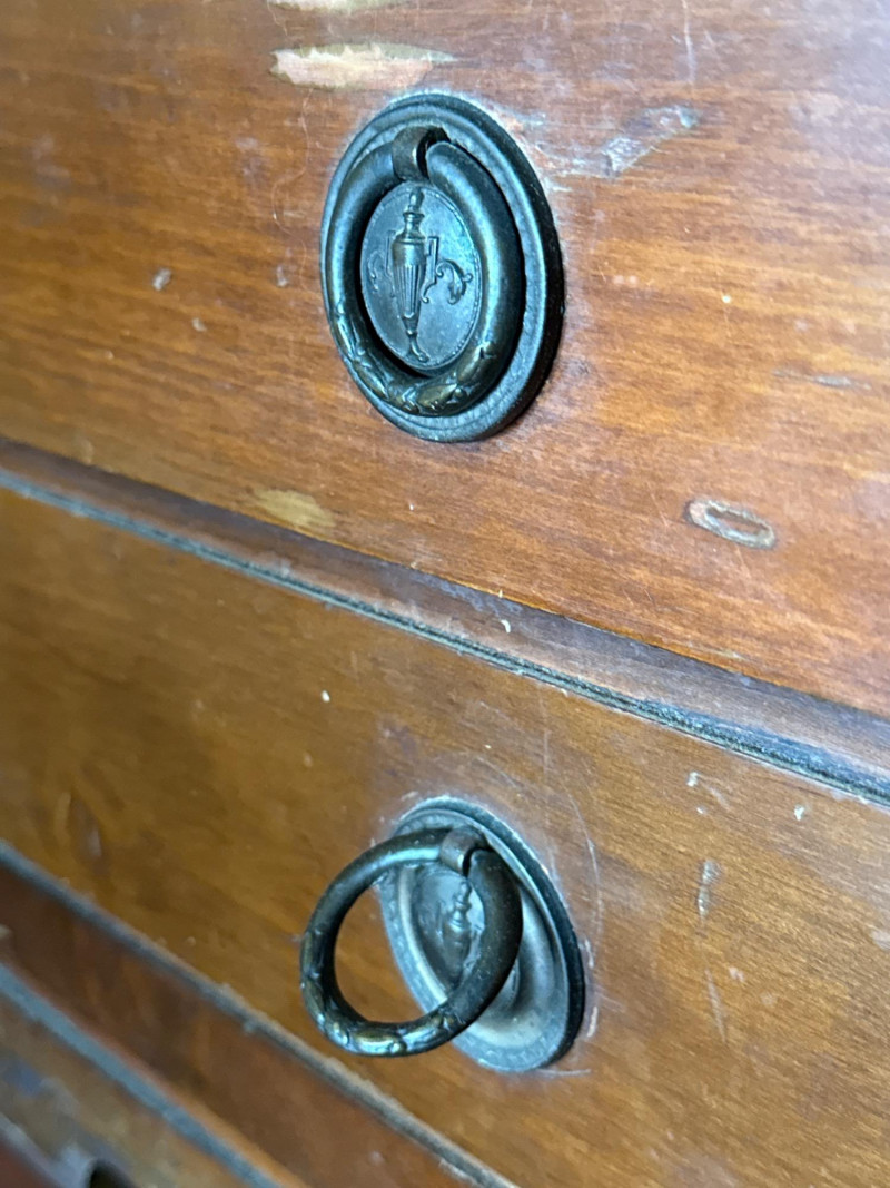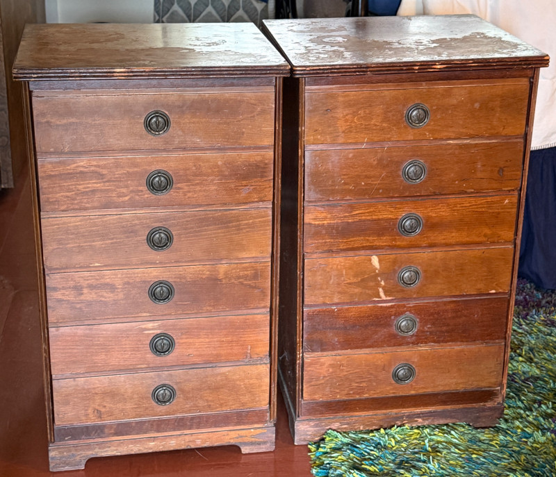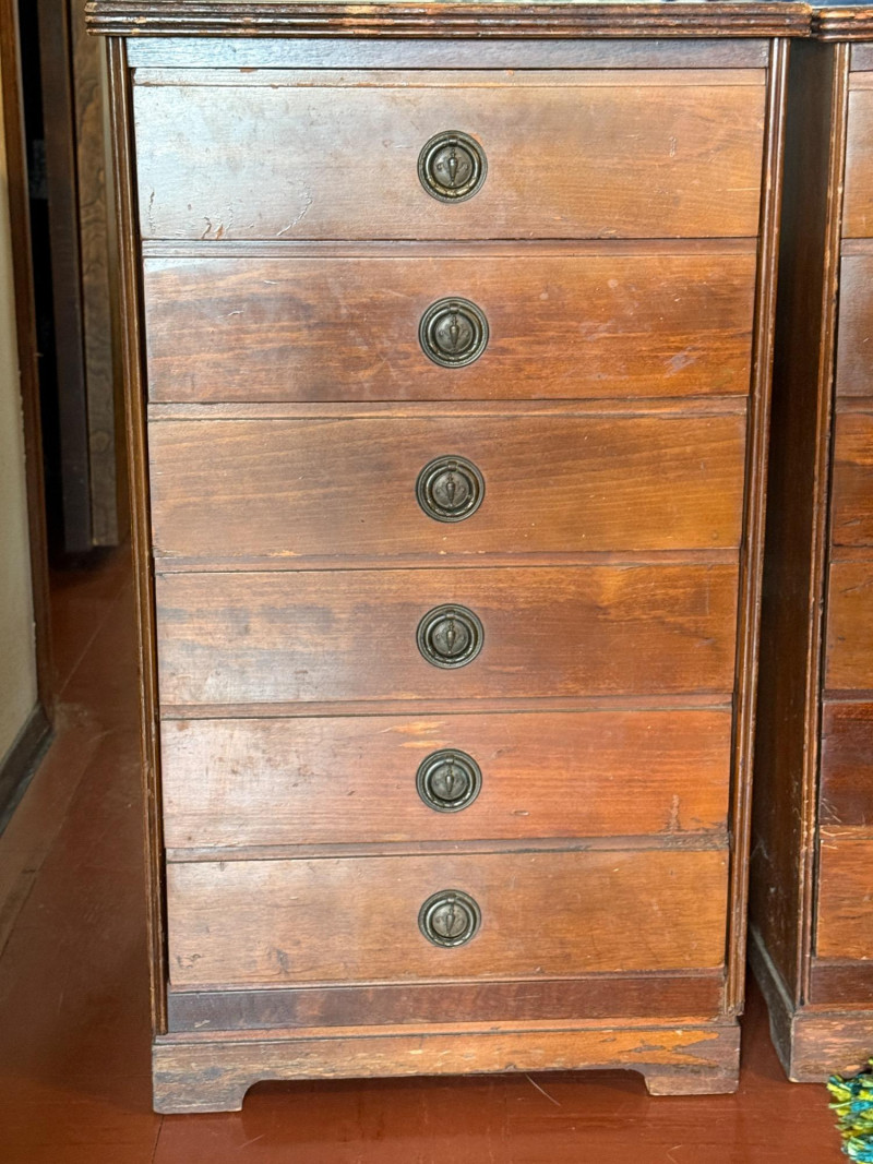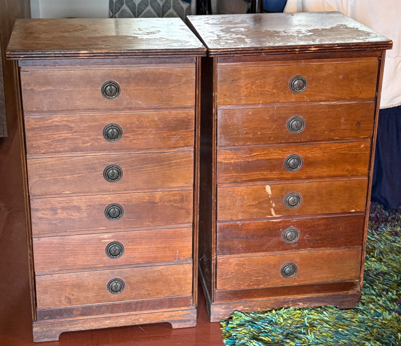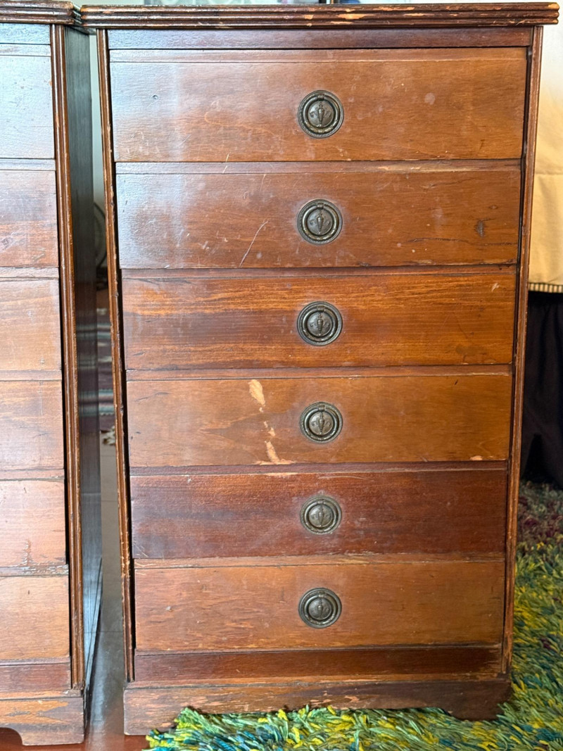 (2) Vintage Lingerie Chests with 6 Light Capacity Drawers. Used as nightstands. Each drawer has a hole in the bottom and has no sides. Ring pulls are antique brass, possibly Hepplewhite.