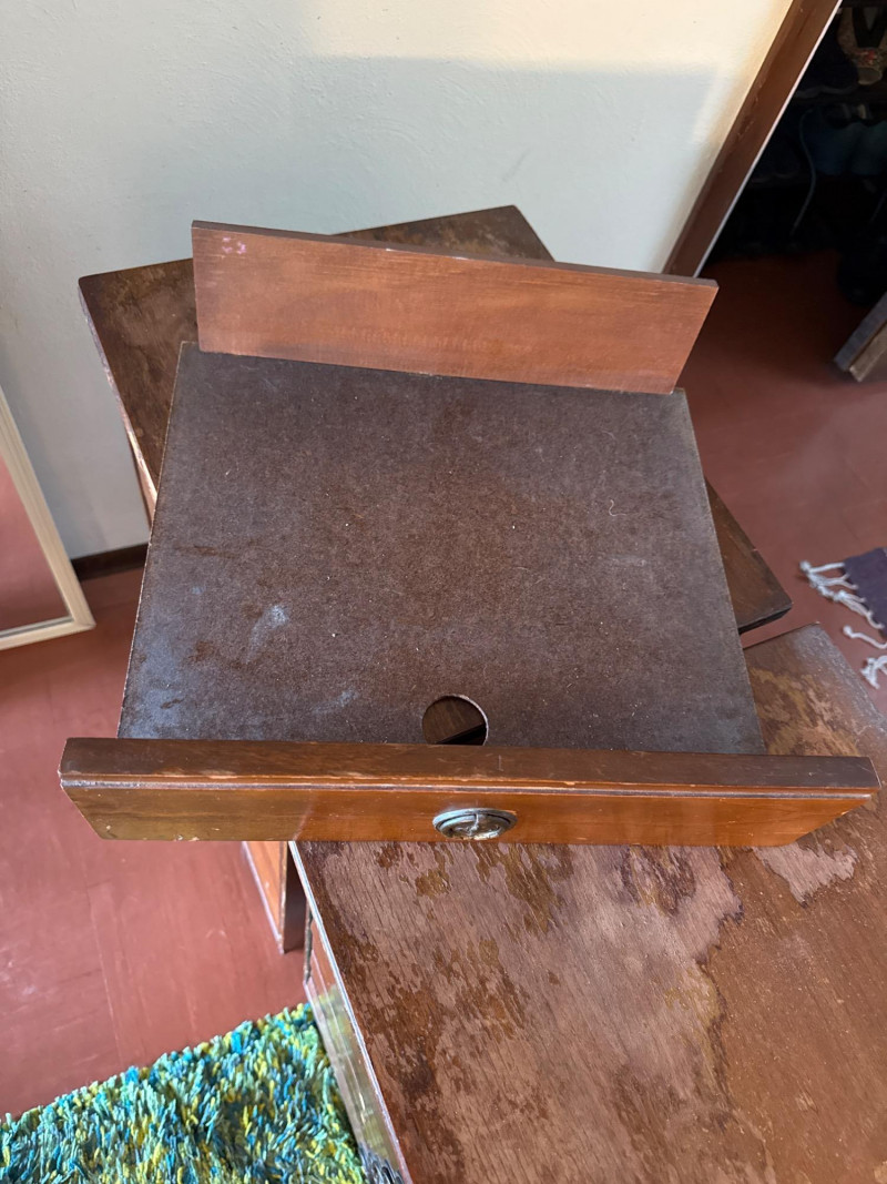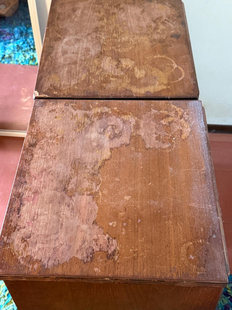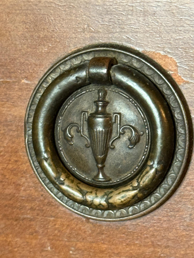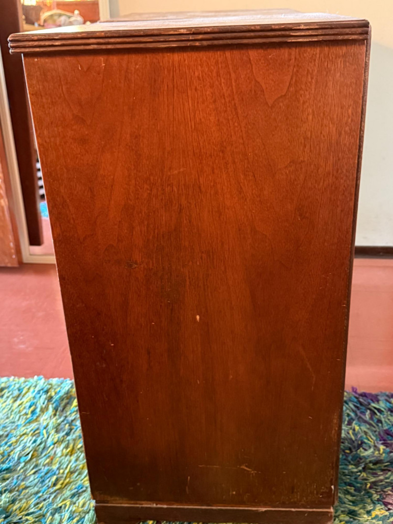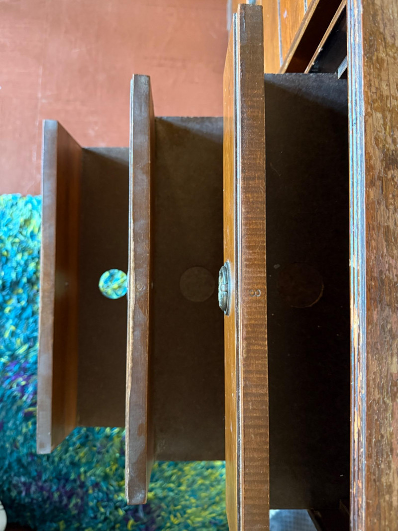 (2) Vintage Lingerie Chests with 6 Light Capacity Drawers. Used as nightstands. Each drawer has a hole in the bottom and has no sides. Ring pulls are antique brass, possibly Hepplewhite.