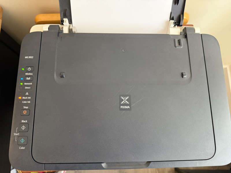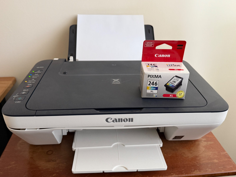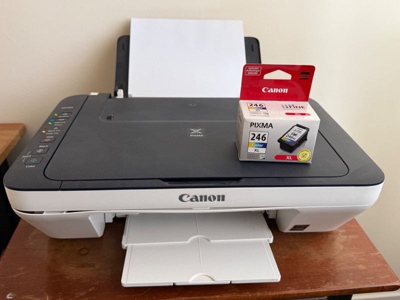 Canon Pixma Color Wireless Printer MG3022 with XL Cartridge and paper.