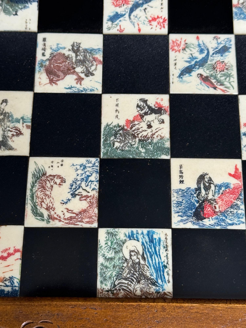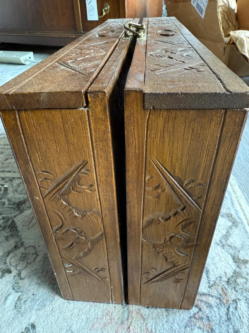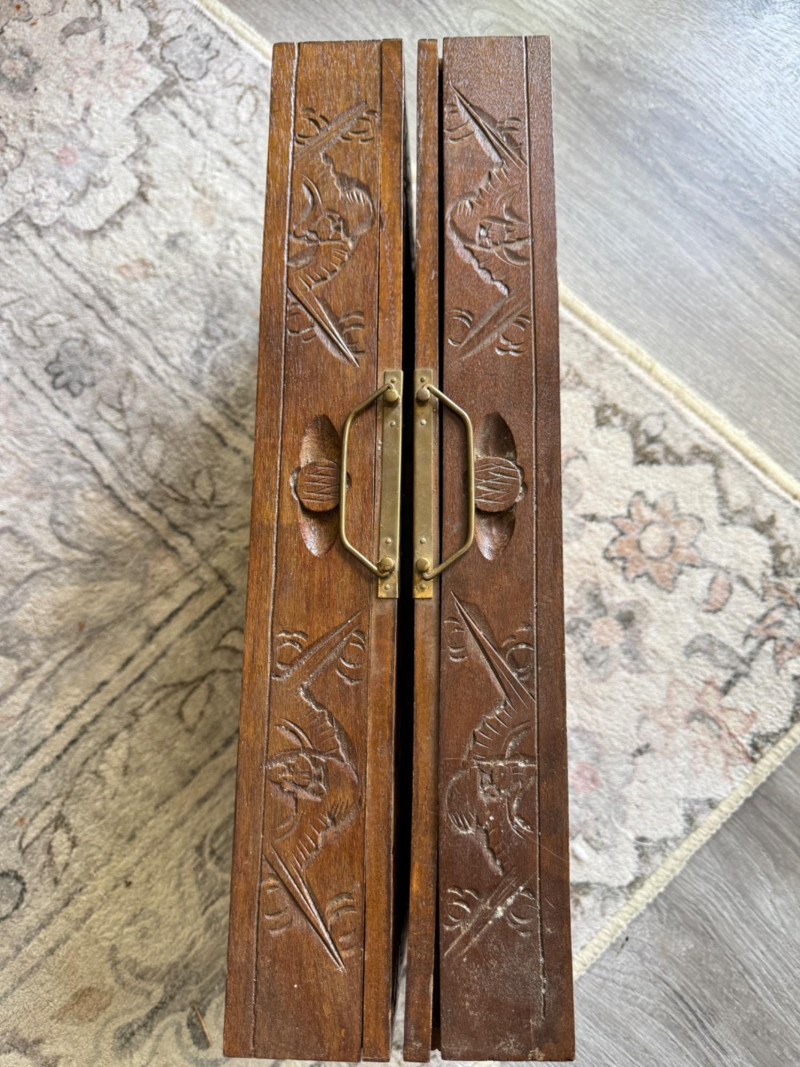 Hand carved folding wood storage case/game board with inlaid tile squares.