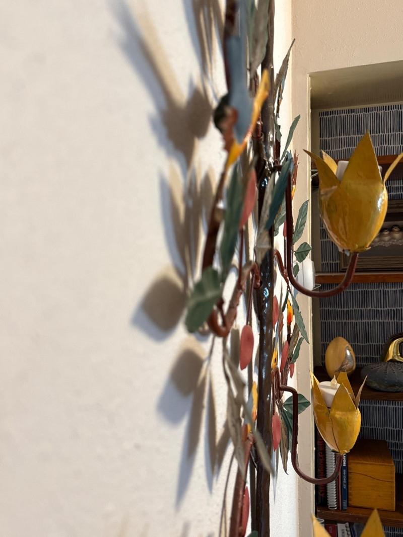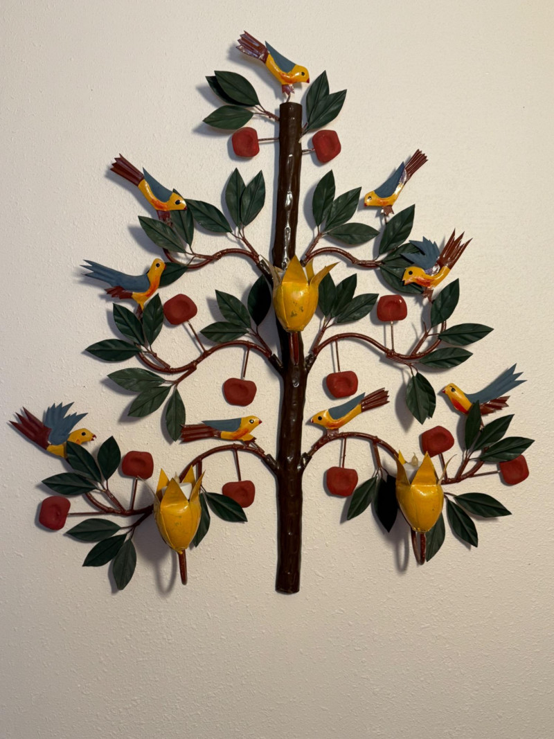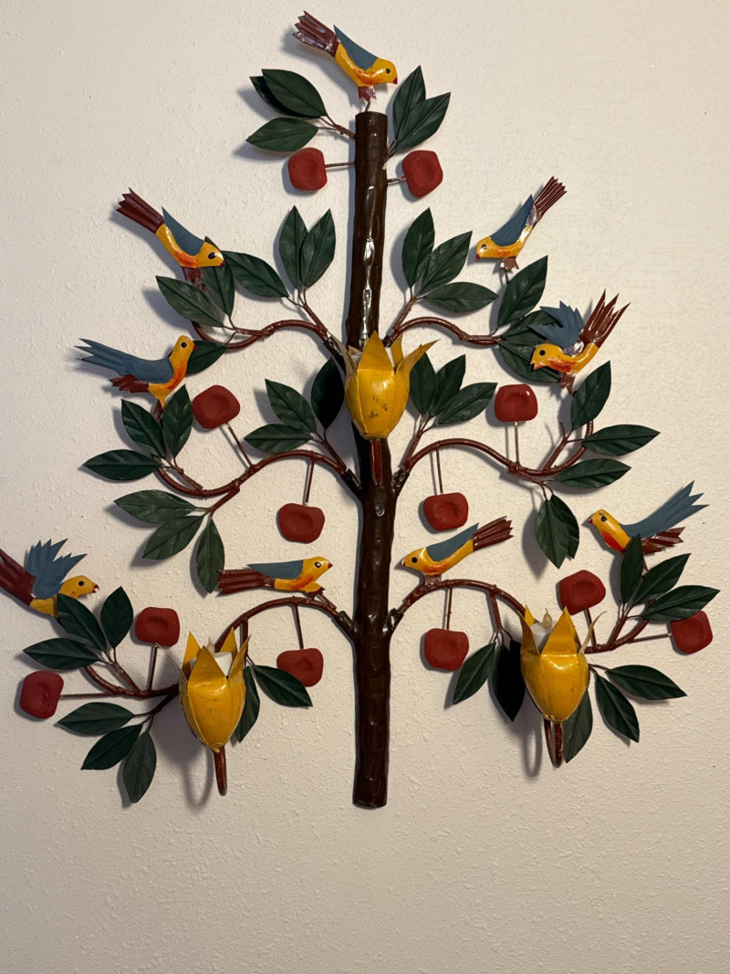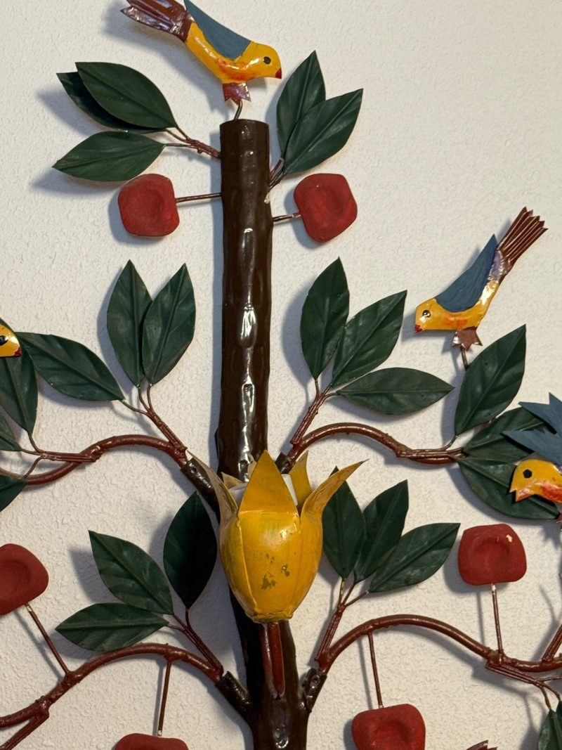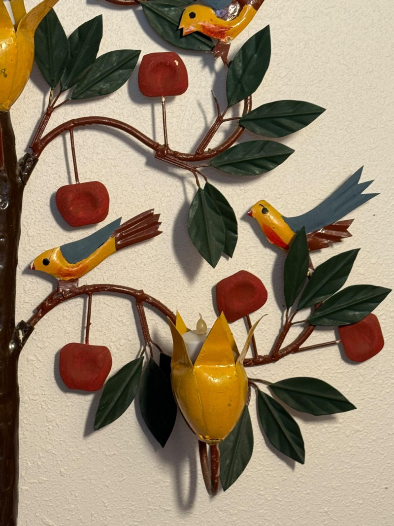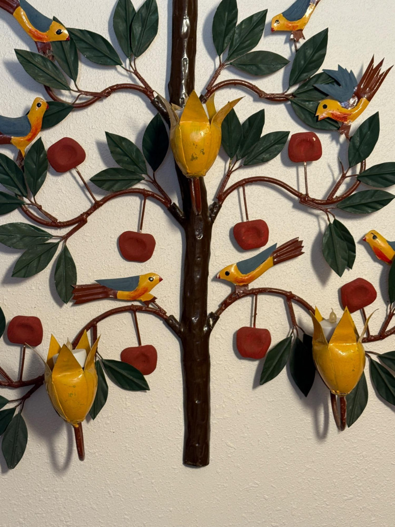 Metal Birds In a Tree Wall Hanging with 3 yellow candle cups. 27.5”x29”x5”