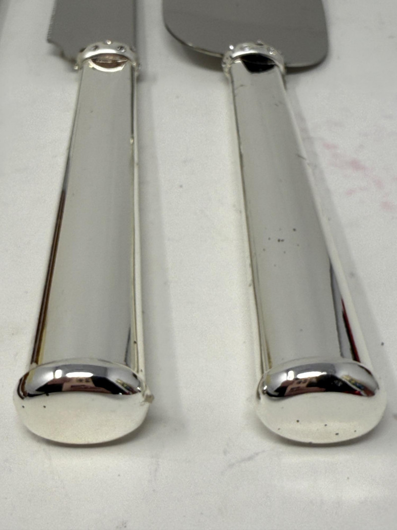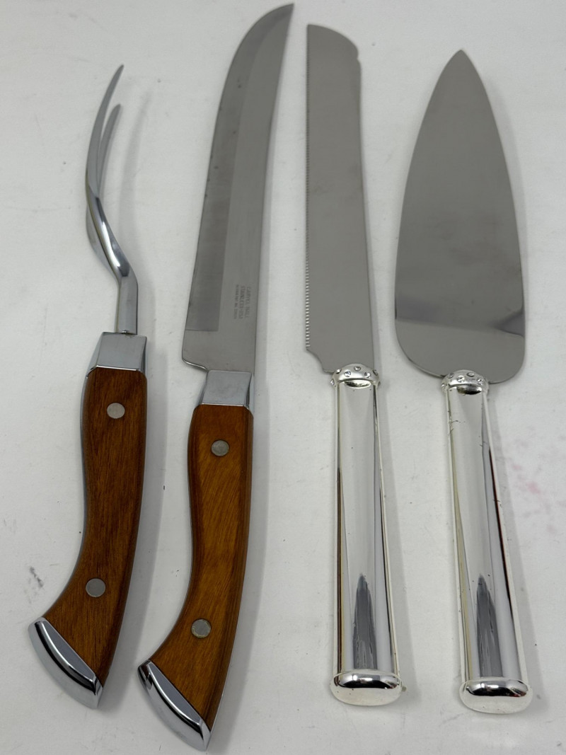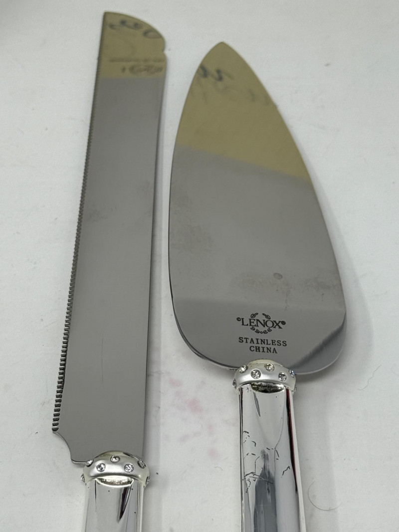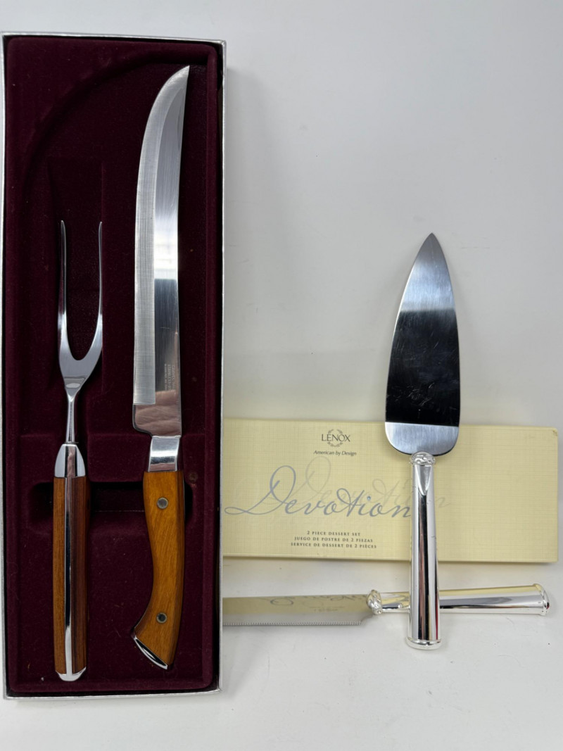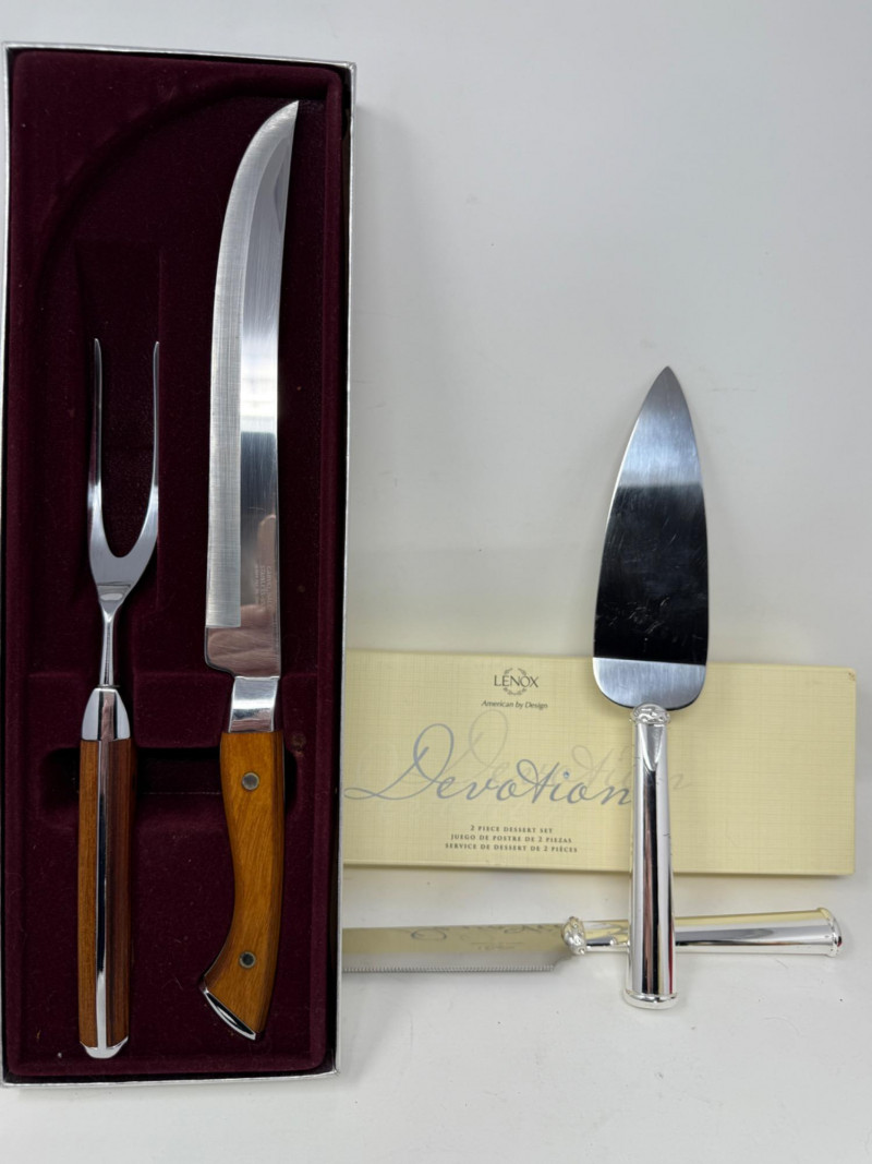 Carvel Hall Meat Carving Set in original box. Beautiful wood handles. Lenox Devotion Dessert Set has crystal accents on the top of the handles. In original box.
