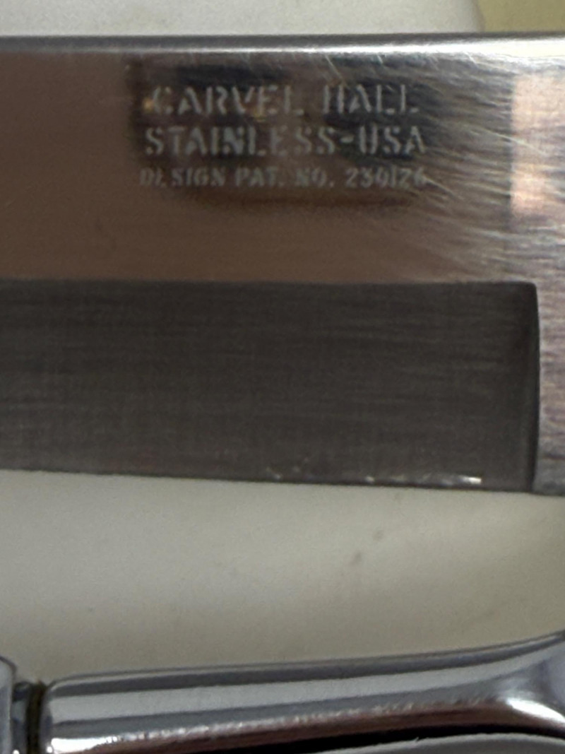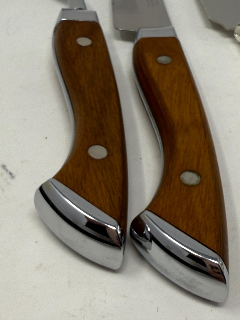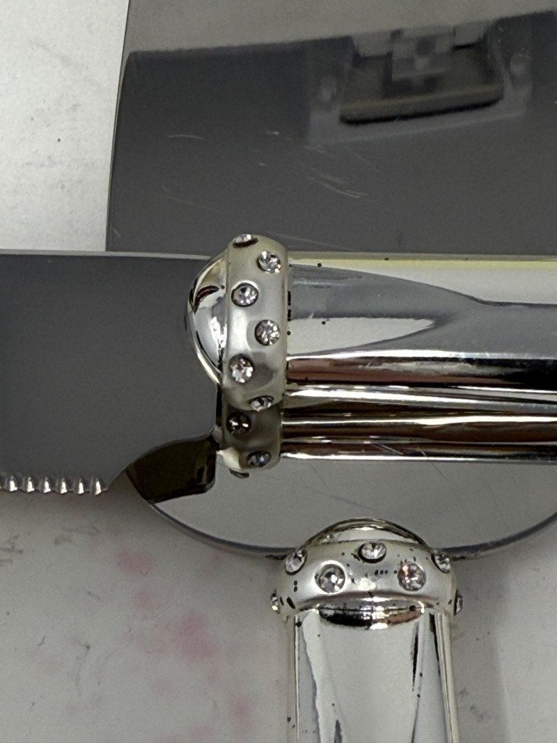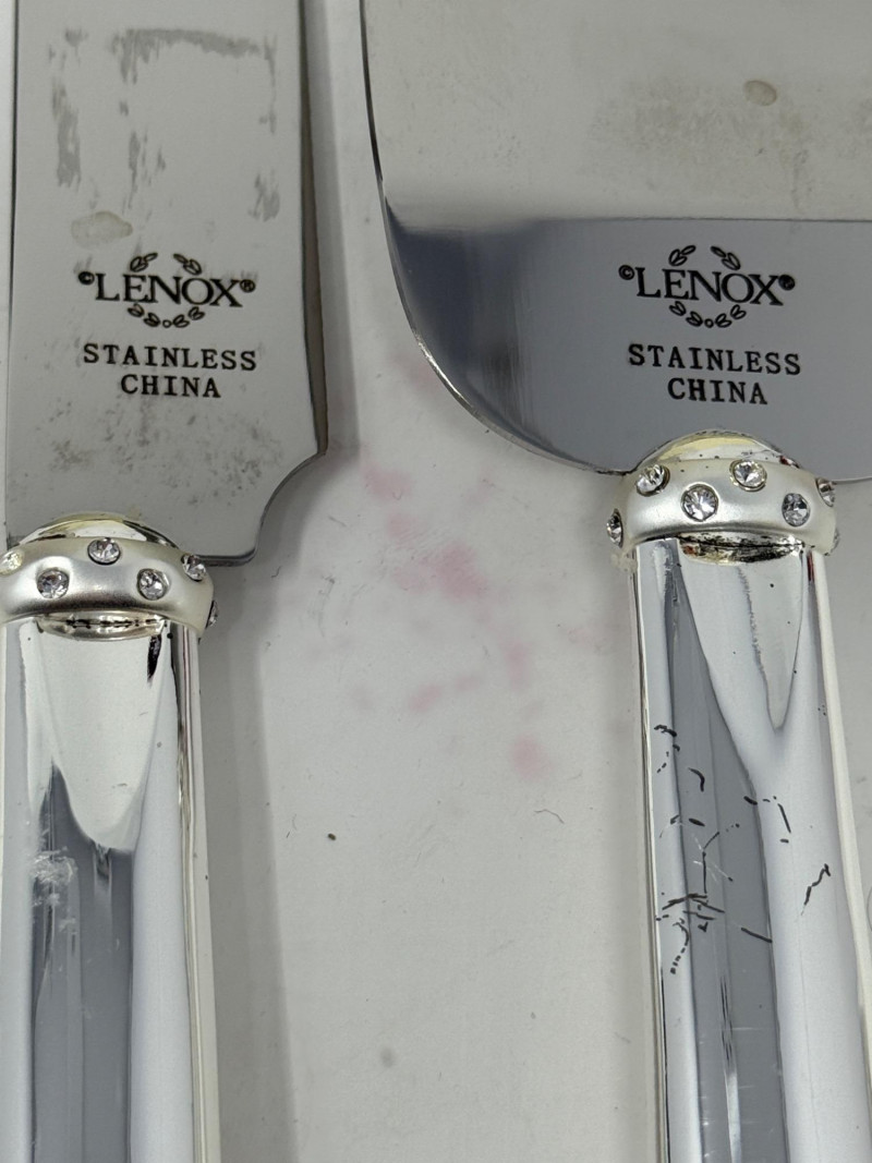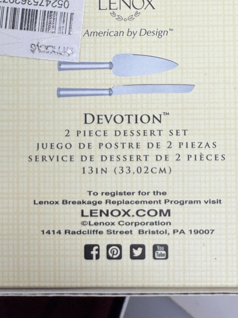 Carvel Hall Meat Carving Set in original box. Beautiful wood handles. Lenox Devotion Dessert Set has crystal accents on the top of the handles. In original box.