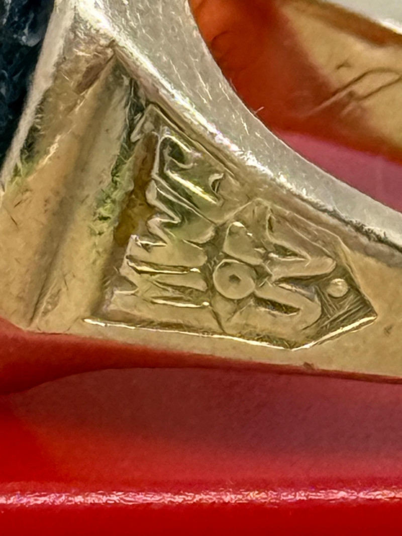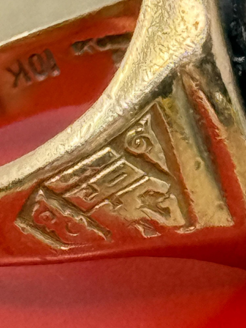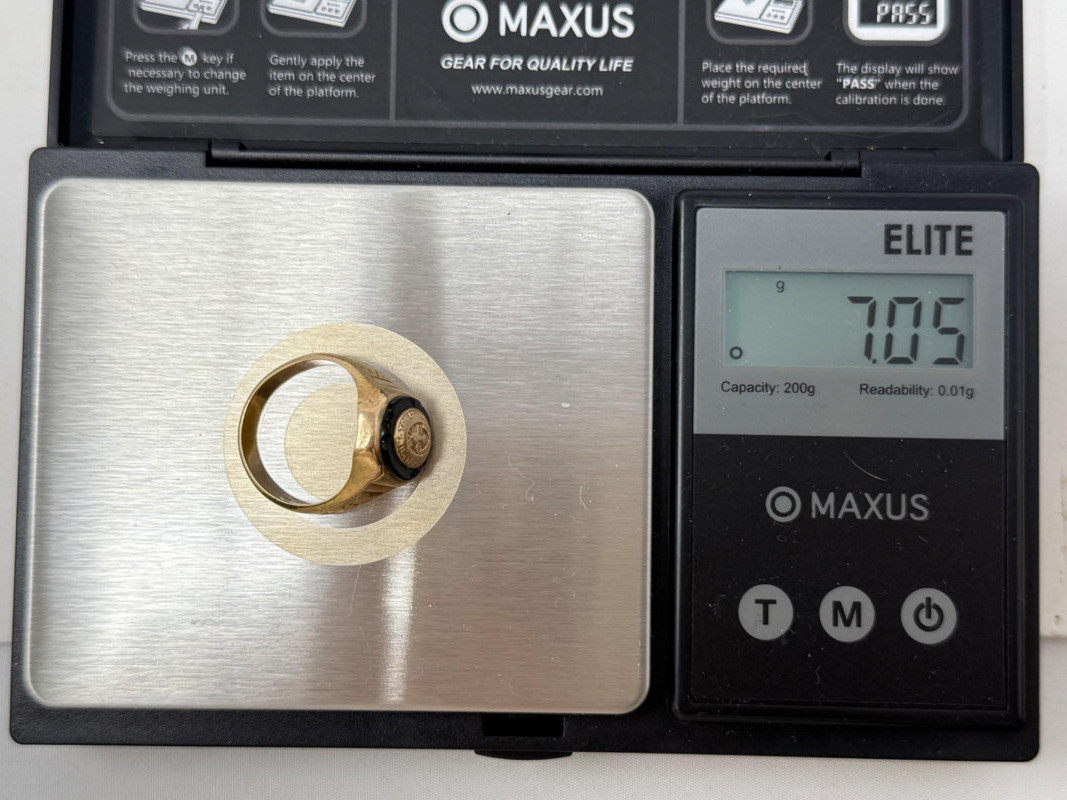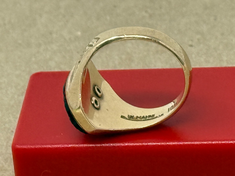 10K Gold Mary Washington College 1952 Class Ring with black onyx. Gold ring setting with cut band stamped with what appears to be 9ct