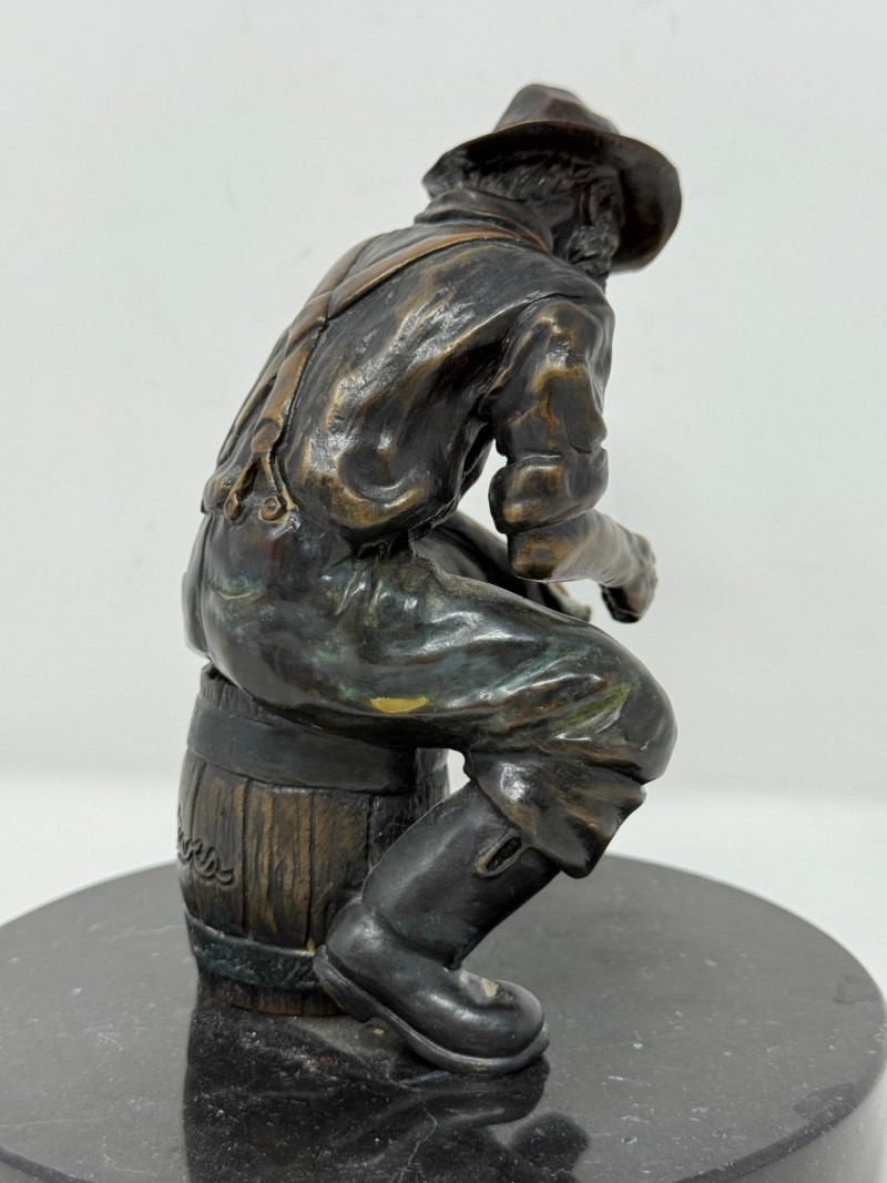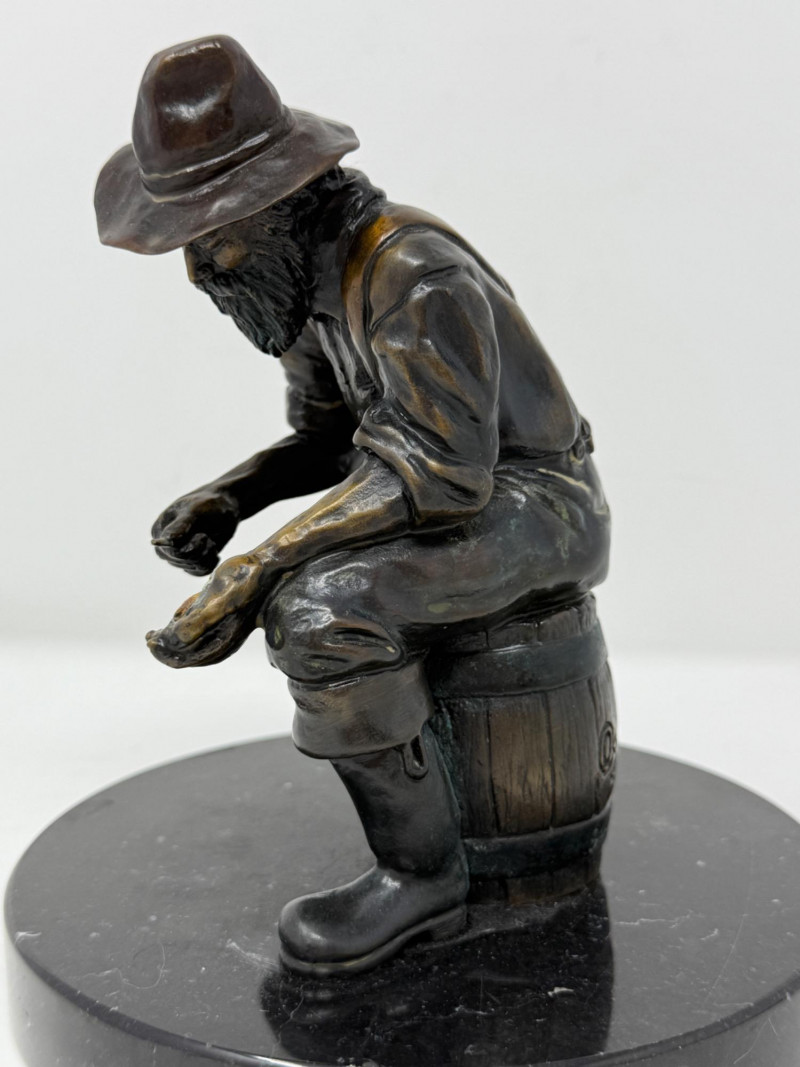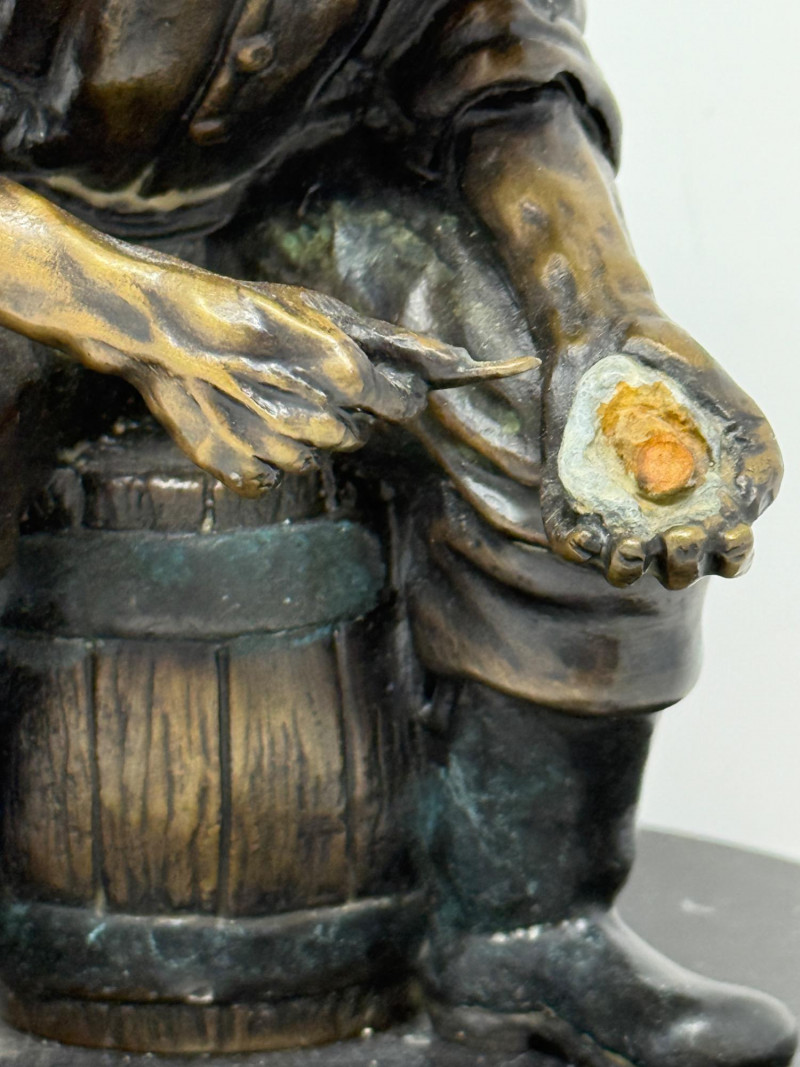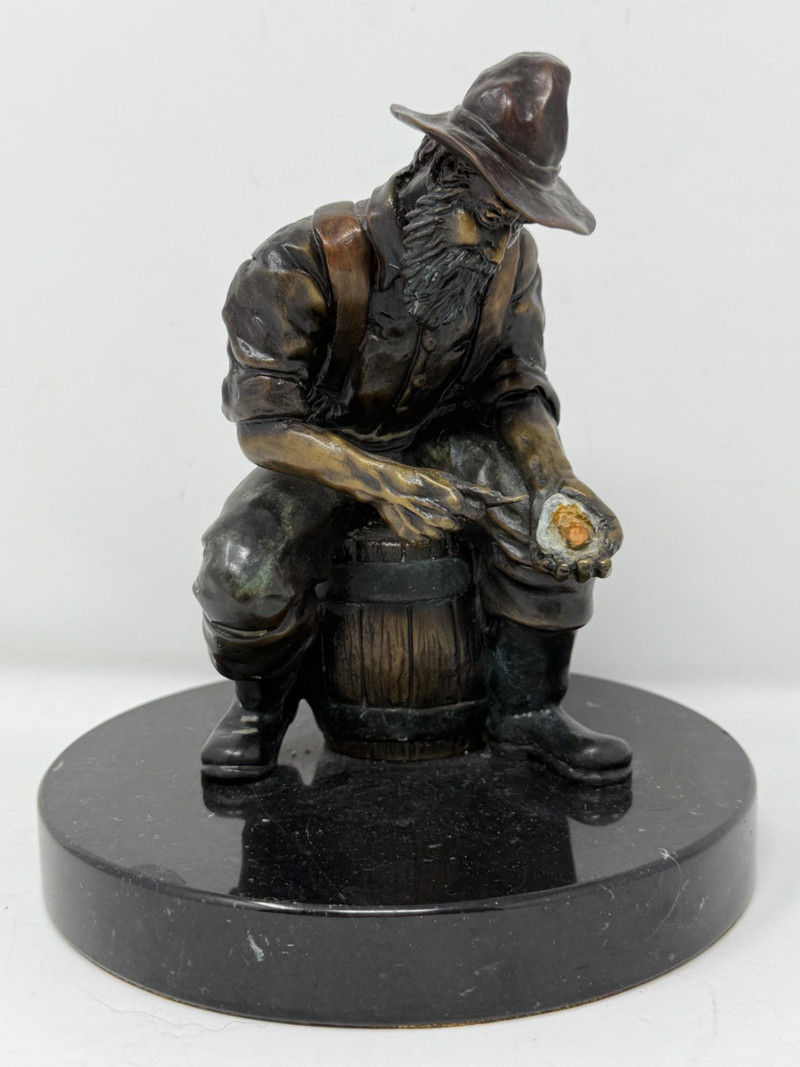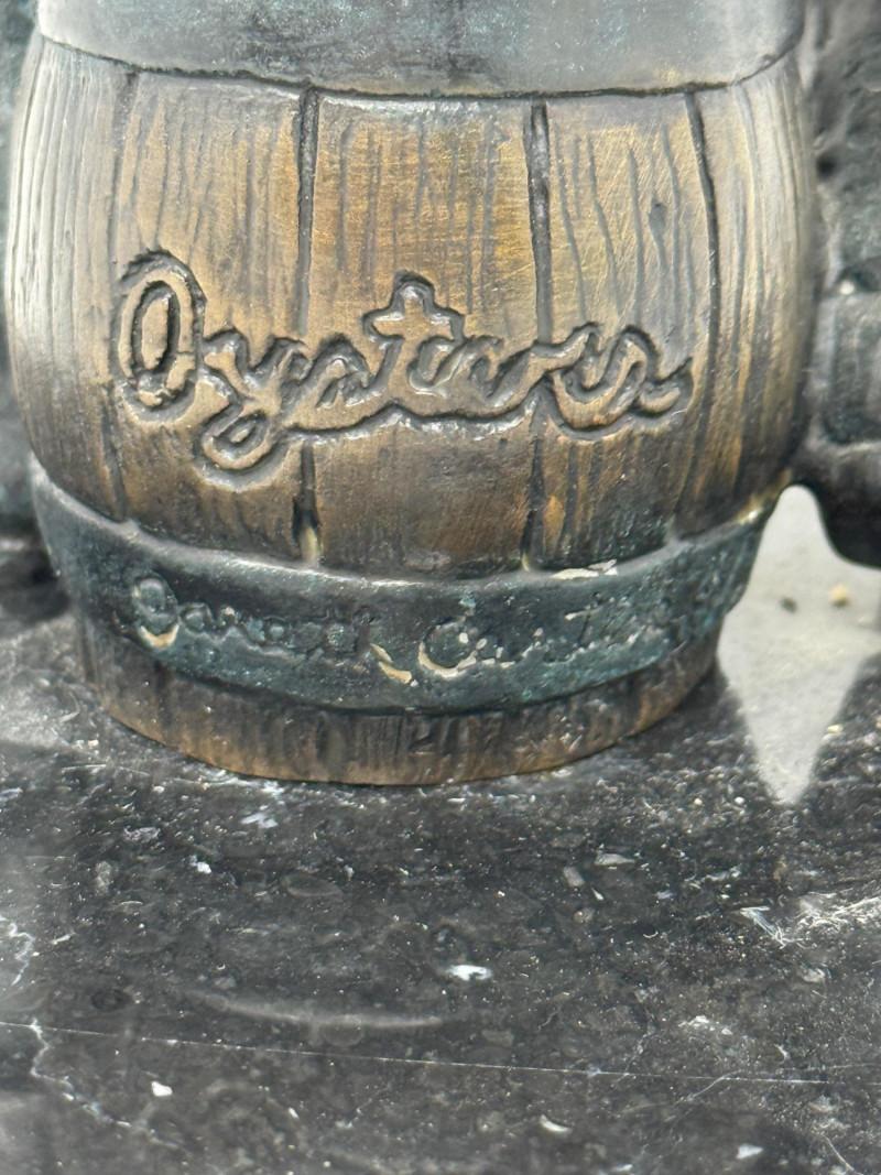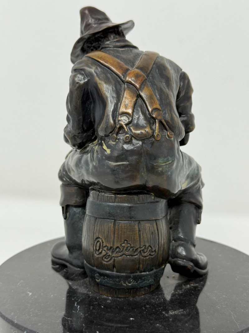 Cold cast bronze man on barrel shucking oysters on marble plinth. Signed Gareth Curtiss #61/250