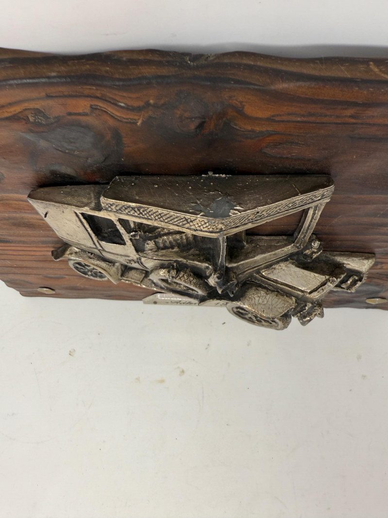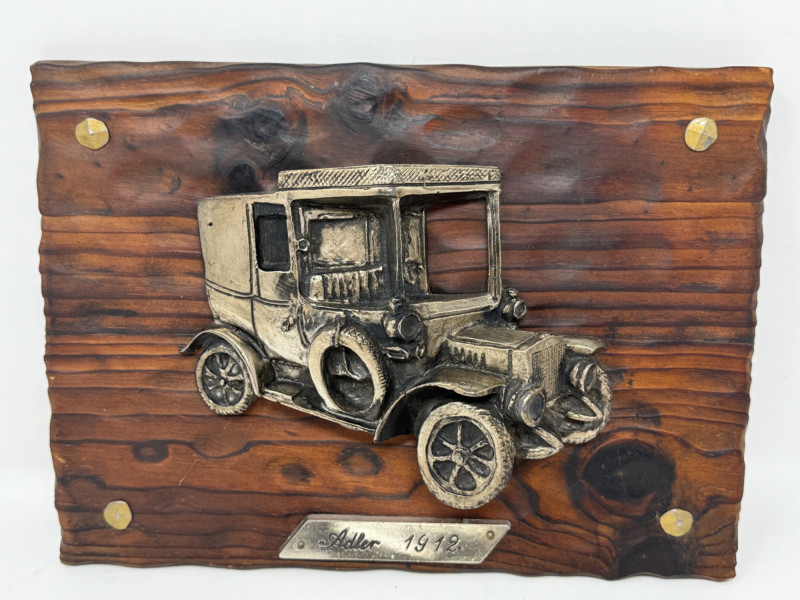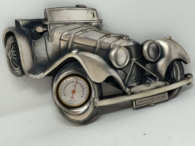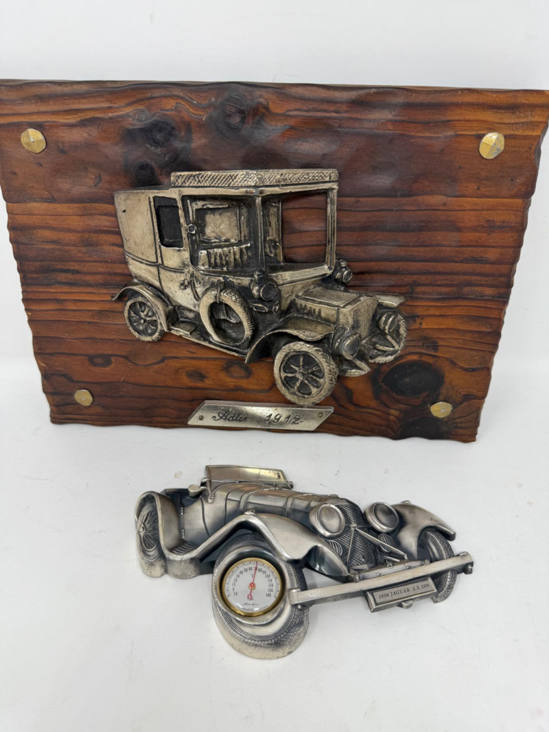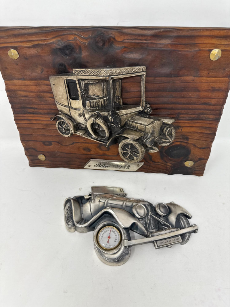 Tulip Brands Fancy Thermometer is a metal 1938 Jaguar SS100 with Three Star Thermometer. 8”x5” Adler 1912 3D composite car mounted on wood. Minor finish flaking on top. 12.5”x9.5”