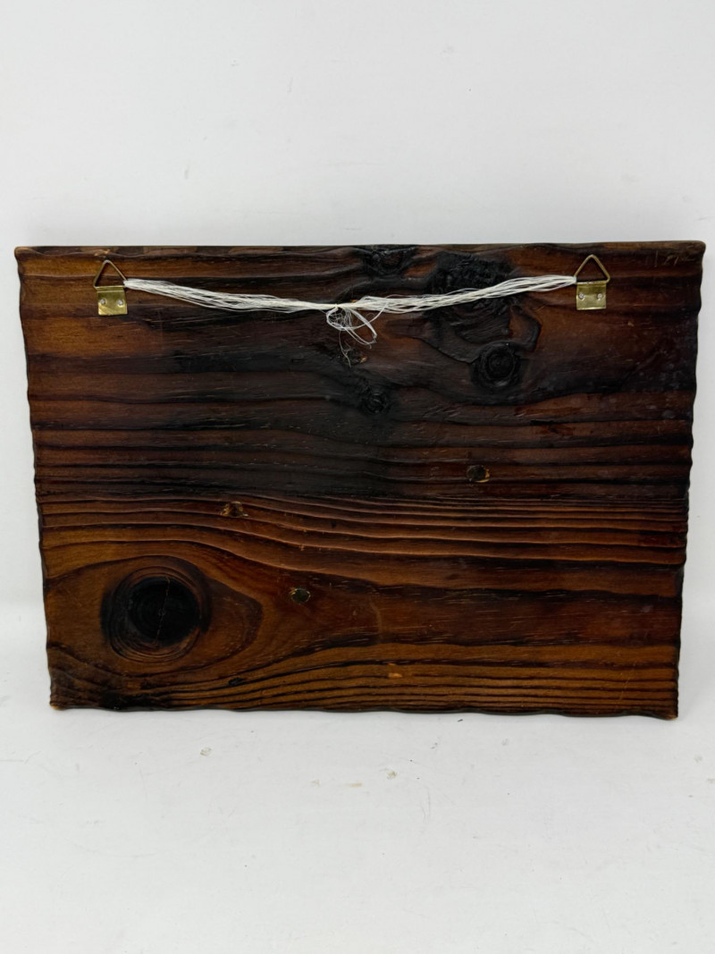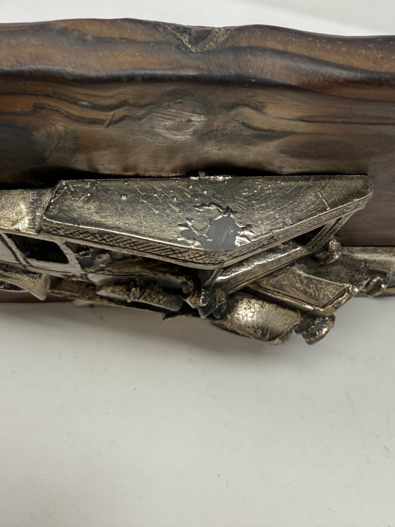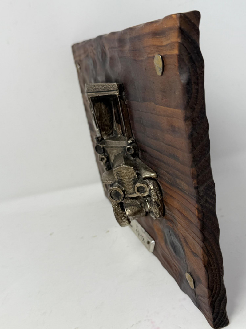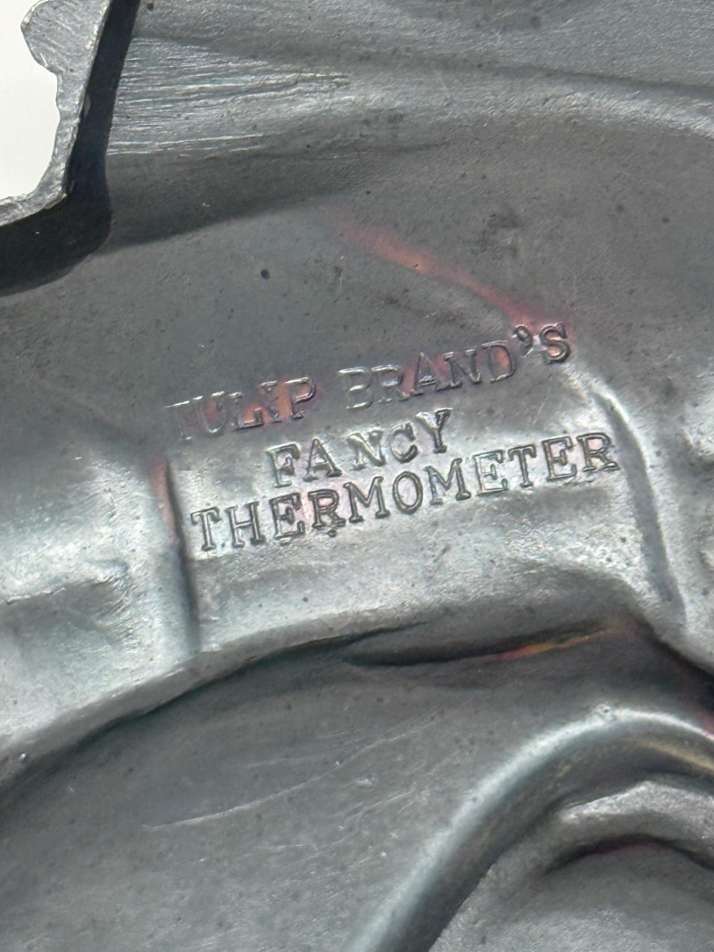 Tulip Brands Fancy Thermometer is a metal 1938 Jaguar SS100 with Three Star Thermometer. 8”x5” Adler 1912 3D composite car mounted on wood. Minor finish flaking on top. 12.5”x9.5”