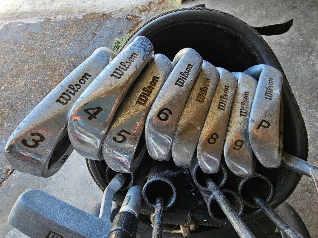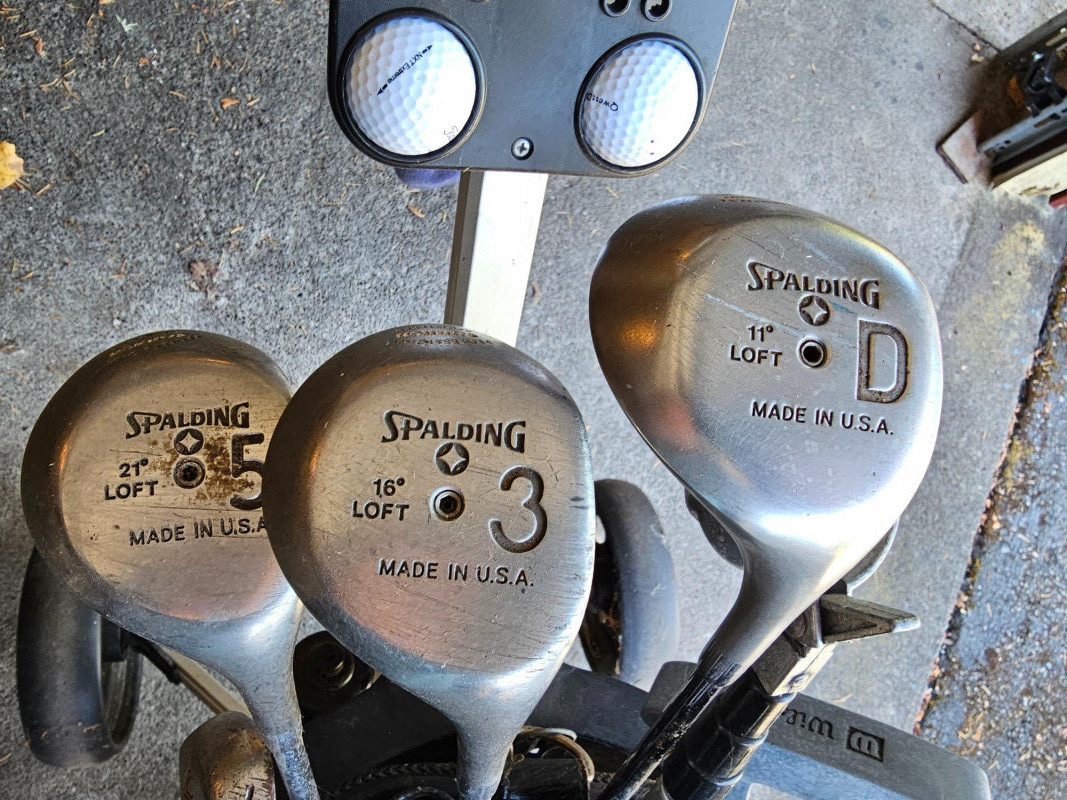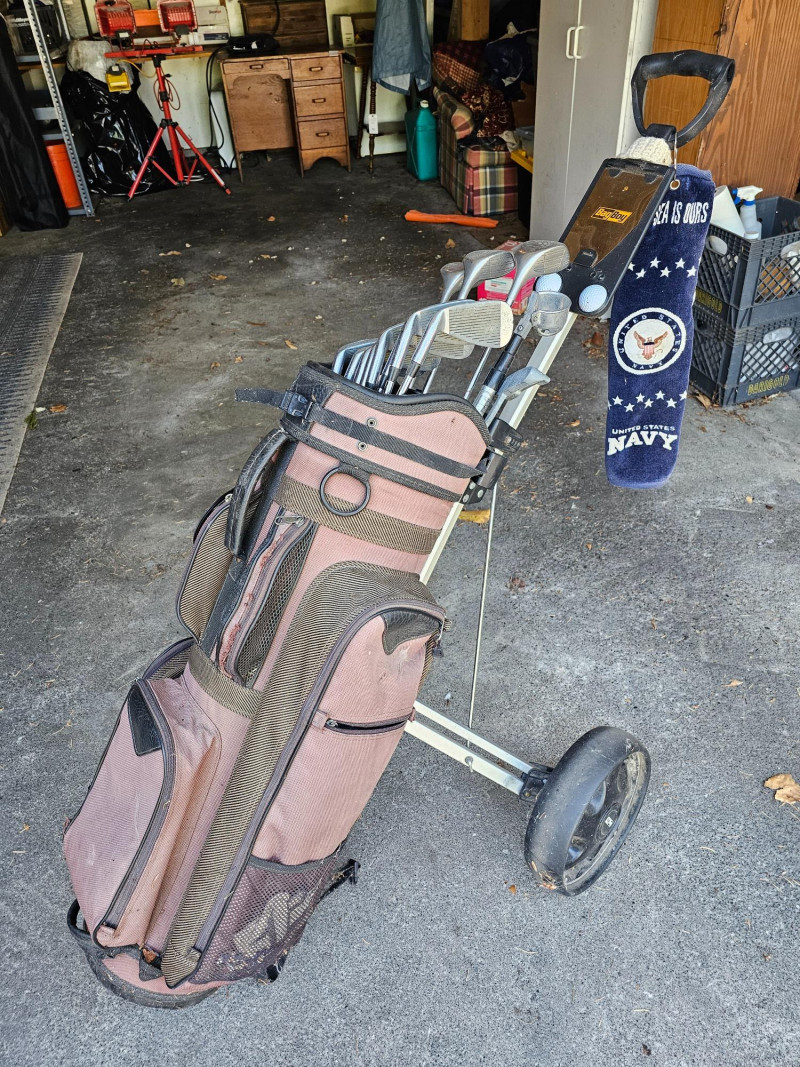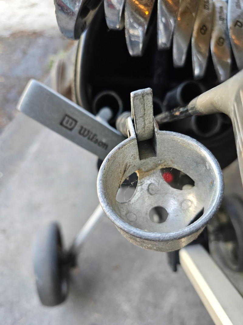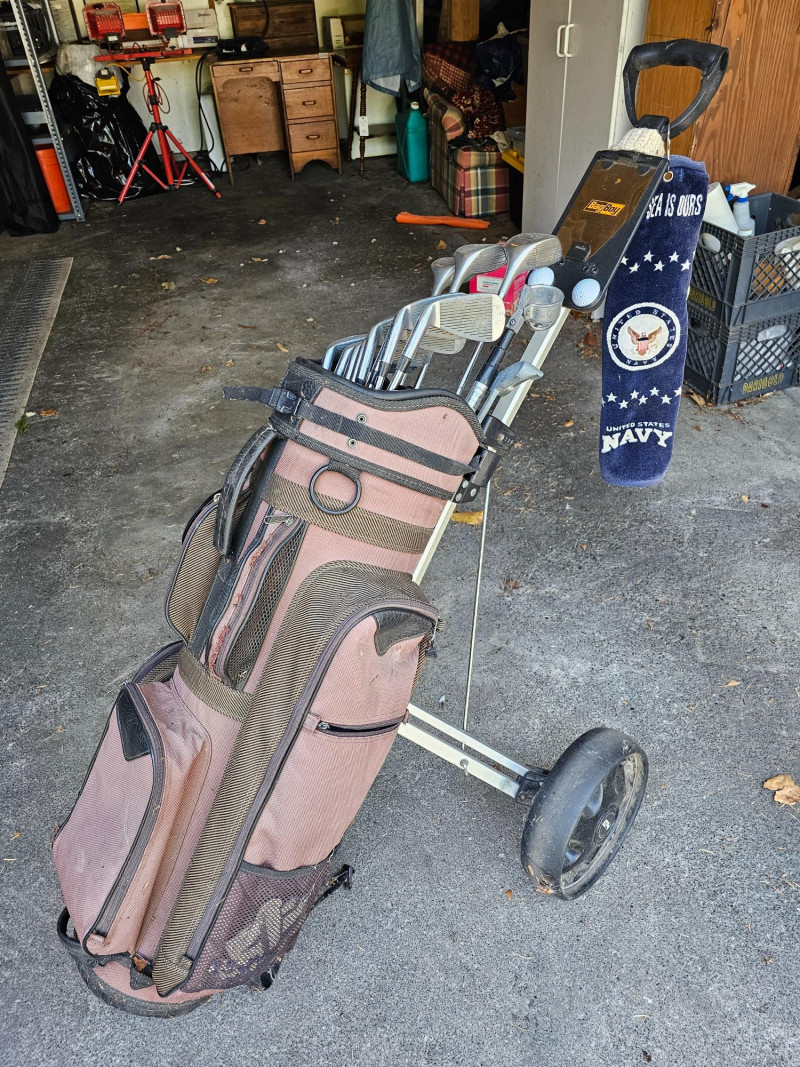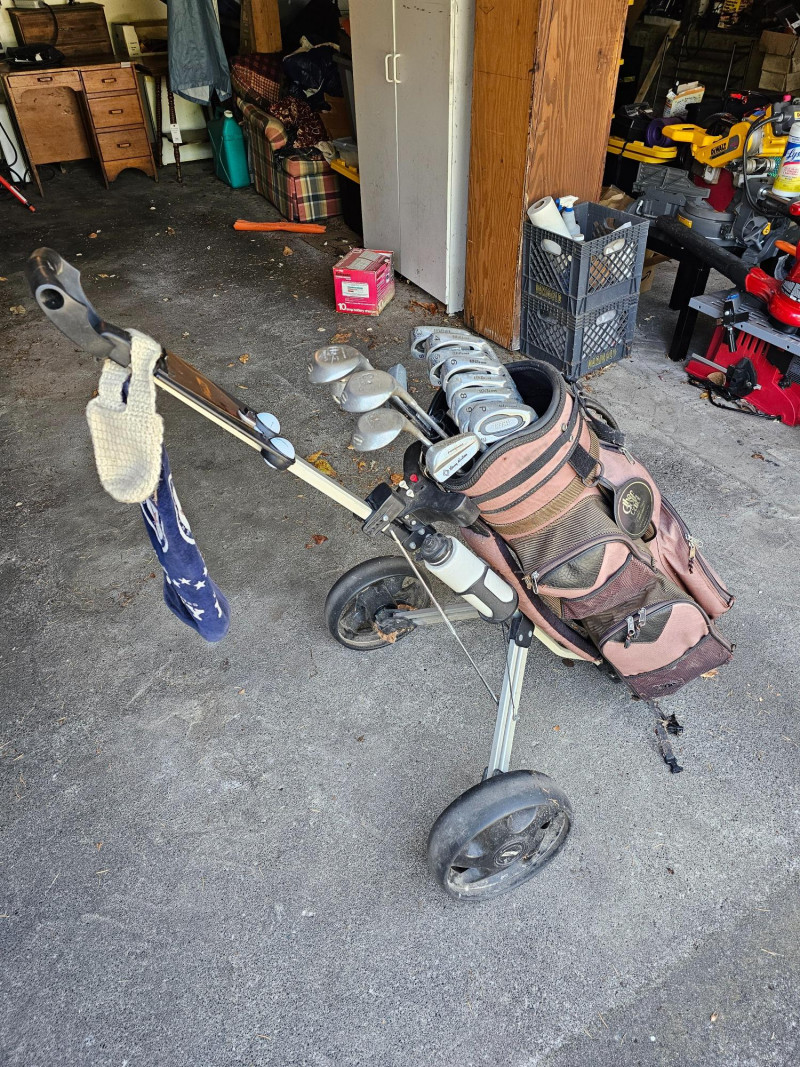 Complete Golfing Setup! Golf clubs, bag & Bag Boy Pull Cart Wilson Ultra Irons With Metal Shafts (PW, 9, 8, 7, 6 ,5 ,4 ,3) Spalding Cannon Woods With Metal Shafts (Driver, 3W, 5W) Wilson Putter Telescopic ball retrieval tool Large brown golf bag with tons of pockets & rainfly Bag Bog Pull Cart All equipment is in used condition Get ready to hit the links this summer!